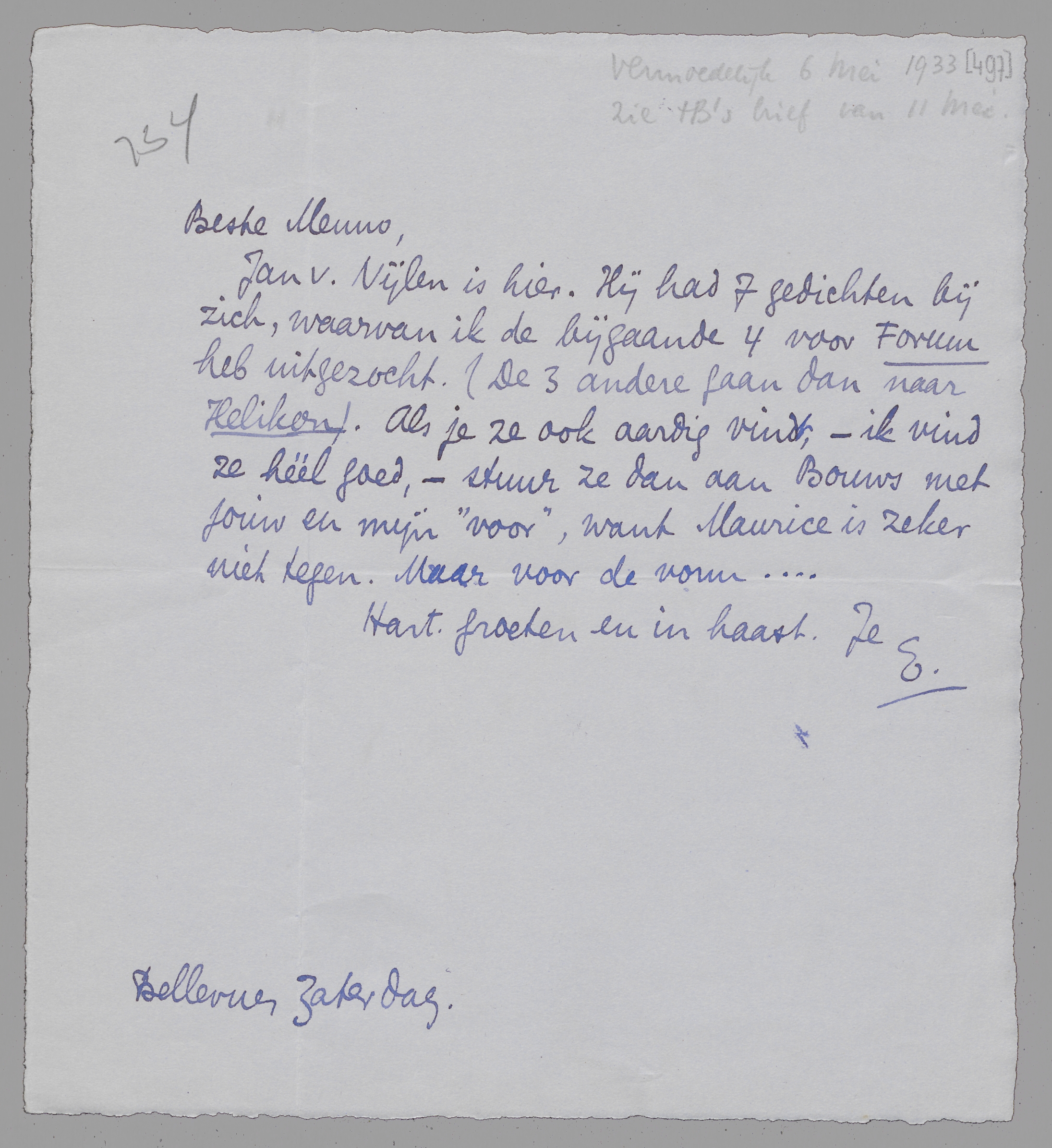 Jan v. Nijlen is hier. Hij had 7 gedichten bij zich, waarvan ik de bijgaande 4 voor Forum heb uitgezocht. (De 3 andere gaan dan naar Helikon). Als je ze ook aardig vindt, - ik vind ze héél goed, - stuur ze dan aan Bouws met jouw en mijn ‘voor’, want Maurice is zeker niet tegen. Maar voor de vorm...