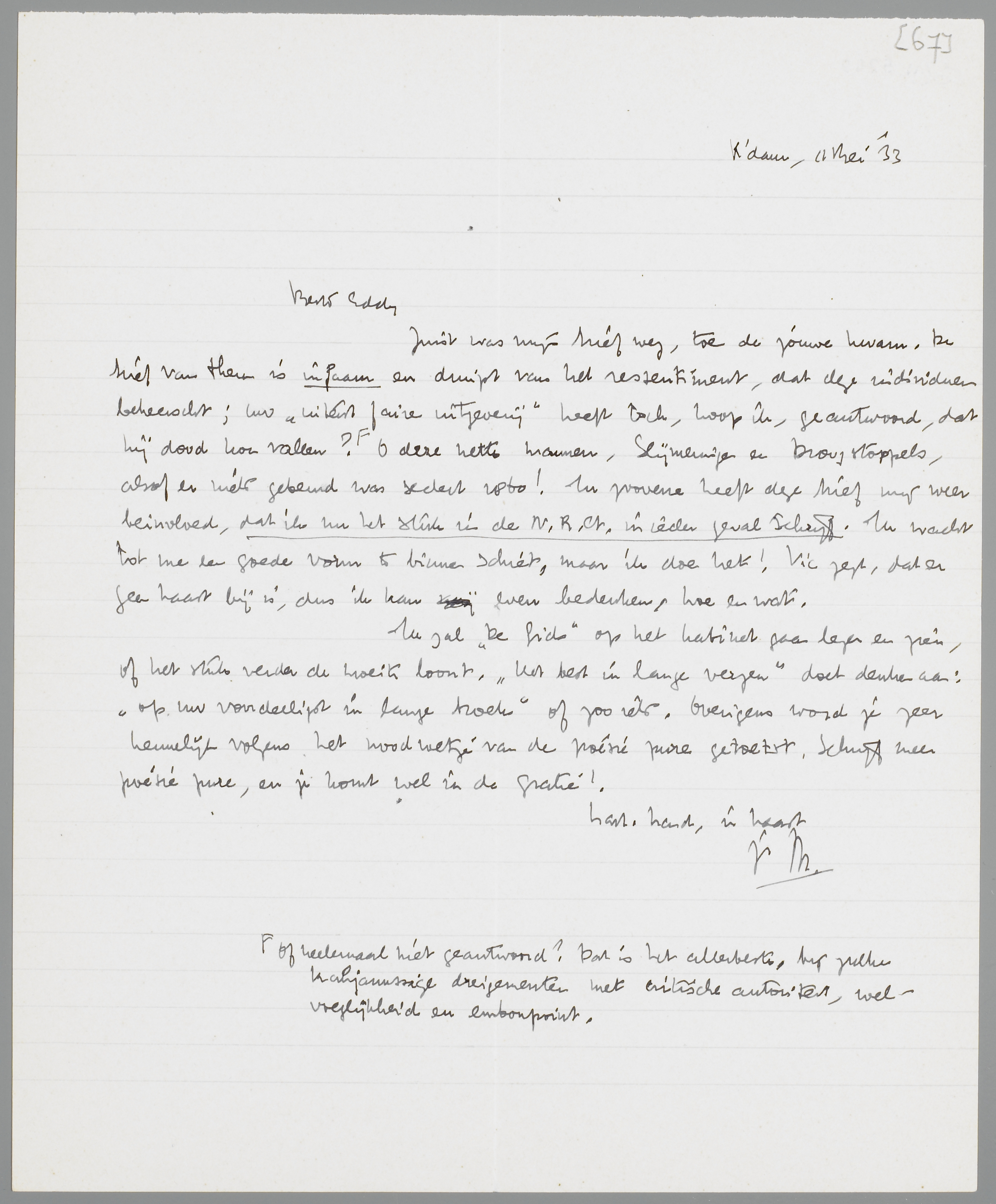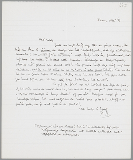 Juist was mijn brief weg, toen de jouwe kwam. De brief van Theun is infaam en druipt van het ressentiment, dat deze individuen beheerst; uw ‘uiterst faire uitgeverij’ heeft toch, hoop ik, geantwoord, dat hij dood kon vallen? Of heelemaal niet geantwoord?* O deze nette mannen, Slijmeringen en Droogstoppels, alsof er niets gebeurd was sedert 1860! In zooverre heeft deze brief mij weer beïnvloed, dat ik nu het stuk in de N.R.Ct. in ieder geval schrijf. Ik wacht tot me een goede vorm te binnen schiet, maar ik doe het! Vic zegt, dat er geen haast bij is, dus ik kan even bedenken, hoe en wat.