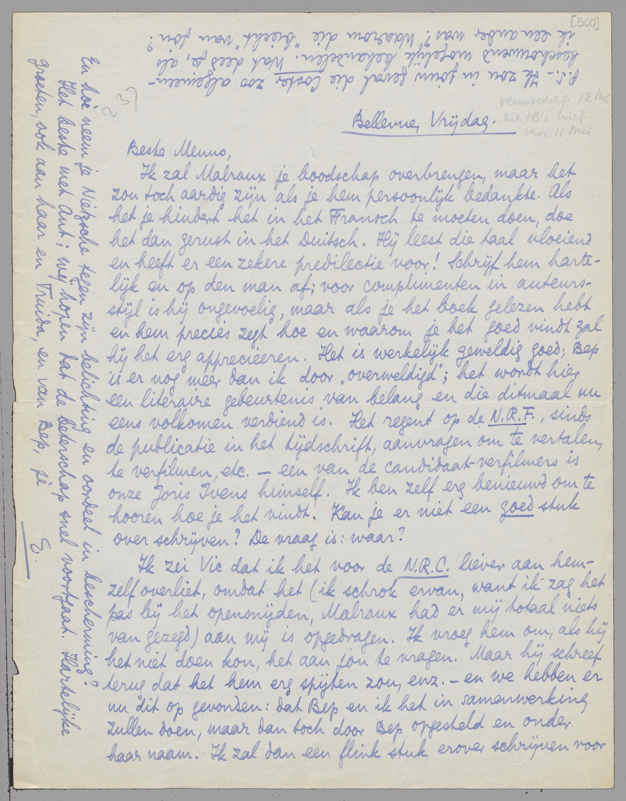 Ik zal Malraux je boodschap overbrengen, maar het zou toch aardig zijn als je hem persoonlijk bedankte. Als het je hindert het in het Fransch te moeten doen, doe het dan gerust in het Duitsch. Hij leest die taal vloeiend en heeft er een zekere predilectie voor! Schrijf hem hartelijk en op den man af; voor complimenten in auteursstijl is hij ongevoelig, maar als je het boek gelezen hebt en hem precies zegt hoe en waarom je het goed vindt zal hij het erg apprecieeren. Het is werkelijk geweldig goed; Bep is er nog meer dan ik door ‘overweldigd’; het wordt hier een literaire gebeurtenis van belang en die ditmaal nu eens volkomen verdiend is. Het regent op de N.R.F., sinds de publicatie in het tijdschrift, aanvragen om te vertalen, te verfilmen, etc. - een van de candidaat-verfilmers is onze Joris Ivens himself. Ik ben zelf erg benieuwd om te hooren hoe je het vindt. Kan je er niet een goed stuk over schrijven? De vraag is: waar?