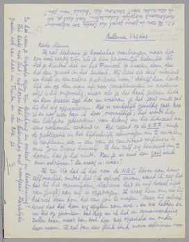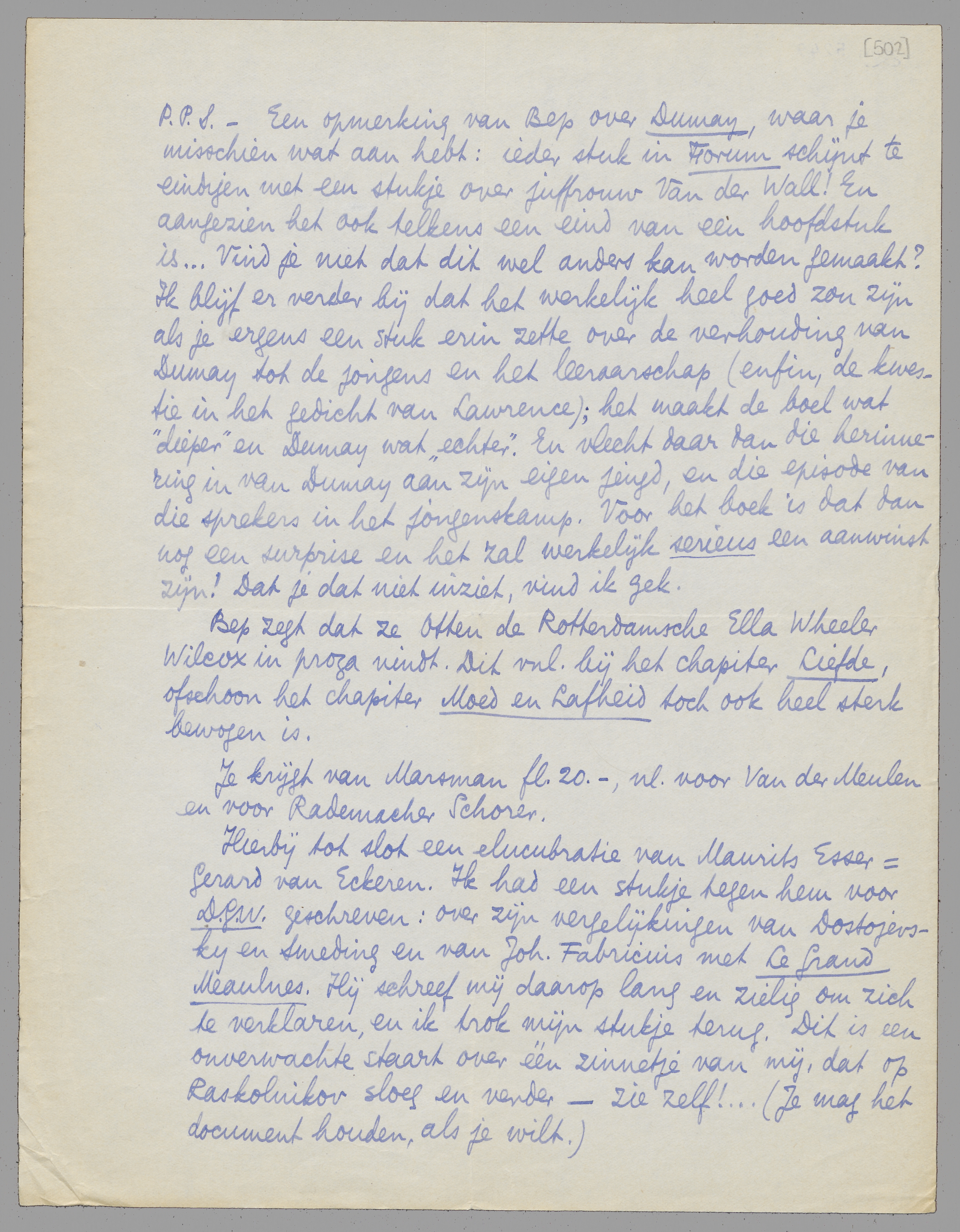 Hierbij tot slot een elucubratie van Maurits Esser = Gerard van Eckeren. Ik had een stukje tegen hem voor D.G.W. geschreven: over zijn vergelijkingen van Dostojevsky en Smeding en van Joh. Fabricius met Le Grand Meaulnes. Hij schreef mij daarop lang en zielig om zich te verklaren, en ik trok mijn stukje terug. Dit is een onverwachte staart over één zinnetje van mij, dat op Raskolnikov sloeg en verder - zie zelf!... (Je mag het document houden als je wilt.)