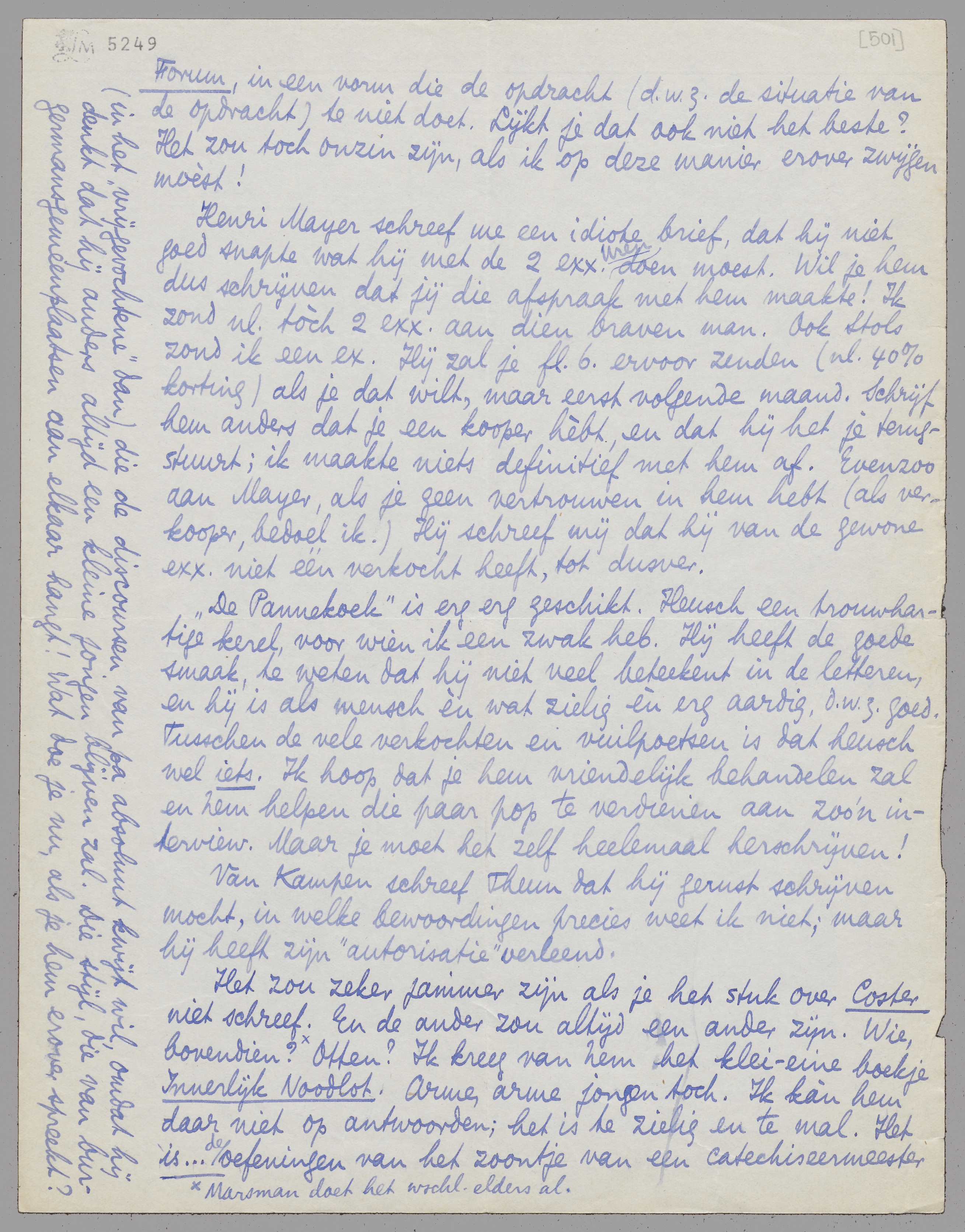 Henri Mayer schreef me een idiote brief, dat hij niet goed snapte wat hij met de 2 exx. Uren doen moest. Wil je hem dus schrijven dat jij die afspraak met hem maakte! Ik zond nl. tòch 2 exx. aan dien braven man. Ook Stols zond ik een ex. Hij zal je fl. 6. ervoor zenden (nl. 40% korting) als je dat wilt, maar eerst volgende maand. Schrijf hem anders dat je een kooper hèbt, en dat hij het je terugstuurt; ik maakte niets definitief met hem af. Evenzoo aan Mayer, als je geen vertrouwen in hem hebt (als verkooper, bedoel ik.) Hij schreef mij dat hij van de gewone exx. niet één verkocht heeft, tot dusver.