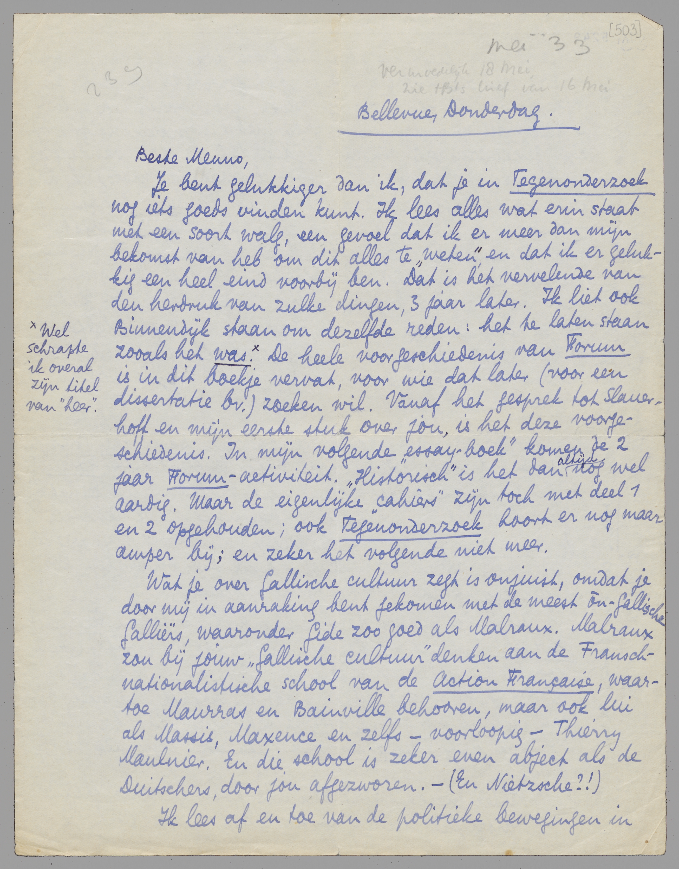 Je bent gelukkiger dan ik, dat je in Tegenonderzoek nog iets goeds vinden kunt. Ik lees alles wat erin staat met een soort walg, een gevoel dat ik er meer dan mijn bekomst van heb om dit alles te ‘weten’, en dat ik er gelukkig een heel eind voorbij ben. Dat is het vervelende van den herdruk van zulke dingen, 3 jaar later. Ik liet ook Binnendijk staan om dezelfde reden: het te laten staan zooals het was. Wel schrapte ik overal zijn titel van ‘heer’. De heele voorgeschiedenis van Forum is in dit boekje vervat, voor wie dat later (voor een dissertatie bv.) zoeken wil. Vanaf het gesprek tot Slauerhoff en mijn eerste stuk over jou, is het deze voorgeschiedenis. In mijn volgende ‘essay-boek’ komen de 2 jaar Forum-activiteit. ‘Historisch’ is het dan altijd nog wel aardig. Maar de eigenlijke ‘cahiers’ zijn toch met deel 1 en 2 opgehouden; ook Tegenonderzoek hoort er nog maar amper bij; en zeker het volgende niet meer.