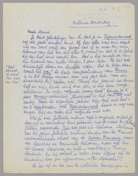 Ik lees af en toe van de politieke bewegingen in Holland; het geeft me soms lust om daar te komen wonen en mij met alle energie ook ‘in het gewoel te werpen’. Die gaga-idioot van een Jacques Bloem loopt, schijnt het, in de gelederen van ir. Mussert en met een nazi-insigne op zijn genevermaag. Ik mag lijden dat ze hem vandaag of morgen een blauw oog slaan voor die treurige moed; ik heb lust om hem straal te negeeren als ik hem daarmee zie. - Verder is er in Den Haag, meen ik, een bond opgericht van anti-fascistische neutralen, waarbij echter ‘nadrukkelijk uitgesloten’ zijn: ‘zij die naar een dictatuur streven of naar de anarchie drijven’. M.a.w. een beroep op het solied-liberale, Hollandsche, tevreden en rechtschapen, alleen op een zekere ‘vrijheidsbeperking’ reageerend, burgerschapendom. Zou je er niet een stukje aan wijden in het Panopticum?