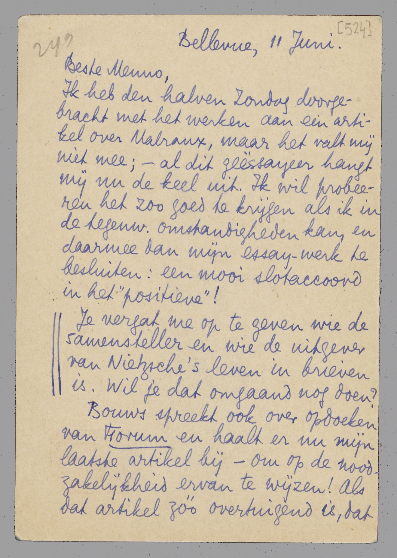 Ik heb den halven Zondag doorgebracht met het werken aan een artikel over Malraux, maar het valt mij niet mee; - al dit geëssayeer hangt mij nu de keel uit. Ik wil probeeren het zoo goed te krijgen als ik in de tegenw. omstandigheden kan, en daarmee dan mijn essay-werk te besluiten: een mooi slotaccoord in het ‘positieve’!