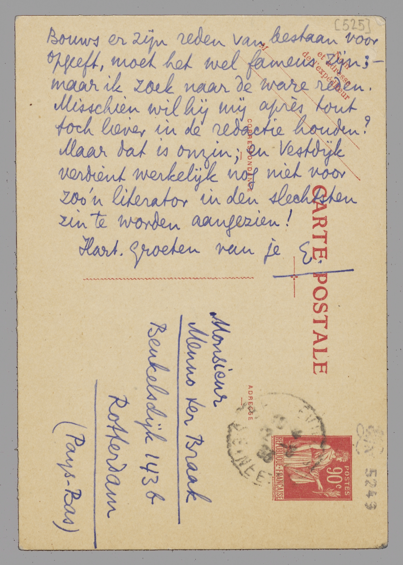 Bouws spreekt ook over opdoeken van Forum en haalt er nu mijn laatste artikel bij - om op de noodzakelijkheid ervan te wijzen! Als dat artikel zóó overtuigend is, dat Bouws er zijn reden van bestaan voor opgeeft, moet het wel fameus zijn; - maar ik zoek naar de ware reden. Misschien wil hij mij après tout toch liever in de redactie houden? Maar dat is onzin; en Vestdijk verdient werkelijk nog niet voor zoo'n literator in den slechtsten zin te worden aangezien!