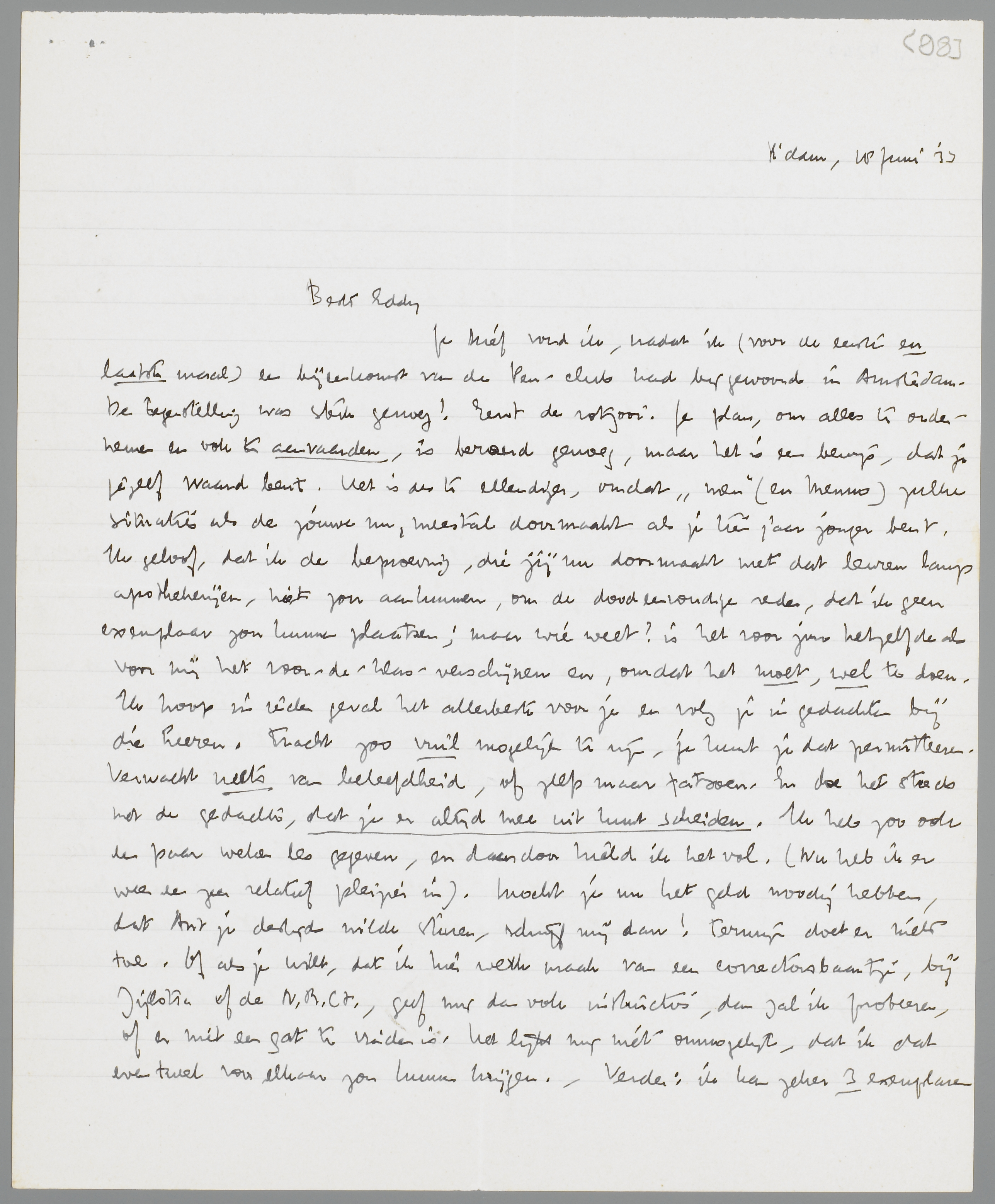 De Pen-club was liederlijk. Culmineert in een dikke rollade, geheeten Albertine Draayer-de Haas. Verder was er de heer Boutens, die het had over ‘anti semistische’ richtingen en over ‘die meneer Göbbeler’. Vic heeft een rede gehouden, het individu Westerman heeft zich verdedigd. Ik had tegen Westerman willen spreken, maar het milieu sloeg mij met stomheid. Om rechts van de smartelijke mond van Ina Bakker en links van Gerard van Hulzen iets te beweren, is physiek onmogelijk. Pom was er natuurlijk, en coquetteerde. Het eenige werkelijke vermaak was dr. Hein Boeken, die kindsch is en telkens voor de bestuurstafel ging staan om zijn broek op te halen, te grijnzen en dan weer te gaan zitten. Ook was er een magere dame, die ‘de politiek geheel buiten de Pen-club wilde houden’. Enz. enz. - De eenige aangename factor van deze visite aan Amsterdam was mijn ontmoeting met Binnendijk! Ik had hem niet weer gesproken na de ‘breuk’, behalve één minuut bij de promotie van Wim. Wij bleken nu nog vriendschappelijk te kunnen praten, zij het dan niet over de poëzie en E. du Perron, maar wel over ‘het leven’. Hij is, geloof ik, absoluut niet veranderd op essentieele punten, maar het aardige aan hem is, dat hij nog zit met dezelfde problemen van voor tien jaar. Dàt hij zit, vind ik op zichzelf sympathiek, en ik had het, eerlijk gezegd, niet gedacht; hij is veel minder frik geworden dan men mij had verteld. Misschien dat wij nu op een ander plan dan vroeger (want ik voel mij intellectueel helaas zijn meerdere) de relatie kunnen voortzetten. Hij heeft er behoefte aan, kan ik merken, en ik blijf hem een aardige kerel vinden. Au fond is hij van hetzelfde type als Marsman: oneindig veel aardiger als mensch dan op het papier, dat deze wezens schijnt te verlammen, of zoo hoog te verheffen, dat zij engelen worden. - Maar een volgend maal zal ik een gesprek over jou entameeren en probeeren, of hij daar tegen kan. Misschien wordt dat nog een interessante krachtproef.