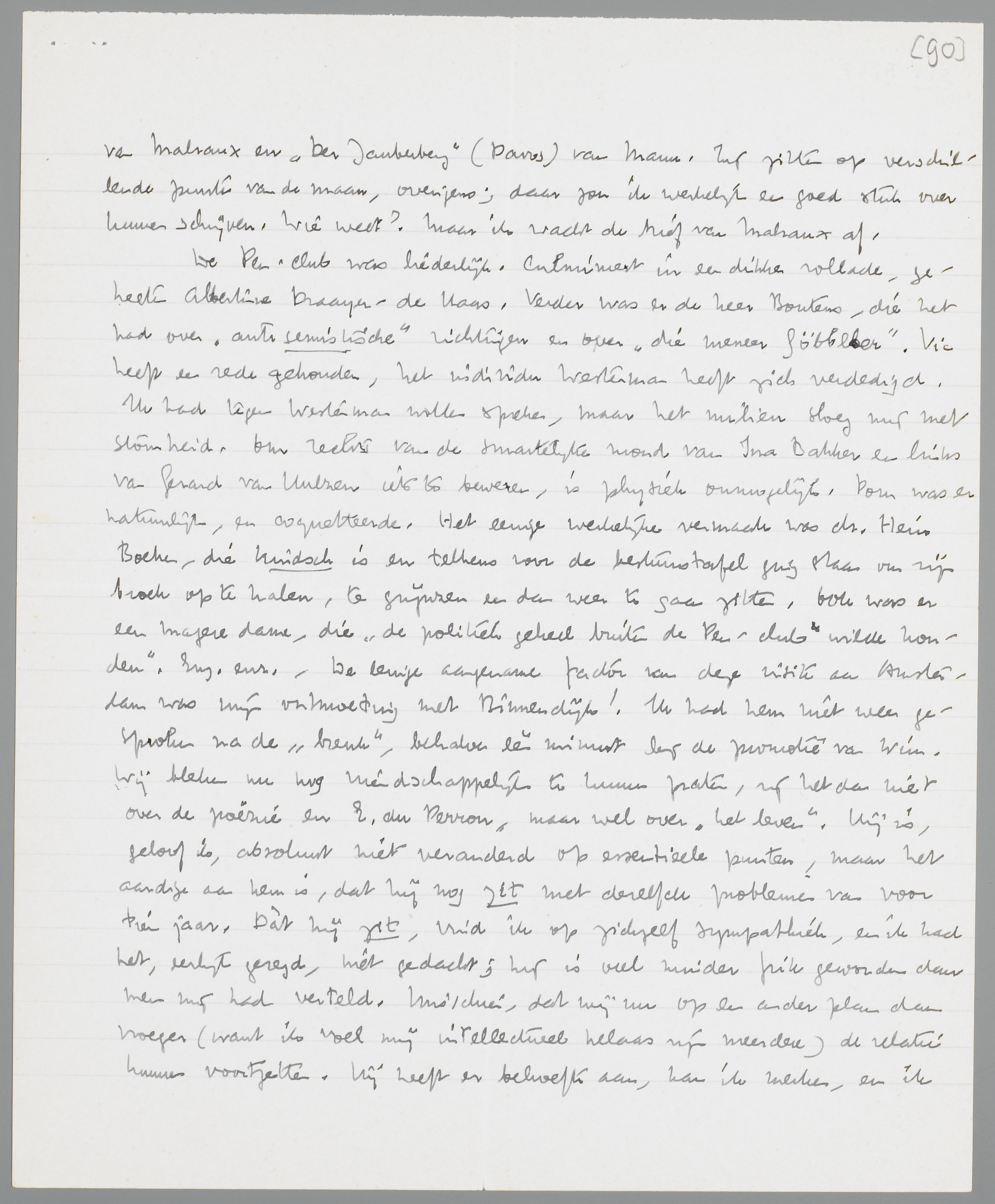 Je omschrijving van Greshoff lijkt me heel juist. Daarom houdt men hem hier voor karakterloos; zijn intellectueele capaciteiten schieten tekort voor zijn ‘hart’, en dat ‘hart’ ziet Donker c.s. niet. Hij reageerde op Malraux al dadelijk anders, toen hij merkte, dat ik het eigenlijk uitstekend vond; m.a.w. zijn ‘hart’ ging dadelijk overstag, en nu volgen waarschijnlijk binnenkort ook de intellectueele kantjes wel. Gr. is een bewijs voor mijn boek: dat de intelligentie niets is dan de verlenging van een ‘hart’, en dat men dus ook (als Gr.) nooit aan die verlenging toekomt, als de vrienden het niet voor doen. Excuseer de domme uitdrukkingswijze, je begrijpt me wel. Overigens zou ik de formule: dat bij Malraux alles ‘op de maan’ gebeurt, niet slecht vinden, als de ‘maan’ dan maar zeer hoog gewaardeerd werd. Dat is ook de overeenkomst van Shanghaï van Malraux en Der Zauberberg (Davos) van Mann. Zij zitten op verschillende punten van de maan, overigens; daar zou ik werkelijk een goed stuk over kunnen schrijven. Wie weet? Maar ik wacht de brief van Malraux af.