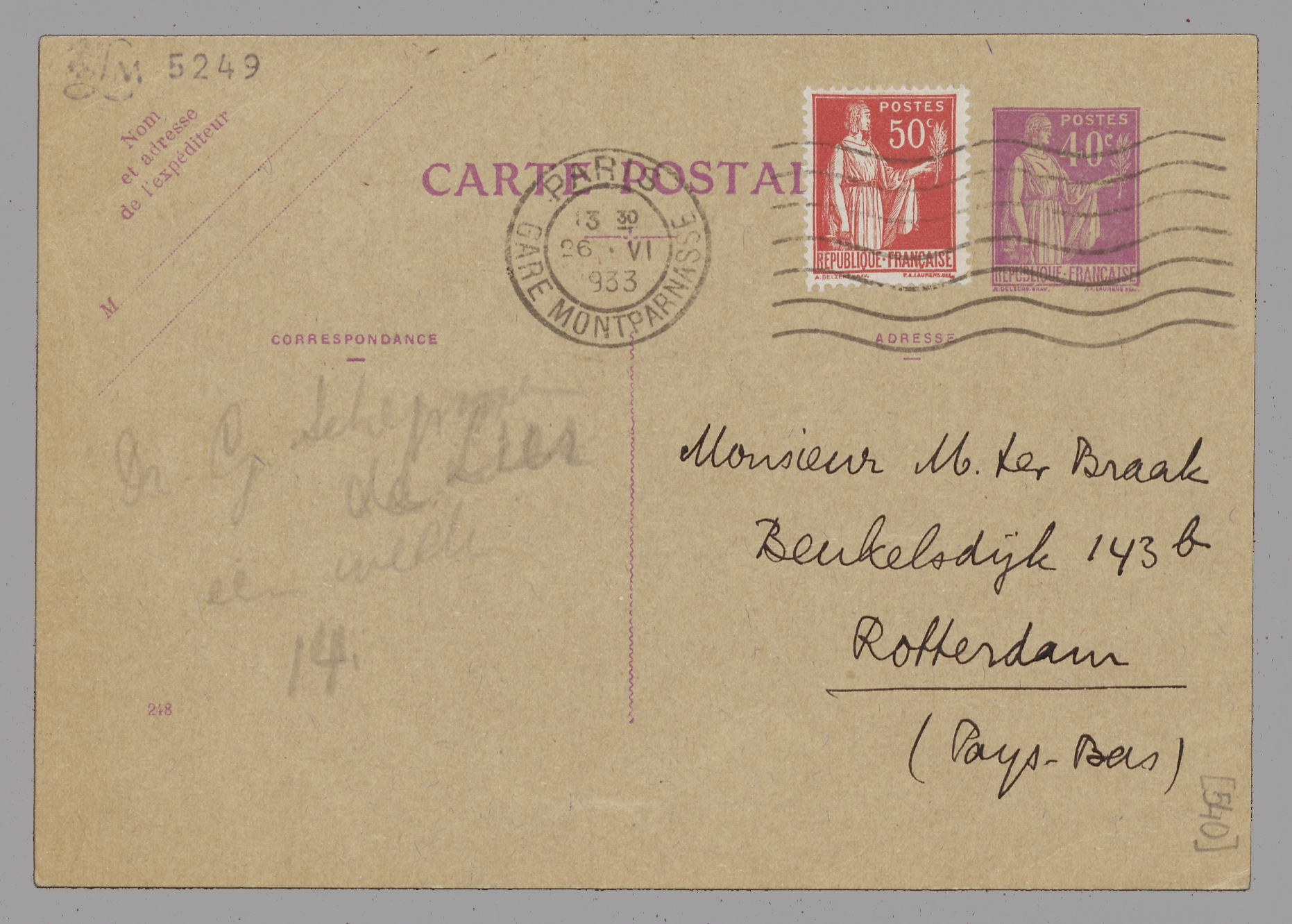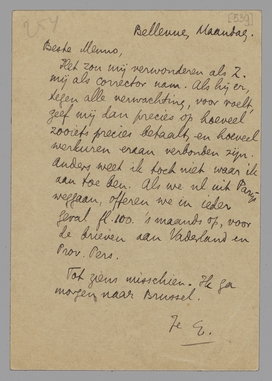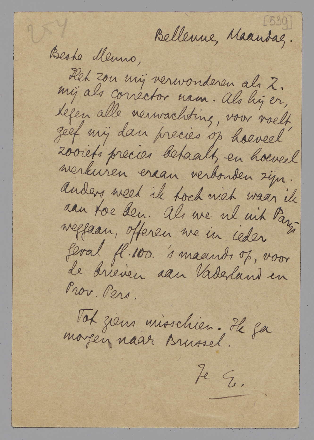 Het zou mij verwonderen als Z. mij als corrector nam. Als hij er, tegen alle verwachting, voor voelt, geef mij dan precies op hoeveel zooiets precies betaalt, en hoeveel werkuren eraan verbonden zijn. Anders weet ik toch niet waar ik aan toe ben. Als wij nl. uit Parijs weggaan, offeren we in ieder geval fl. 100. 's maands op, voor de brieven aan Vaderland en Prov. Pers.