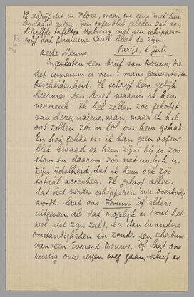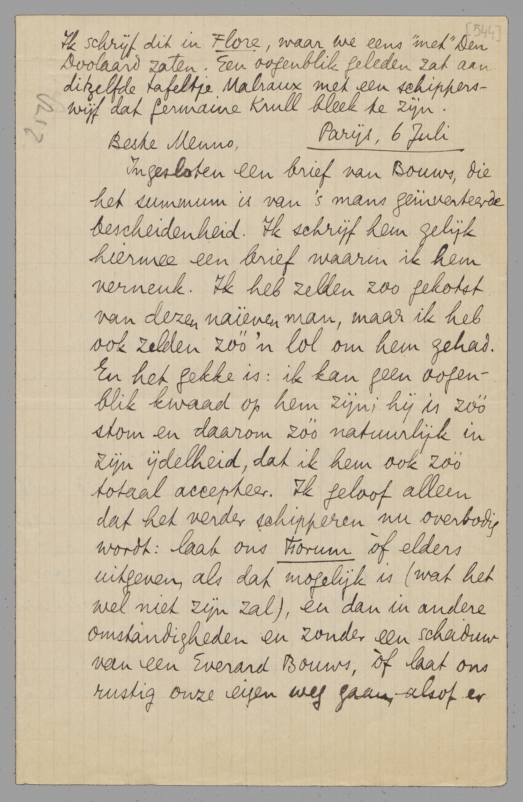 Ingesloten een brief van Bouws, die het summum is van 's mans geïnverteerde bescheidenheid. Ik schrijf hem gelijk hiermee een brief waarin ik hem verneuk. Ik heb zelden zoo gekotst van dezen naïeven man, maar ik heb ook zelden zóó'n lol om hem gehad. En het gekke is: ik kan geen oogenblik kwaad op hem zijn; hij is zóó stom en daarom zóó natuurlijk in zijn ijdelheid, dat ik hem ook zóó totaal accepteer. Ik geloof alleen dat het verder schipperen nu overbodig wordt: laat ons Forum òf elders uitgeven, als dat mogelijk is (wat het wel niet zal zijn), en dan in andere omstandigheden en zonder een schaduw van een Everard Bouws, òf laat ons rustig onze eigen weg gaan, alsof er nooit een Forum bestaan had.