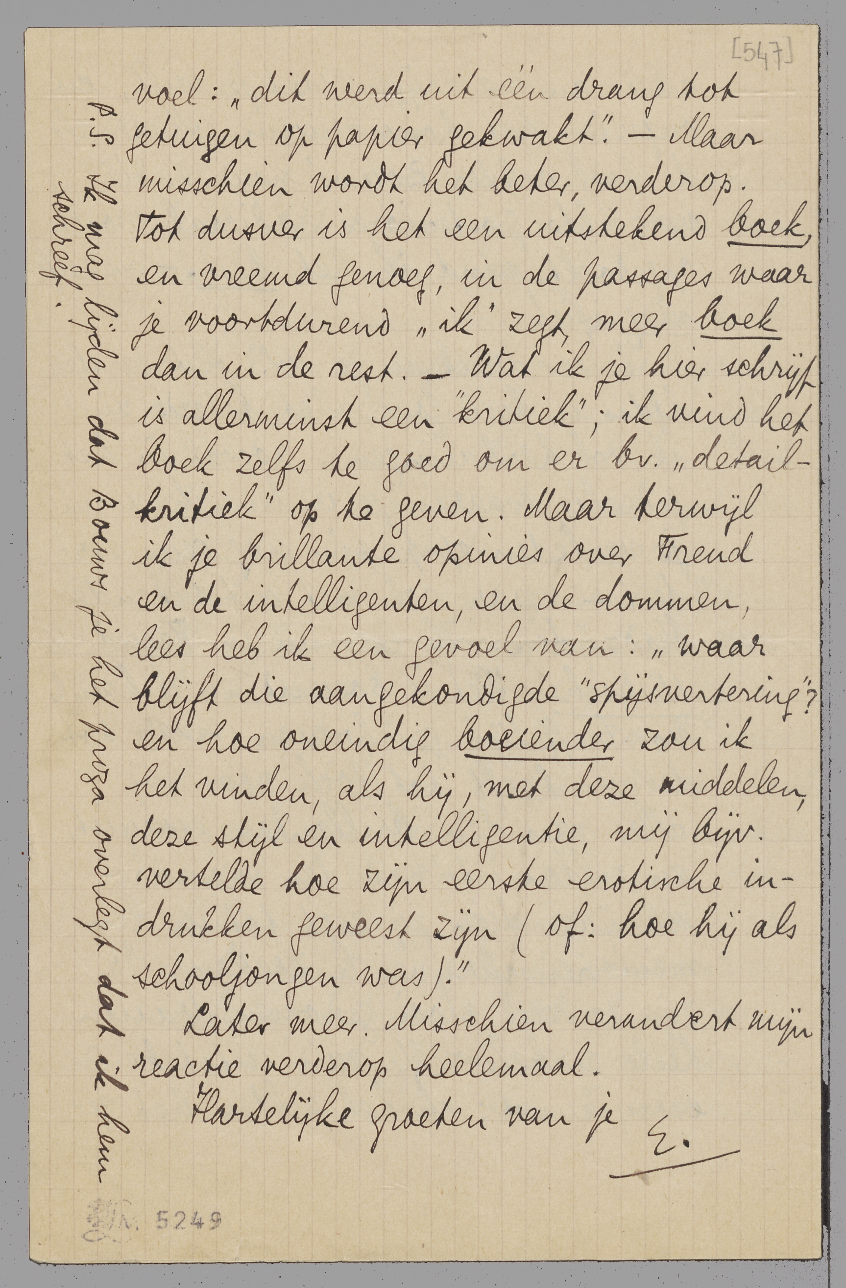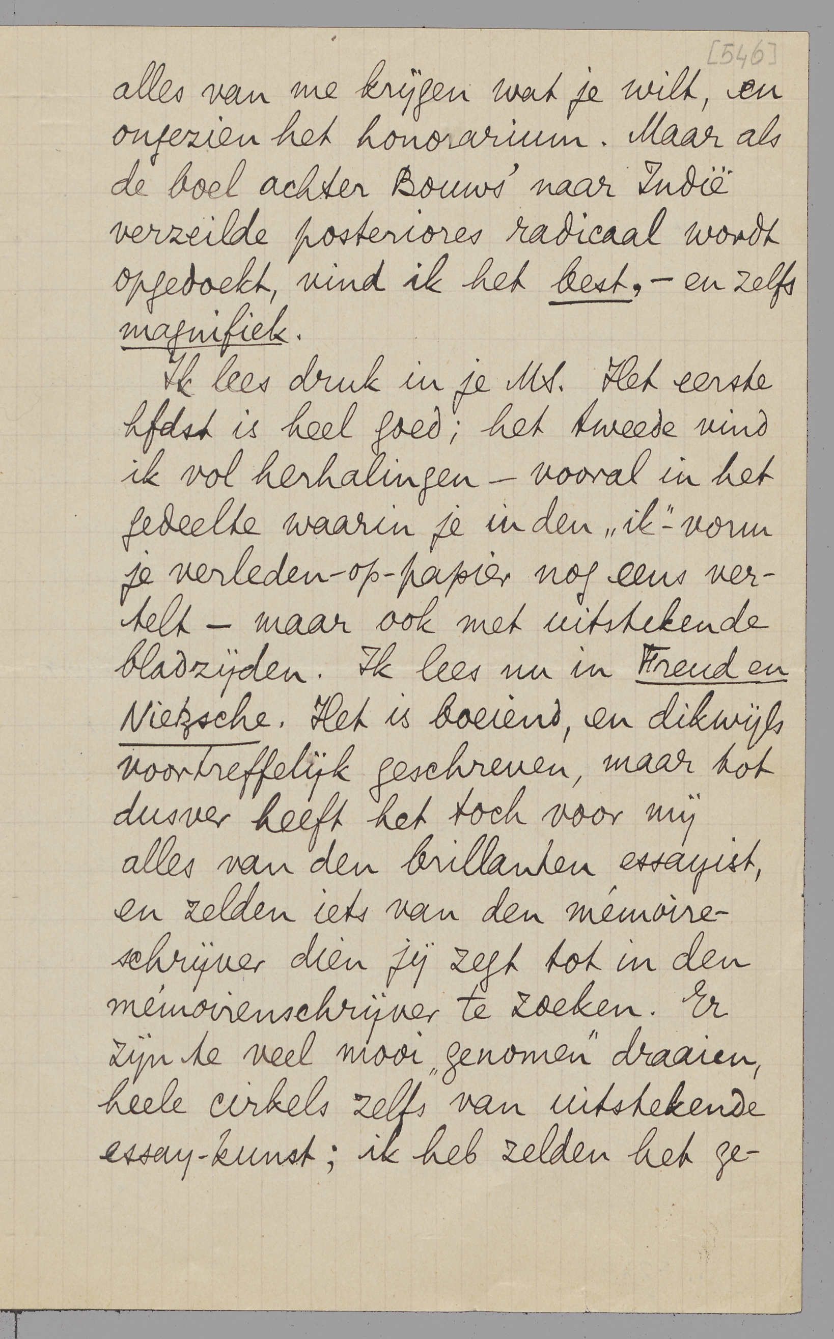 Ik lees druk in je MS. Het eerste hfdst. is heel goed; het tweede vind ik vol herhalingen - vooral in het gedeelte waarin je in den ‘ik’-vorm je verleden-op-papier nog eens vertelt - maar ook met uitstekende bladzijden. Ik lees nu in Freud en Nietzsche. Het is boeiend, en dikwijls voortreffelijk geschreven, maar tot dusver heeft het toch voor mij alles van den brillanten essayist, en zelden iets van den mémoire-schrijver dien jij zegt tot in den mémoiren-schrijver te zoeken. Er zijn te veel mooi ‘genomen’ draaien, heele cirkels zelfs van uitstekende essay-kunst; ik heb zelden het gevoel: ‘dit werd uit één drang tot getuigen op papier gekwakt’. - Maar misschien wordt het beter, verderop. Tot dusver is het een uitstekend boek, en vreemd genoeg, in de passages waar je voortdurend ‘ik’ zegt, meer boek dan in de rest. - Wat ik je hier schrijf is allerminst een ‘kritiek’; ik vind het boek zelfs te goed om er bv. ‘detail-kritiek’ op te geven. Maar terwijl ik je brillante opinies over Freud en de intelligenten, en de dommen, lees heb ik een gevoel van: ‘waar blijft die aangekondigde “spijsvertering”? en hoe oneindig boeiender zou ik het vinden, als hij, met deze middelen, deze stijl en intelligentie, mij bijv. vertelde hoe zijn eerste erotische indrukken geweest zijn (of: hoe hij als schooljongen was).’