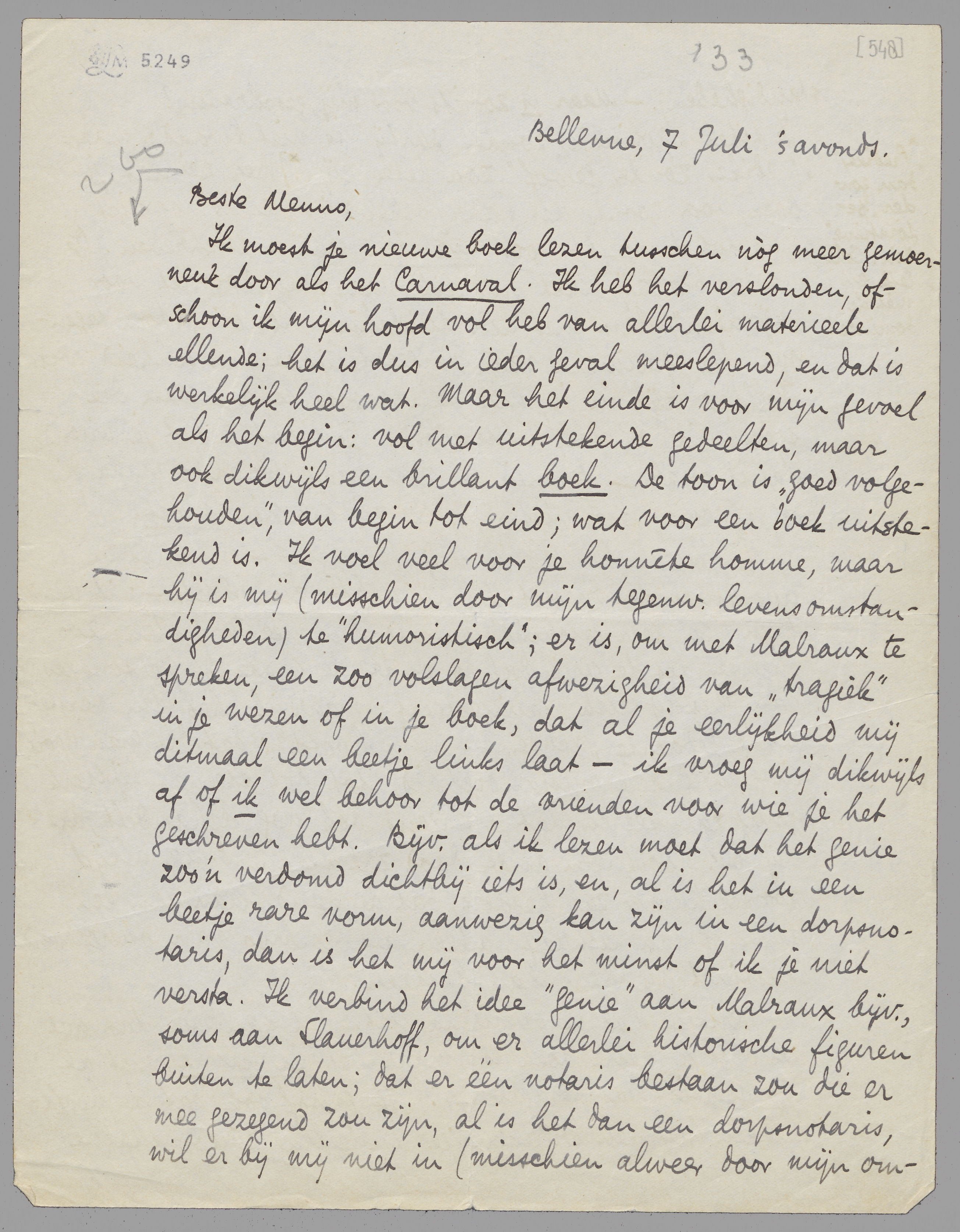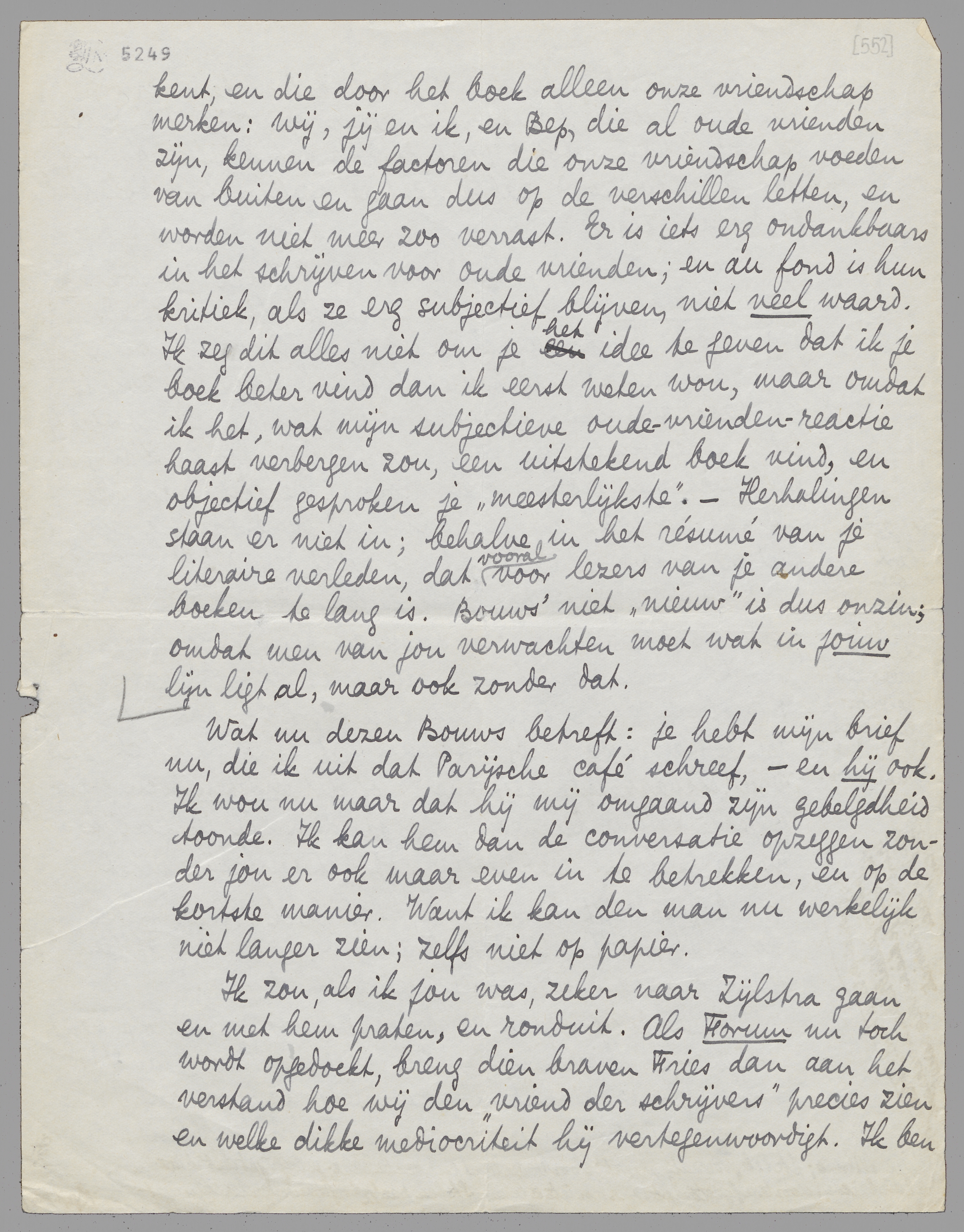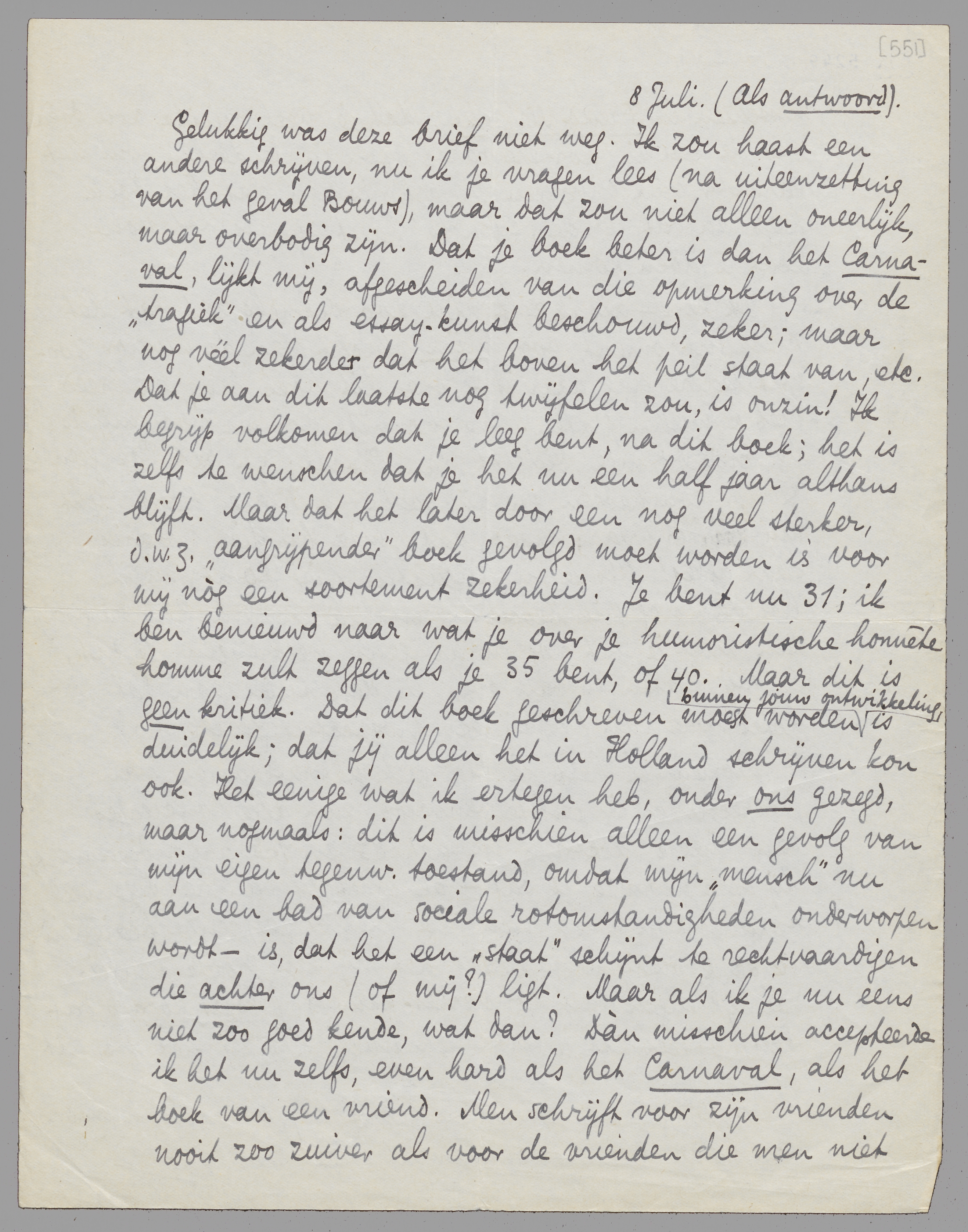 Gelukkig was deze brief niet weg. Ik zou haast een andere schrijven, nu ik je vragen lees (na uiteenzetting van het geval Bouws), maar dat zou niet alleen oneerlijk, maar overbodig zijn. Dat je boek beter is dan het Carnaval, lijkt mij, afgescheiden van die opmerking over de ‘tragiek’ en als essay-kunst beschouwd, zeker; maar nog véél zekerder dat het boven het peil staat van, etc. Dat je aan dit laatste nog twijfelen zou, is onzin! Ik begrijp volkomen dat je leeg bent, na dit boek; het is zelfs te wenschen dat je het nu een half jaar althans blijft. Maar dat het later door een nog veel sterker, d.w.z. ‘aangrijpender’ boek gevolgd moet worden is voor mij nòg een soortement zekerheid. Je bent nu 31; ik ben benieuwd naar wat je over je humoristische honnête homme zult zeggen als je 35 bent, of 40. Maar dit is geen kritiek. Dat dit boek geschreven moest worden binnen jouw ontwikkeling, is duidelijk; dat jij alleen het in Holland schrijven kon ook. Het eenige wat ik er tegen heb, onder ons gezegd, maar nogmaals: dit is misschien alleen een gevolg van mijn eigen tegenw. toestand, omdat mijn ‘mensch’ nu aan een bad van sociale rotomstandigheden onderworpen wordt - is, dat het een ‘staat’ schijnt te rechtvaardigen die achter ons (of mij?) ligt. Maar als ik je nu eens niet zoo goed kende, wat dan? Dàn misschien accepteerde ik het nu zelfs, even hard als het Carnaval, als het boek van een vriend. Men schrijft voor zijn vrienden nooit zoo zuiver als voor de vrienden die men niet kent, en die door het boek alleen onze vriendschap merken: wij, jij en ik, en Bep, die al oude vrienden zijn, kennen de factoren die onze vriendschap voeden van buiten en gaan dus op de verschillen letten, en worden niet meer zoo verrast. Er is iets erg ondankbaars in het schrijven voor oude vrienden; en au fond is hun kritiek, als ze erg subjectief blijven, niet veel waard. Ik zeg dit alles niet om je het idee te geven dat ik je boek beter vind dan ik eerst weten wou, maar omdat ik het, wat mijn subjectieve oude-vrienden-reactie haast verbergen zou, een uitstekend boek vind, en objectief gesproken je ‘meesterlijkste’. - Herhalingen staan er niet in; behalve in het résumé van je literaire verleden, dat vooral voor lezers van je andere boeken te lang is. Bouws' niet ‘nieuw’ is dus onzin; omdat men van jou verwachten moet wat in jouw lijn ligt al, maar ook zonder dat.