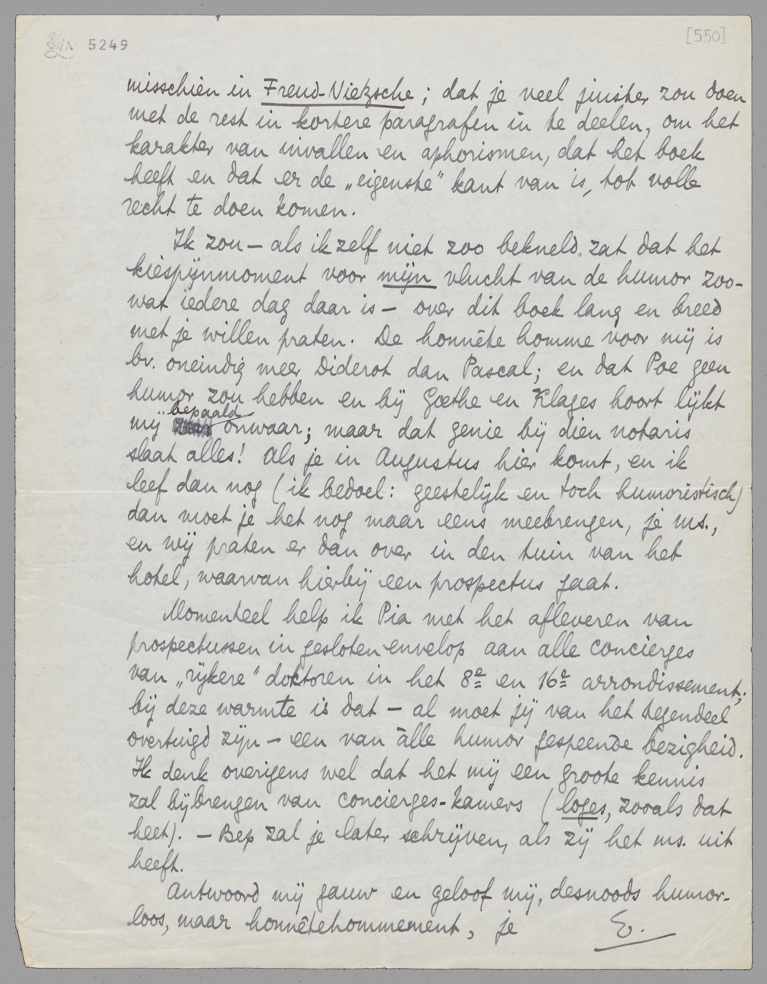 Momenteel help ik Pia met het afleveren van prospectussen in gesloten envelop aan alle concierges van ‘rijkere’ doktoren in het 8e en 16e arrondissement; bij deze warmte is dat - al moet jij van het tegendeel overtuigd zijn - een van àlle humor gespeende bezigheid. Ik denk overigens wel dat het mij een groote kennis zal bij brengen van concierges-kamers (loges, zooals dat heet). - Bep zal je later schrijven, als zij het ms. uit heeft.