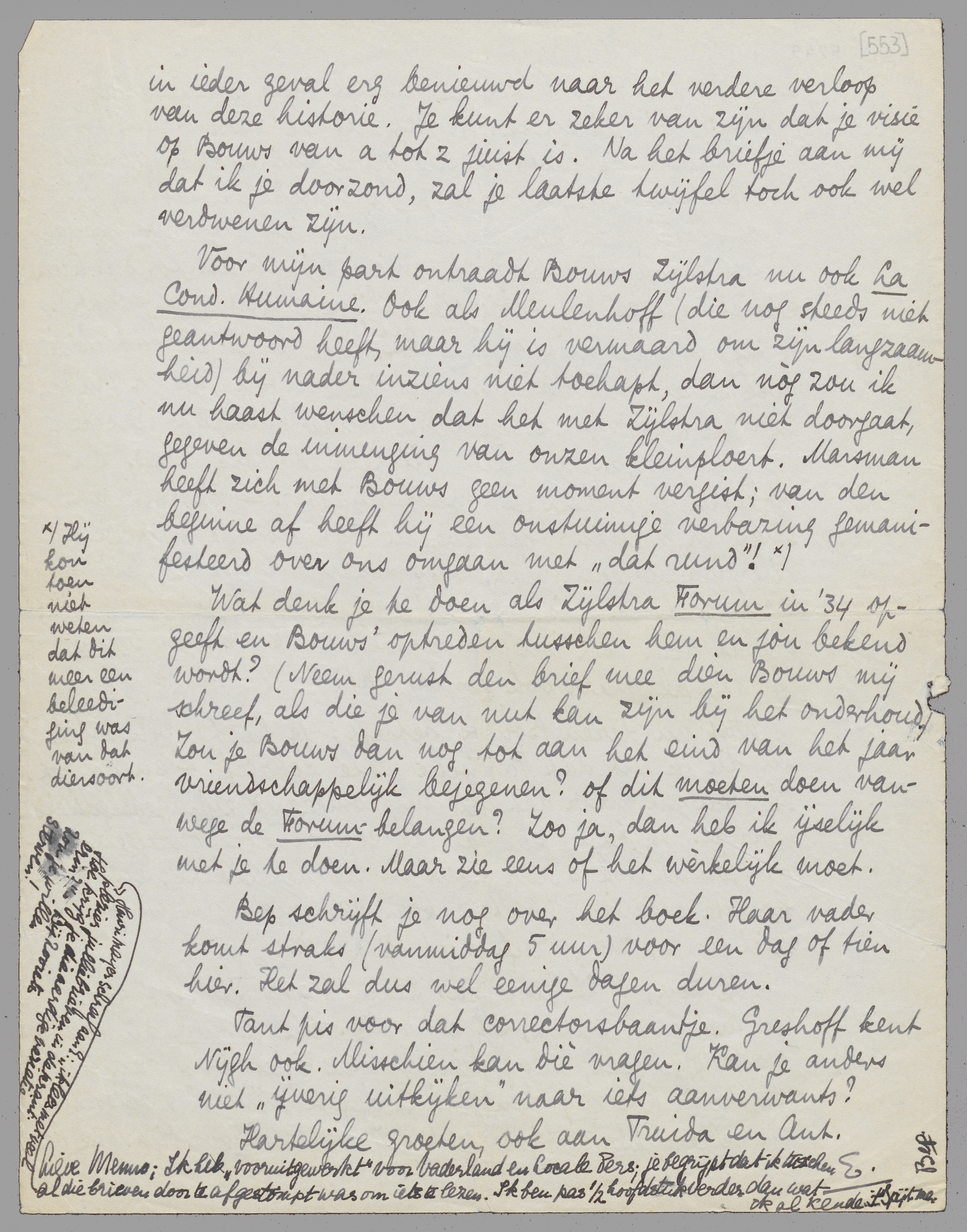 Wat denk je te doen als Zijlstra Forum in '34 opgeeft en Bouws' optreden tusschen hem en jou bekend wordt? (Neem gerust den brief mee dien Bouws mij schreef, als die je van nut kan zijn bij het onderhoud.) Zou je Bouws dan nog tot aan het eind van het jaar vriendschappelijk bejegenen? of dit moeten doen vanwege de Forum-belangen? Zoo ja, dan heb ik ijselijk met je te doen. Maar zie eens of het wèrkelijk moet.