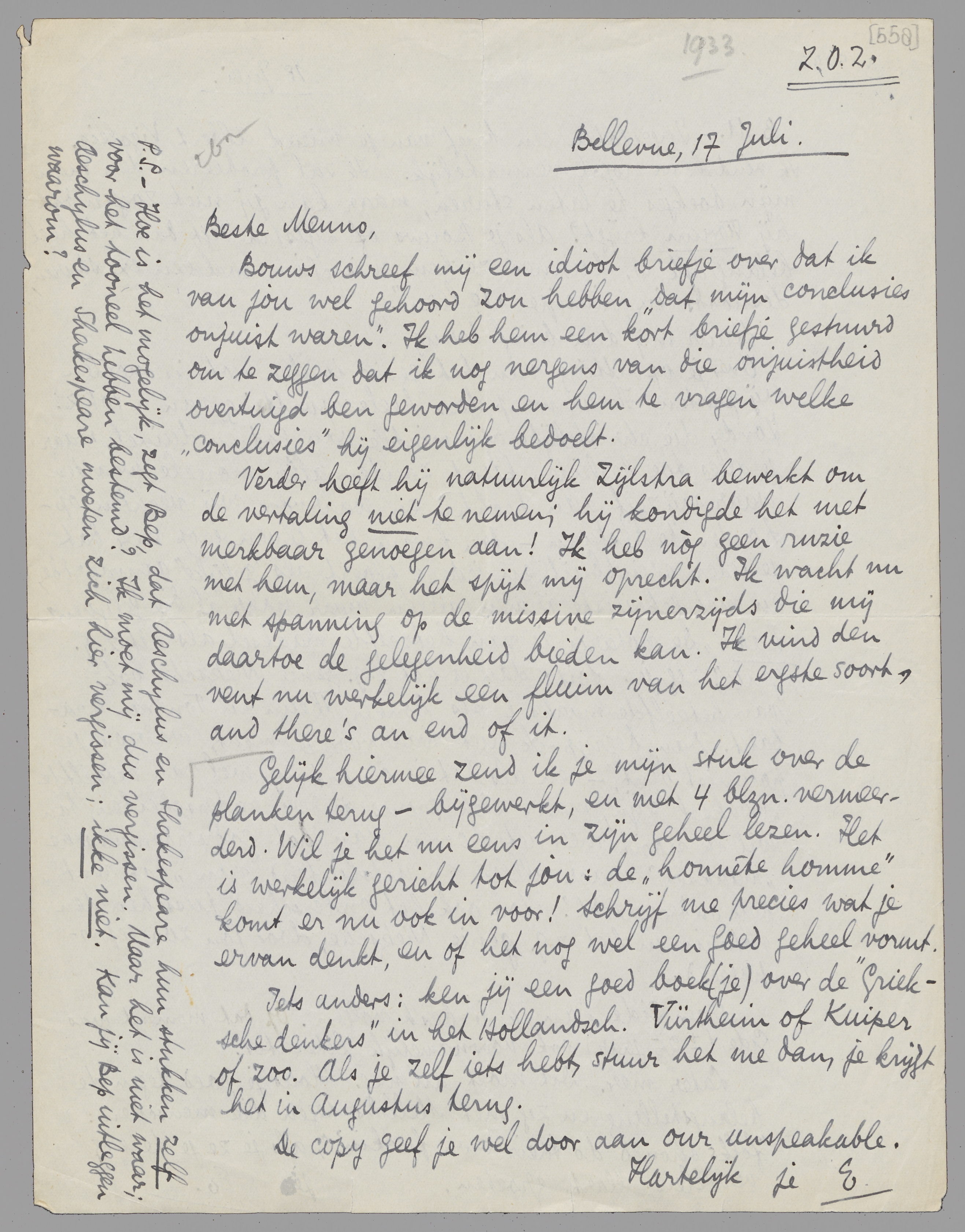 Iets anders: ken jij een goed boek(je) over de ‘Grieksche denkers’ in het Hollandsch. Vürtheim of Kuiper of zoo. Als je zelf iets hebt, stuur het me dan, je krijgt het in Augustus terug. De copy geef je wel door aan our unspeakable. Hartelijk