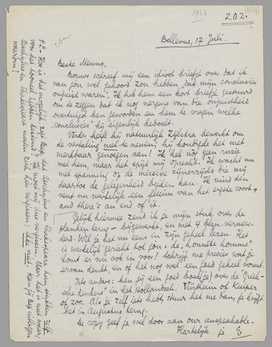 Gelijk hiermee zend ik je mijn stuk over de planken terug - bijgewerkt, en met 4 blzn. vermeerderd. Wil je het nu eens in zijn geheel lezen. Het is werkelijk gericht tot jou: de ‘honnête homme’ komt er nu ook in voor! Schrijf me precies wat je ervan denkt, en of het nog wel een goed geheel vormt.