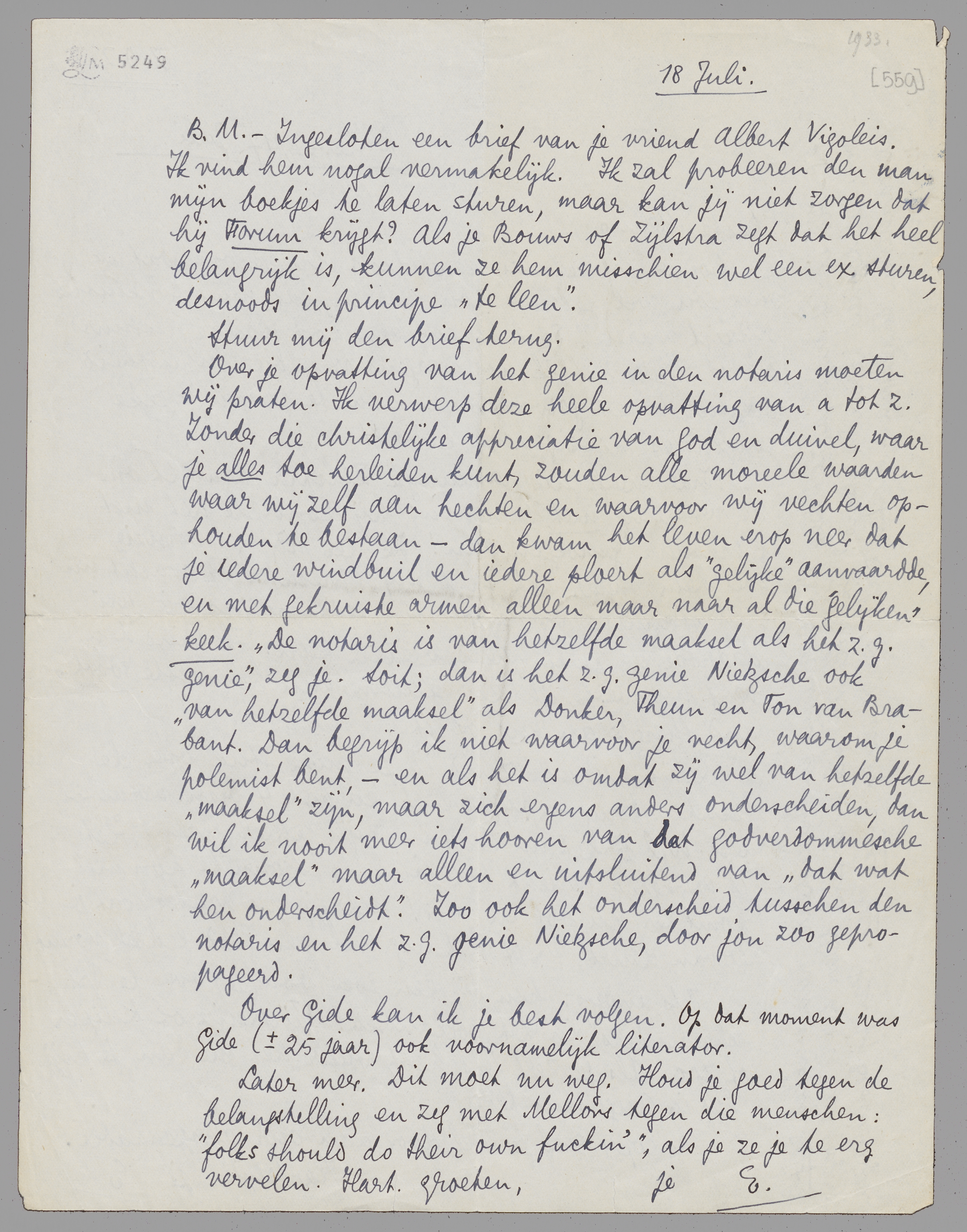 Over je opvatting van het genie in den notaris moeten wij praten. Ik verwerp deze heele opvatting van a tot z. Zonder die christelijke appreciatie van God en duivel, waar je alles toe herleiden kunt, zouden alle moreele waarden waar wij zelf aan hechten en waarvoor wij vechten ophouden te bestaan - dan kwam het leven er op neer dat je iedere windbuil en iedere ploert als ‘gelijke’ aanvaardde, en met gekruiste armen alleen maar naar al die ‘gelijken’ keek. ‘De notaris is van hetzelfde maaksel als het z.g. genie’, zeg je. Soit; dan is het z.g. genie Nietzsche ook ‘van hetzelfde maaksel’ als Donker, Theun en Ton van Brabant. Dan begrijp ik niet waarvoor je vecht, waarom je polemist bent, - en als het is omdat zij wel van hetzelfde maaksel zijn, maar zich ergens anders onderscheiden, dan wil ik nooit meer iets hooren van dat godverdommesche ‘maaksel’ maar alleen en uitsluitend van ‘dat wat hen onderscheidt’. Zoo ook het onderscheid tusschen den notaris en het z.g. genie Nietzsche, door jou zoo gepropageerd.