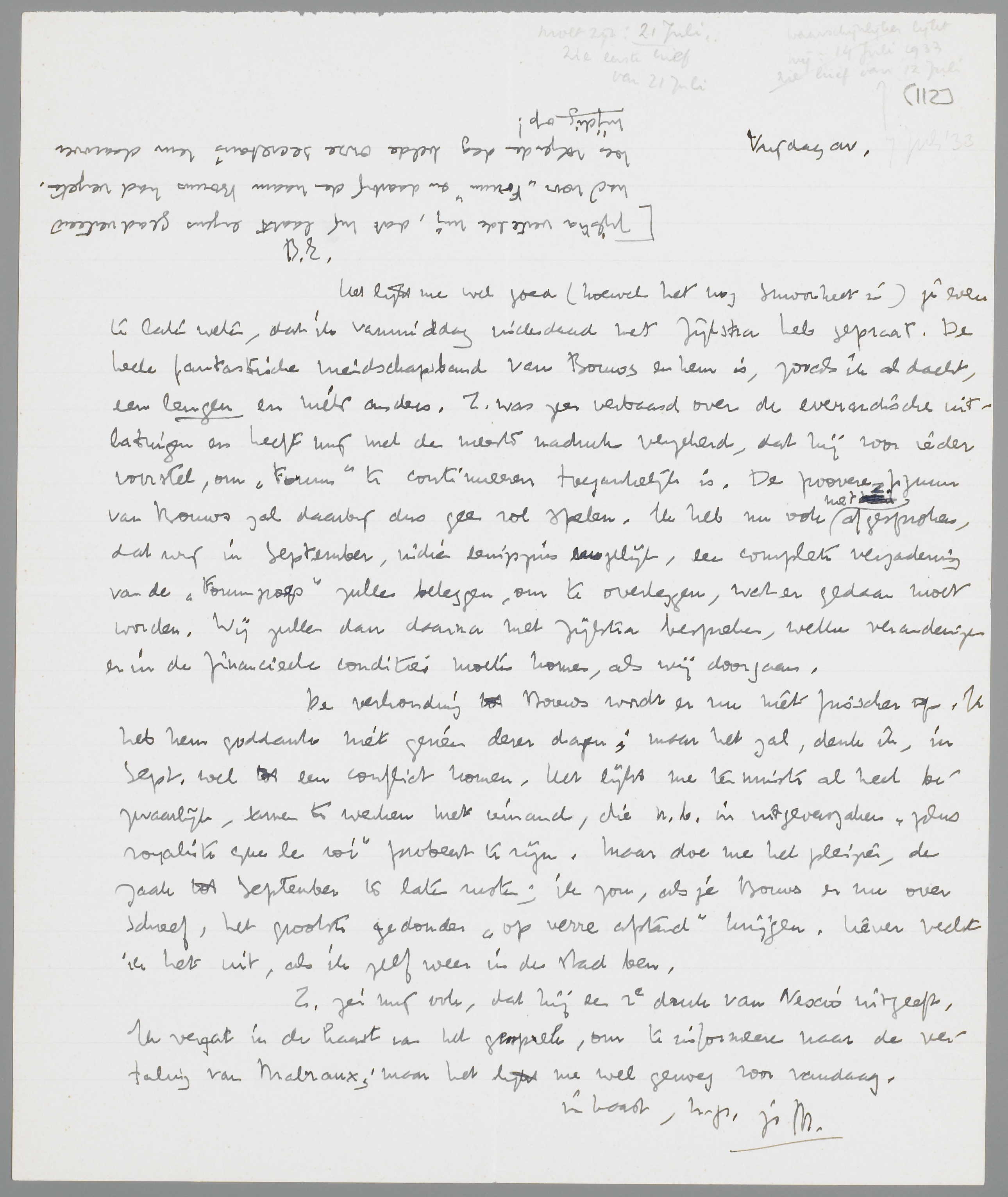 Het lijkt me goed (hoewel het nog smoorheet is) je even te laten weten, dat ik vanmiddag inderdaad met Zijlstra heb gepraat. De heele fantastische vriendschapsband van Bouws en hem is, zooals ik al dacht, een leugen en niets anders. Z. was zeer verbaasd over de everardische uitlatingen en heeft mij met de meeste nadruk verzekerd, dat hij voor ieder voorstel, om Forum te continueeren toegankelijk is. De poovere figuur van Bouws zal daarbij dus geen rol spelen. Ik heb nu ook net afgesproken, dat wij in September, indien eenigszins mogelijk, een complete vergadering van de ‘Forumgroep’ zullen beleggen, om te overleggen, wat er gedaan moet worden. Wij zullen dan daarna met Zijlstra bespreken, welke veranderingen er in de financieele condities moeten komen, als wij doorgaan.