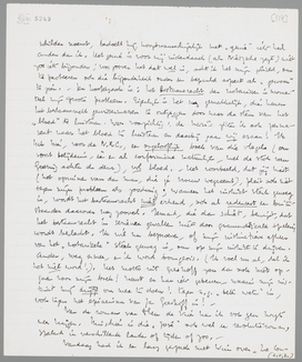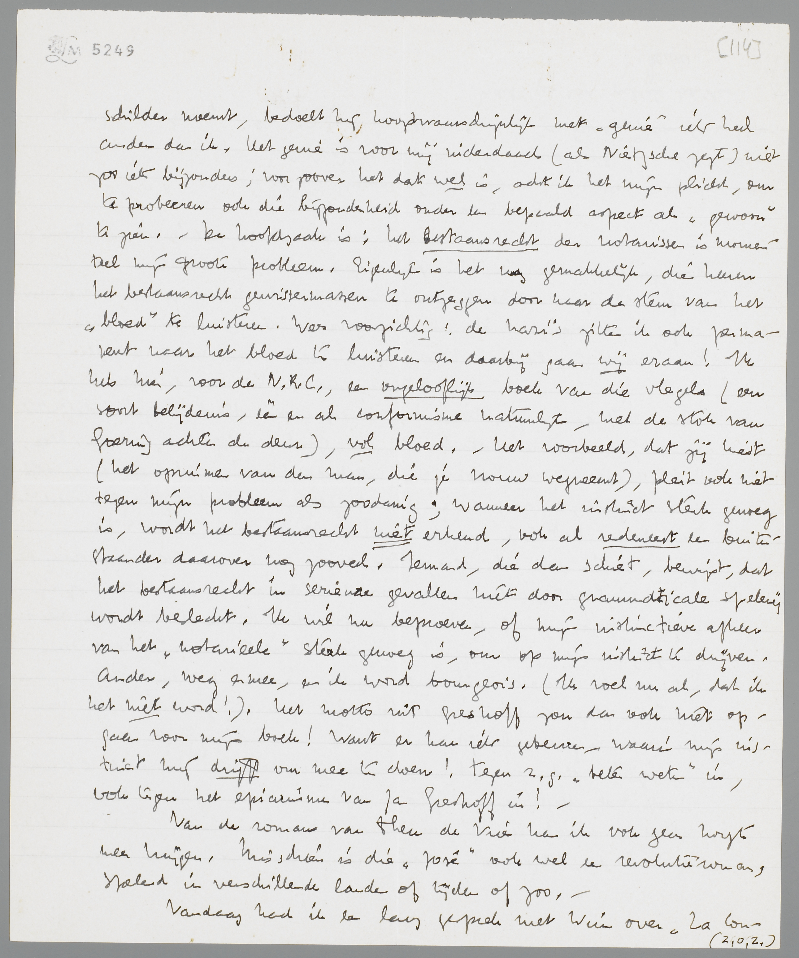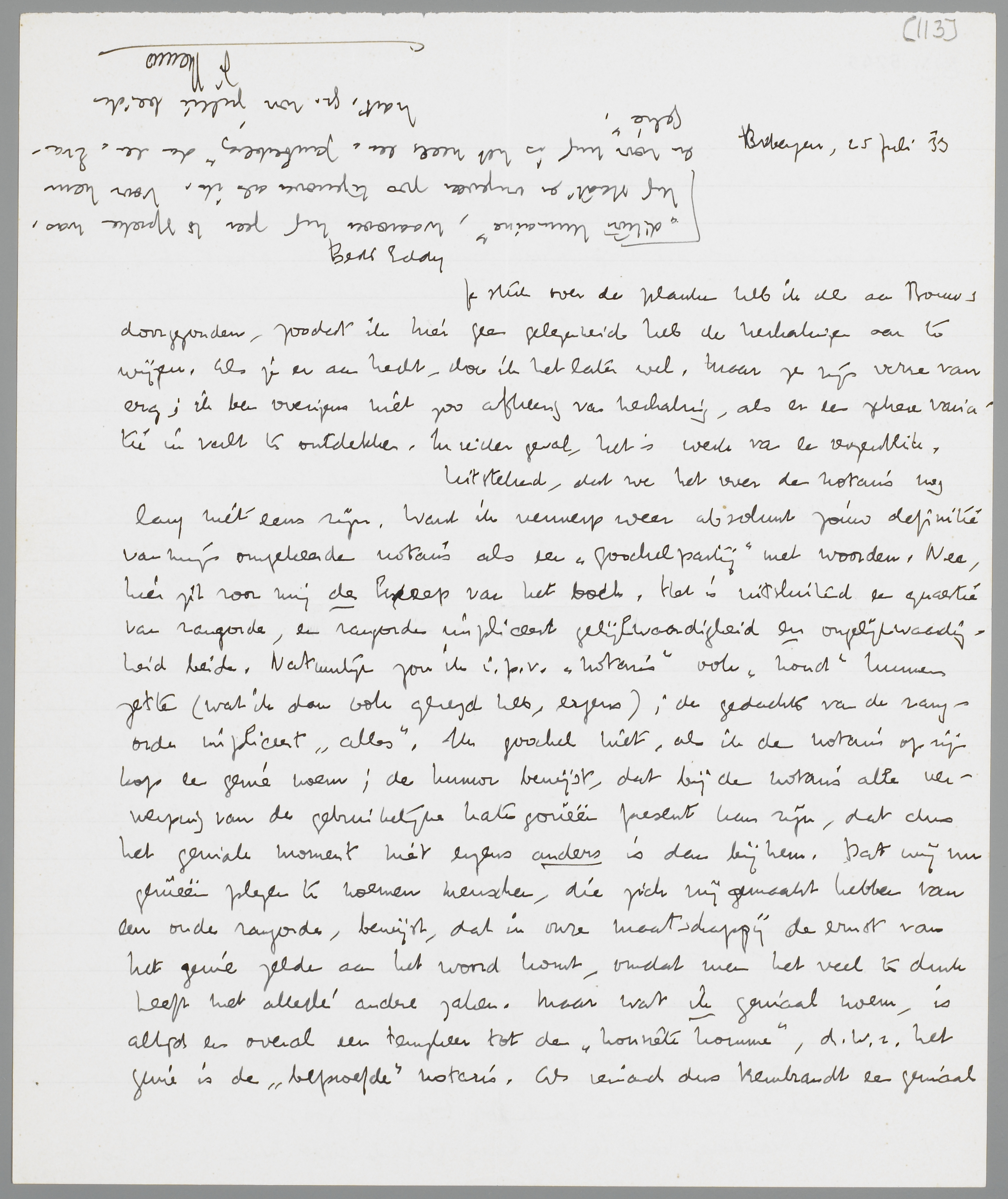 Uitstekend, dat we het over den notaris nog lang niet eens zijn. Want ik verwerp weer absoluut jouw definitie van mijn omgekeerden notaris als een ‘goochelpartij’ met woorden. Nee, hier zit voor mij de kneep van het boek. Het is uitsluitend een quaestie van rangorde, en rangorde impliceert gelijkwaardigheid en ongelijkwaardigheid beide. Natuurlijk zou ik i.p.v. ‘notaris’ ook ‘hond’ kunnen zetten (wat ik dan ook gezegd heb, ergens); de gedachte van de rangorde impliceert ‘alles’. Ik goochel niet, als ik den notaris op zijn kop een genie noem; de humor bewijst, dat bij den notaris alle verwerping van de gebruikelijke kategorieën present kan zijn, dat dus het geniale moment niet ergens anders is dan bij hem. Dat wij nu genieën plegen te noemen menschen, die zich vrij gemaakt hebben van een oude rangorde, bewijst, dat in onze maatschappij de ernst van het genie zelden aan het woord komt, omdat men het veel te druk heeft met allerlei andere zaken. Maar wat ik geniaal noem, is altijd en overal een terugkeer tot den ‘honnête homme’, d.w.z. het genie is de ‘beproefde’ notaris. Als iemand dus Rembrandt een geniaal schilder noemt, bedoelt hij hoogstwaarschijnlijk met ‘genie’ iets heel anders dan ik. Het genie is voor mij inderdaad (als Nietzsche zegt) niet zoo iets bijzonders; voor zoover het dat wel is, acht ik het mijn plicht, om te probeeren ook die bijzonderheid onder een bepaald aspect als ‘gewoon’ te zien. - De hoofdzaak is: het bestaansrecht der notarissen is momenteel mijn groote probleem. Eigenlijk is het nog gemakkelijk, die heeren het bestaansrecht gewissermassen te ontzeggen door naar de stem van het ‘bloed’ te luisteren. Wees voorzichtig: de nazi's zitten ook permanent naar het bloed te luisteren en daarbij gaan wij eraan! Ik heb hier, voor de N.R.C., een ongelooflijk boek van die vlegels (een soort belijdenis, één en al conformisme natuurlijk, met de stok van Goering achter de deur), vol bloed. - Het voorbeeld, dat jij kiest (het opruimen van den man, die je vrouw wegneemt), pleit ook niet tegen mijn probleem als zoodanig; wanneer het instinct sterk genoeg is, wordt het bestaansrecht niet erkend, ook al redeneert een buitenstaander daarover nog zooveel. Iemand, die dan schiet, bewijst, dat het bestaansrecht in serieuze gevallen niet door grammaticale spelerij wordt beslecht. Ik wil nu beproeven, of mijn instinctieve afkeer van het ‘notarieele’ sterk genoeg is, om op mijn instinct te drijven. Anders, weg ermee, en ik word bourgeois. (Ik voel nu al, dat ik het niet word!). Het motto uit Greshoff zou dan ook niet opgaan voor mijn boek! Want er kan iets gebeuren, waarin mijn instinct mij drijft om mee te doen! Tegen z.g. ‘beter weten’ in, ook tegen het epicurisme van Jan Greshoff in! -