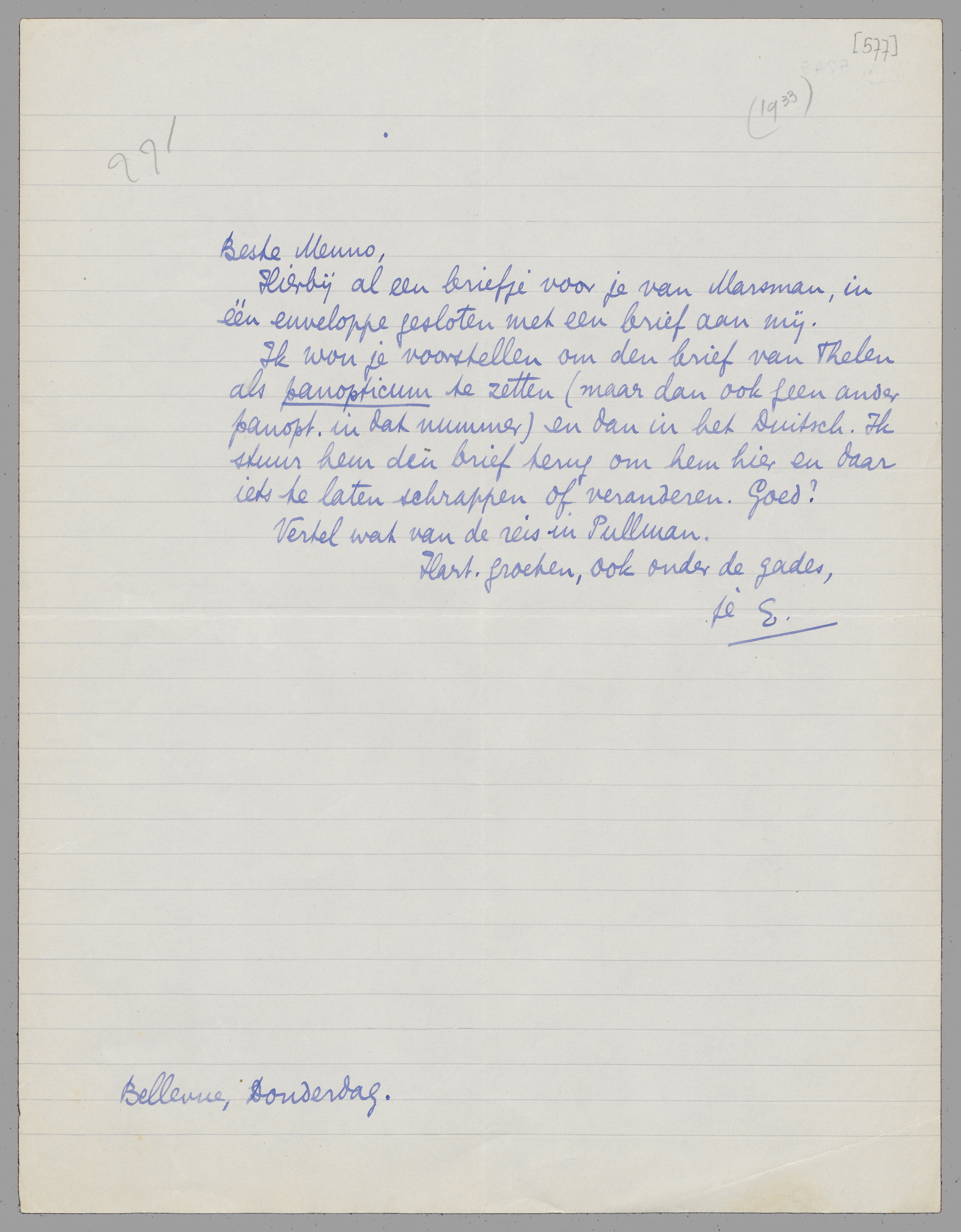 Ik wou je voorstellen om den brief van Thelen als panopticum te zetten (maar dan ook geen ander panopt. in dat nummer) en dan in het Duitsch. Ik stuur hem den brief terug om hem hier en daar iets te laten schrappen of veranderen. Goed?