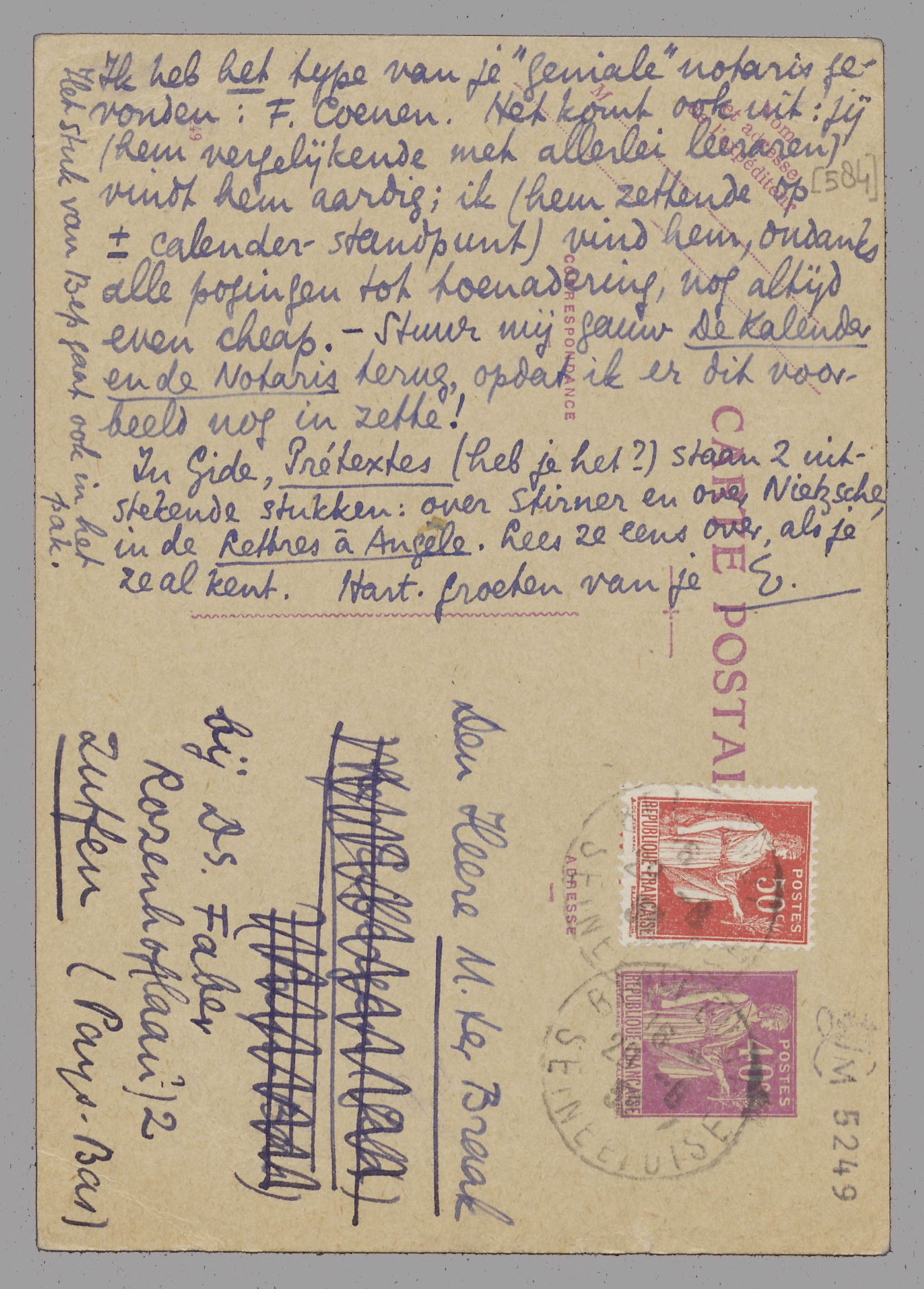 Ik heb het type van je ‘geniale’ notaris gevonden: F. Coenen. Het komt ook uit: jij (hem vergelijkende met allerlei leeraren) vindt hem aardig; ik (hem zettende op ± calender-standpunt) vind hem, ondanks alle pogingen tot toenadering, nog altijd even cheap. - Stuur mij gauw De Kalender en de Notaris terug, opdat ik er dit voorbeeld nog in zette!