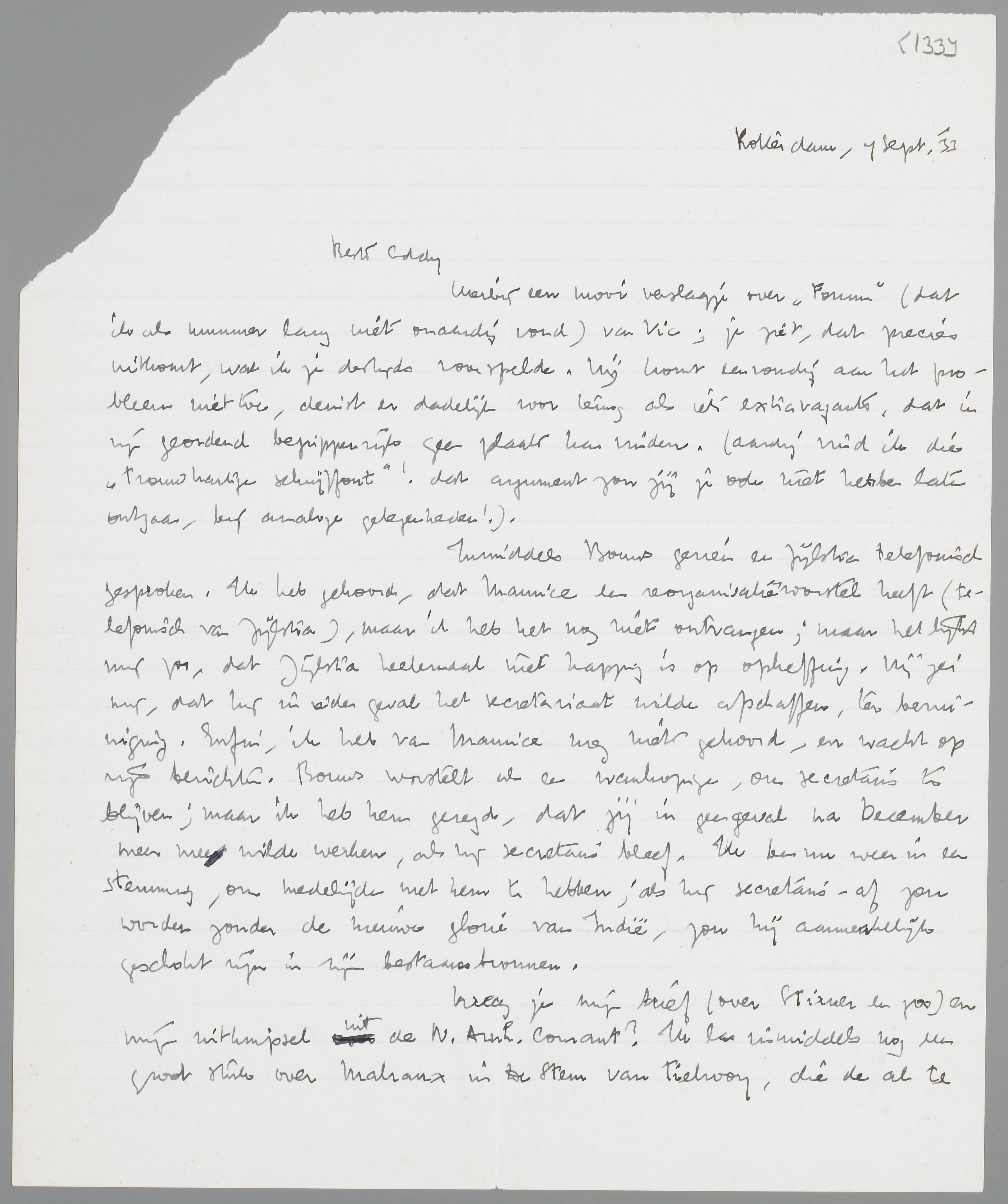 Inmiddels Bouws gezien en Zijlstra telefonisch gesproken. Ik heb gehoord, dat Maurice een reorganisatievoorstel heeft (telefonisch van Zijlstra), maar ik heb het nog niet ontvangen; maar het lijkt mij zoo, dat Zijlstra heelemaal niet happig is op opheffing. Hij zei mij, dat hij in ieder geval het secretariaat wilde afschaffen, ter bezuiniging. Enfin, ik heb van Maurice nog niets gehoord, en wacht op zijn berichten. Bouws worstelt als een wanhopige, om secretaris te blijven; maar ik heb hem gezegd, dat jij in geen geval na December meer mee wilde werken, als hij secretaris bleef. Ik ben nu weer in een stemming, om medelijden met hem te hebben; als hij secretaris-af zou worden zonder de nieuwe glorie van Indië, zou hij aanmerkelijk geschokt zijn in zijn bestaansbronnen.
