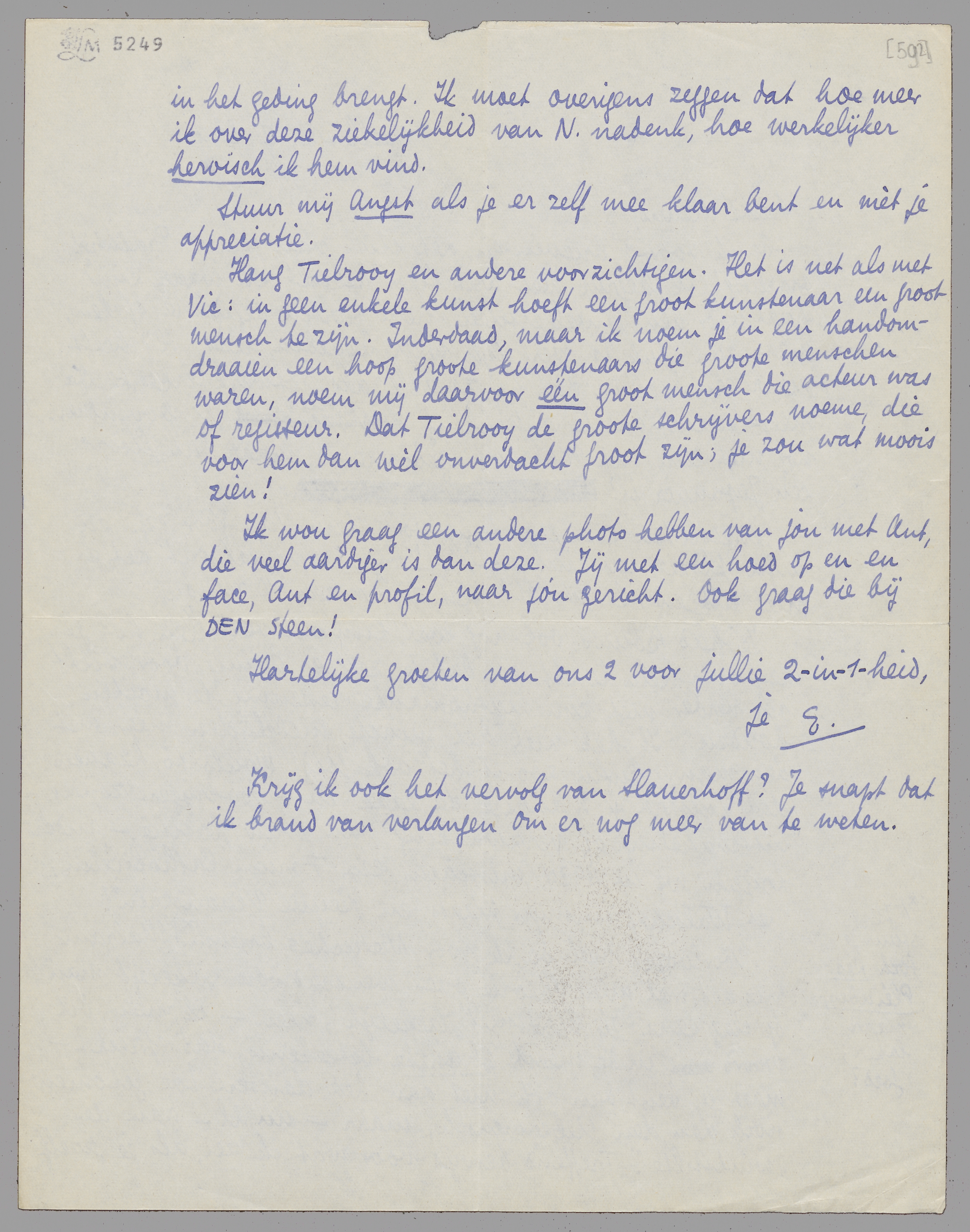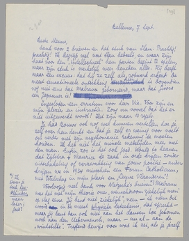 Dank voor 2 brieven en het stuk van Slau. Prachtig! prachtig! Ik begrijp wel wat Slau bedoelt, en waar zijn haat voor den ‘intellectueel’ hem parten begint te spelen, maar zijn stuk is werkelijk weer beneden alles. Hij heeft maar één excuus: dat hij ze zelf als rotwerk erkent. De meest sensationeele ontdekking hier is bovendien nog niet eens dat Malraux geborneerd, maar dat Gisors een Japanner is!