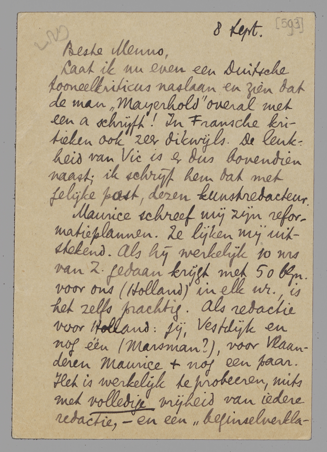 Laat ik nu even een Duitsche tooneelkriticus naslaan en zien dat de man ‘Mayerhold’ overal met een a schrijft! In Fransche kritieken ook zeer dikwijls. De leukheid van Vic is er dus bovendien naast; ik schrijf hem dat met gelijke post, dezen kunstredacteur.