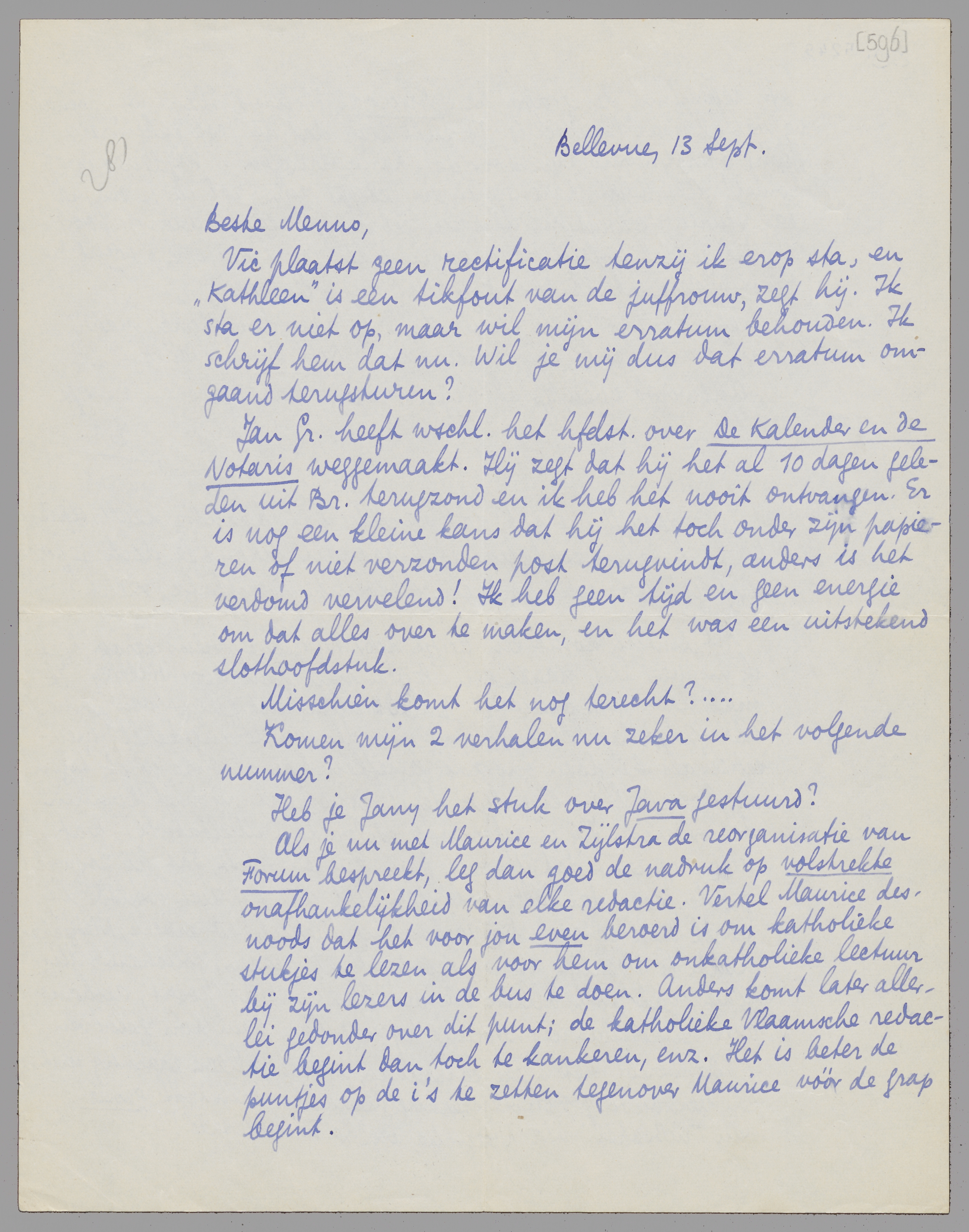 Als je nu met Maurice en Zijlstra de reorganisatie van Forum bespreekt, leg dan goed de nadruk op volstrekte onafhankelijkheid van elke redactie. Vertel Maurice desnoods dat het voor jou even beroerd is om katholieke stukjes te lezen als voor hem om onkatholieke lectuur bij zijn lezers in de bus te doen. Anders komt later allerlei gedonder over dit punt; de katholieke Vlaamsche redactie begint dan toch te kankeren, enz. Het is beter de puntjes op de i's te zetten tegenover Maurice vóór de grap begint.