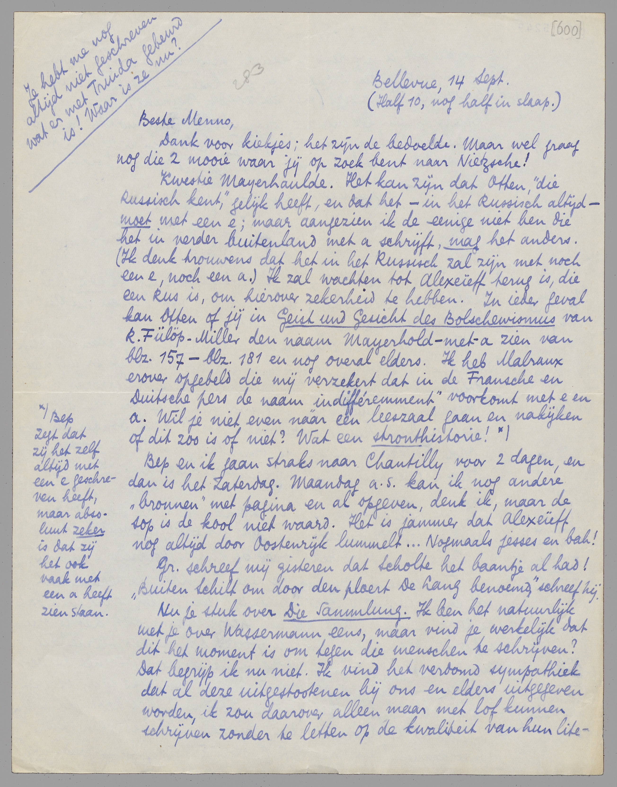 Kwestie Mayerhaulde. Het kan zijn dat Otten, ‘die russisch kent’, gelijk heeft, en dat het - in het Russisch altijd - moet met een e; maar aangezien ik de eenige niet ben die het in verder buitenland met a schrijft, mag het anders. (Ik denk trouwens dat het in het Russisch zal zijn met noch een e, noch een a.) Ik zal wachten tot Alexeiëff terug is, die een Rus is, om hierover zekerheid te hebben. In ieder geval kan Otten of jij in Geist und Gesicht des Bolschewismus van R. Fülöp-Miller den naam Mayerhold-met-a zien van blz. 157-blz. 181 en nog overal elders. ik heb Malraux erover opgebeld die mij verzekert dat in de Fransche en Duitsche pers de naam ‘indifféremment’ voorkomt met e en a. Wil je niet even naar een leeszaal gaan en nakijken of dit zoo is of niet? Wat een stronthistorie! Bep zegt dat zij het zelf altijd met een e geschreven heeft, maar absoluut zeker is dat zij het ook vaak met een a heeft zien staan.