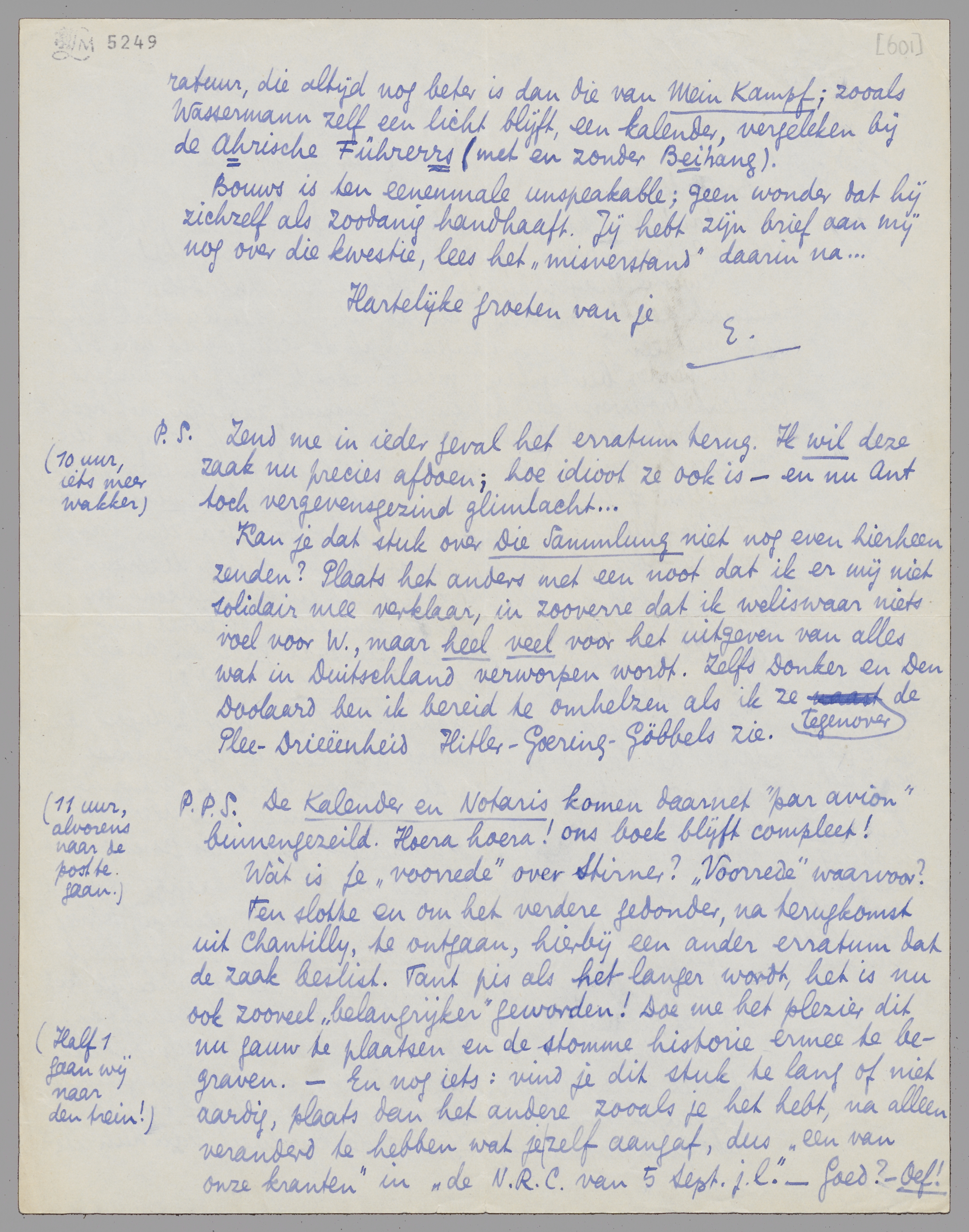 Kan je dat stuk over Die Sammlung niet nog even hierheen zenden? Plaats het anders met een noot dat ik er mij niet solidair mee verklaar, in zooverre dat ik weliswaar niets voel voor W., maar heel veel voor het uitgeven van alles wat in Duitschland verworpen wordt. Zelfs Donker en Den Doolaard ben ik bereid te omhelzen als ik ze tegenover de Plee-Drieëenheid Hitler-Goering-Göbbels zie.