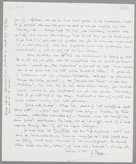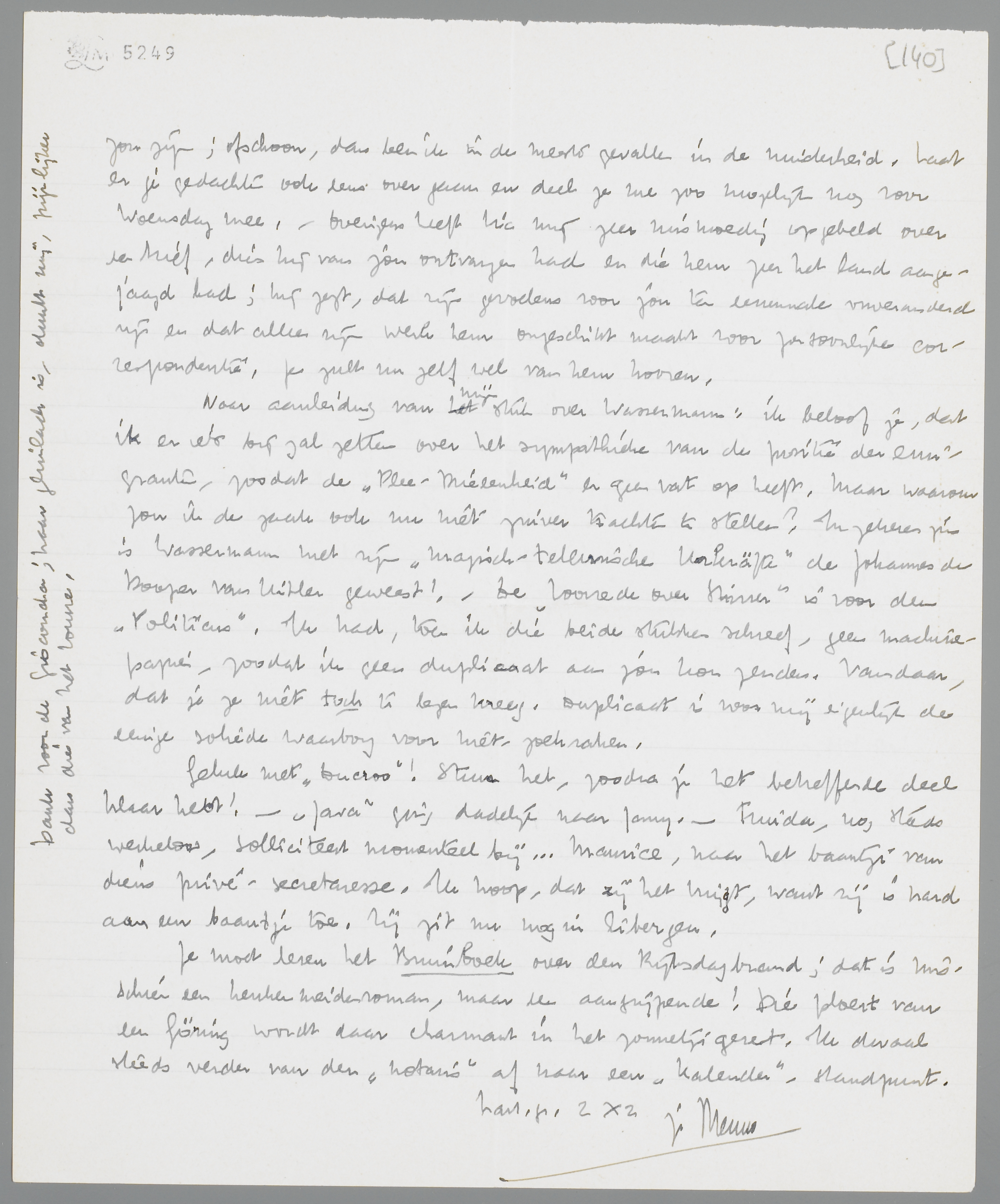 Naar aanleiding van mijn stuk over Wassermann: ik beloof je, dat ik er iets bij zal zetten over het sympathieke van de positie der emigranten, zoodat de ‘Plee-Drieëenheid’ er geen vat op heeft. Maar waarom zou ik de zaak ook nu niet zuiver trachten te stellen? In zekeren zin is Wassermann met zijn ‘magisch-tellurische-Urkräfte’ de Johannes de Dooper van Hitler geweest! - De Voorrede over Stirner is voor den Politicus. Ik had, toen ik die beide stukken schreef, geen machinepapier, zoodat ik geen duplicaat aan jou kon zenden. Vandaar, dat je ze niet toch te lezen kreeg. Duplicaat is voor mij eigenlijk de eenige soliede waarborg voor niet-zoekraken.