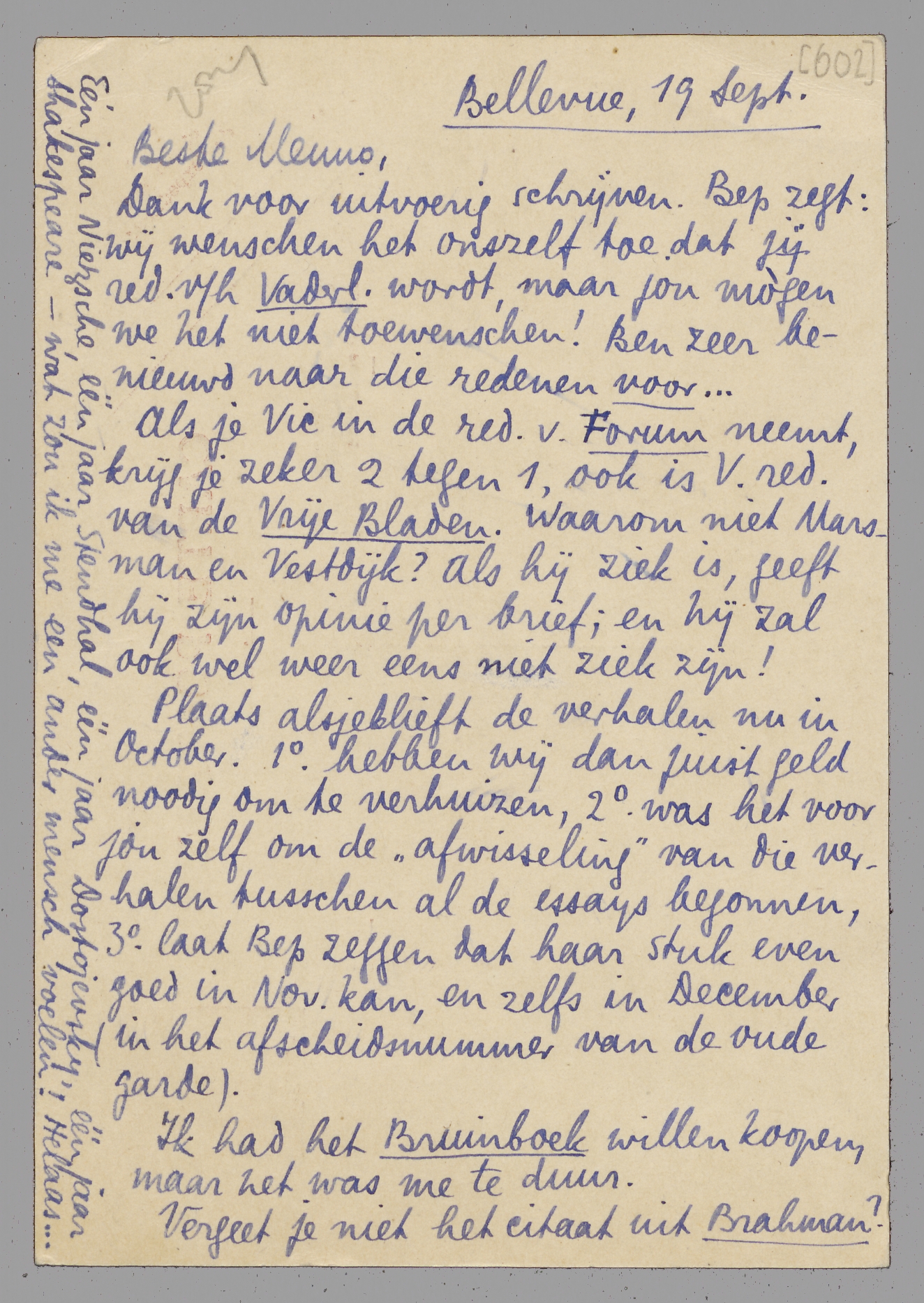 Plaats alsjeblieft de verhalen nu in October. 1o hebben wij dan juist geld noodig om te verhuizen, 2o was het voor jou zelf om de ‘afwisseling’ van die verhalen tusschen al de essays begonnen, 3o laat Bep zeggen dat haar stuk evengoed in Nov. kan, en zelfs in December (in het afscheidsnummer van de oude garde).