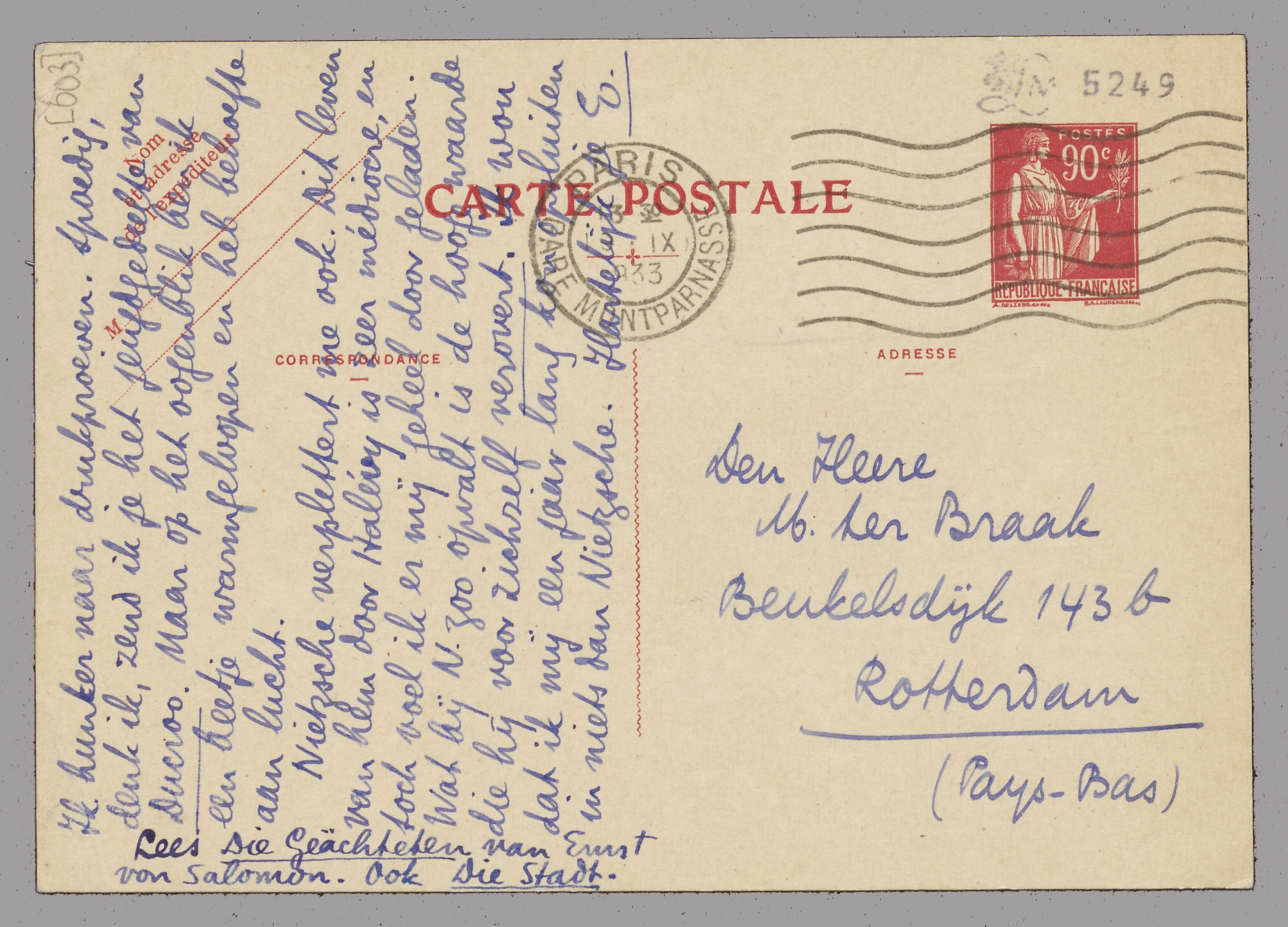 Nietzsche verplettert me ook. Dit leven van hem door Halévy is zeer médiocre, en toch voel ik er mij geheel door geladen. Wat bij N. zoo opvalt is de hooge waarde die hij voor zichzelf verovert. Ik wou dat ik mij een jaar lang kon opsluiten in niets dan Nietzsche.