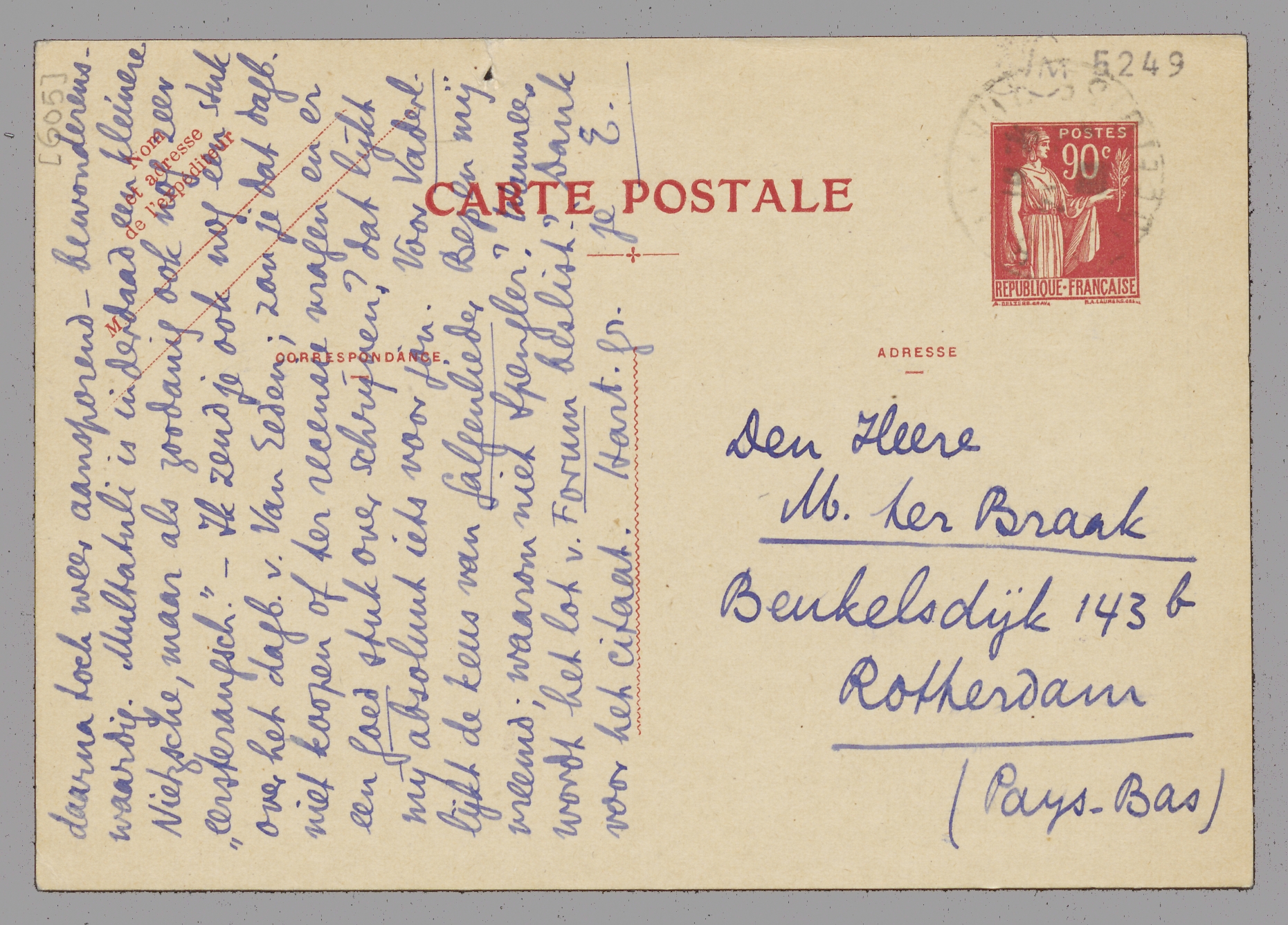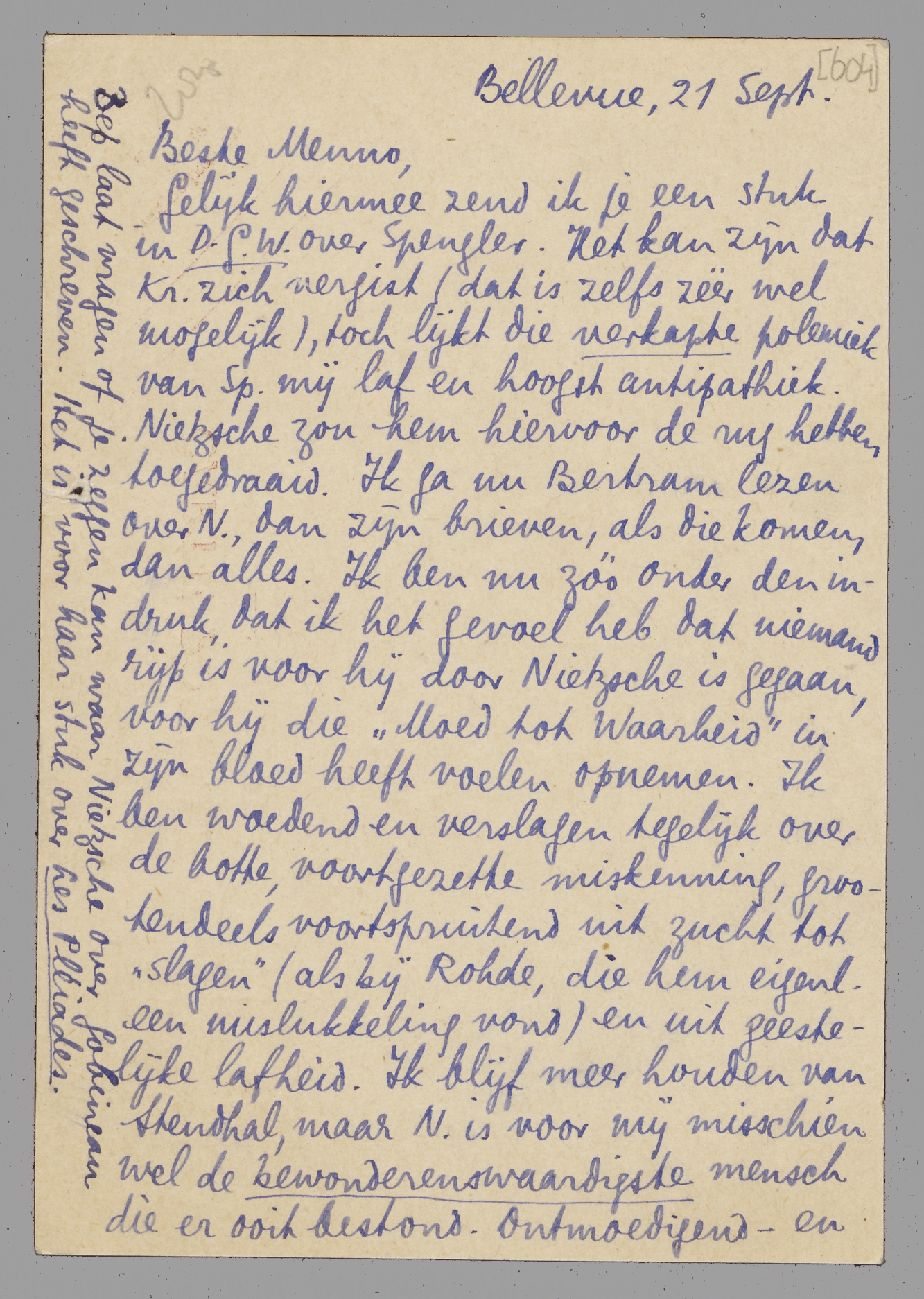 Gelijk hiermee zend ik je een stuk in D.G.W. over Spengler. Het kan zijn dat Kr. zich vergist (dat is zelfs zéér wel mogelijk), toch lijkt die verkapte polemiek van Sp. mij laf en hoogst antipathiek. Nietzsche zou hem hiervoor de rug hebben toegedraaid. Ik ga nu Bertram lezen over N., dan zijn brieven, als die komen, dan alles. Ik ben nu zóó onder den indruk, dat ik het gevoel heb dat niemand rijp is voor hij door Nietzsche is gegaan, voor hij die ‘Moed tot Waarheid’ in zijn bloed heeft voelen opnemen. Ik ben woedend en verslagen tegelijk over de botte, voortgezette miskenning, grootendeels voortspruitend uit zucht tot ‘slagen’ (als bij Rohde, die hem eigenl. een mislukkeling vond) en uit geestelijke lafheid. Ik blijf meer houden van Stendhal, maar N. is voor mij misschien wel de bewonderenswaardigste mensch die er ooit bestond. Ontmoedigend - en daarna toch weer aansporend - bewonderenswaardig. Multatuli is inderdaad een kleinere Nietzsche, maar als zoodanig ook nog zeer ‘eersterangsch.’ - Ik zend je ook nog een stuk over het dagb. v. Van Eeden; zou je dat dagb. niet koopen of ter recensie vragen en er een goed stuk over schrijven? dat lijkt mij absoluut iets voor jou. Voor Vaderl. lijkt de keus van Galgenlieder Bep en mij vreemd; waarom niet Spengler? Wanneer wordt het lot v. Forum beslist? Dank voor het citaat. Hart. gr. je