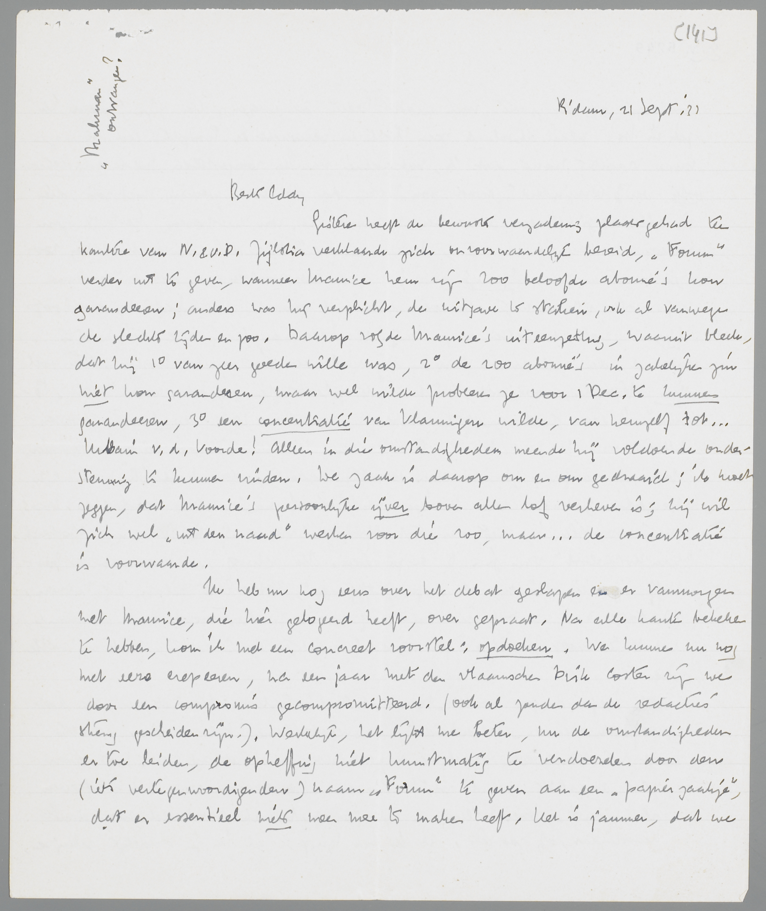 Gisteren heeft de bewuste vergadering plaats gehad ten kantore van N. & v.D. Zijlstra verklaarde zich onvoorwaardelijk bereid, Forum verder uit tegeven, wanneer Maurice hem zijn 200 beloofde abonné's kon garandeeren; anders was hij verplicht, de uitgave te staken, ook al vanwege de slechte tijden en zoo. Daarop volgde Maurice's uiteenzetting, waaruit bleek, dat hij 1o van zeer goeden wille was, 2o de 200 abonné's in zakelijken zin niet kon garandeeren, maar wel wilde probeeren ze voor 1 Dec. te kunnen garandeeren, 3o een concentratie van Vlamingen wilde, van hemzelf tot... Urbain v.d. Voorde! Alleen in die omstandigheden meende hij voldoende ondersteuning te kunnen vinden. De zaak is daarop om en om gedraaid; ik moet zeggen, dat Maurice's persoonlijke ijver boven allen lof verheven is; hij wil zich wel ‘uit den naad’ werken voor die 200, maar... de concentratie is voorwaarde.