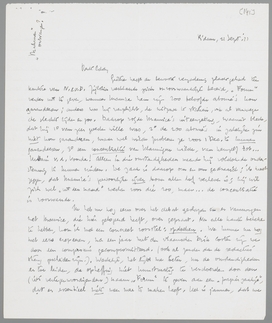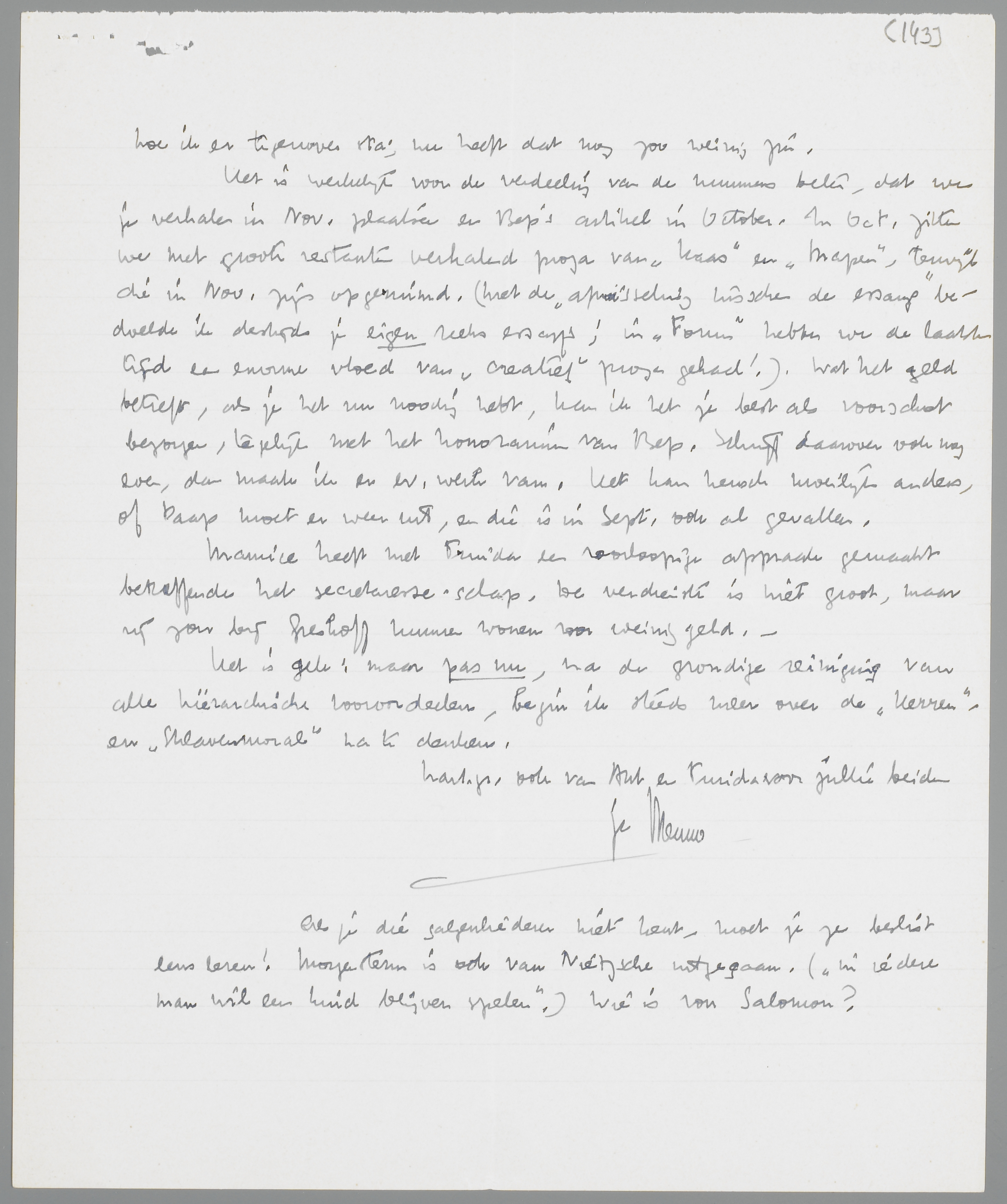 Het is werkelijk voor de verdeeling van de nummers beter, dat we je verhalen in Nov. plaatsen en Bep's artikel in October. In Oct. zitten we met groote restanten verhalend proza van Kaas en Mapen, terwijl die in Nov. zijn opgeruimd. (Met de ‘afwisseling tusschen de essays’ bedoelde ik destijds je eigen reeks essays; in Forum hebben we de laatste tijd een enorme vloed van ‘creatief’ proza gehad!). Wat het geld betreft, als je het nu noodig hebt, kan ik het je best als voorschot bezorgen, tegelijk met het honorarium van Bep. Schrijf daarover ook nog even, dan maak ik er ev. werk van. Het kan heusch moeilijk anders, of Paap moet er weer uit, en die is in Sept. ook al gevallen.