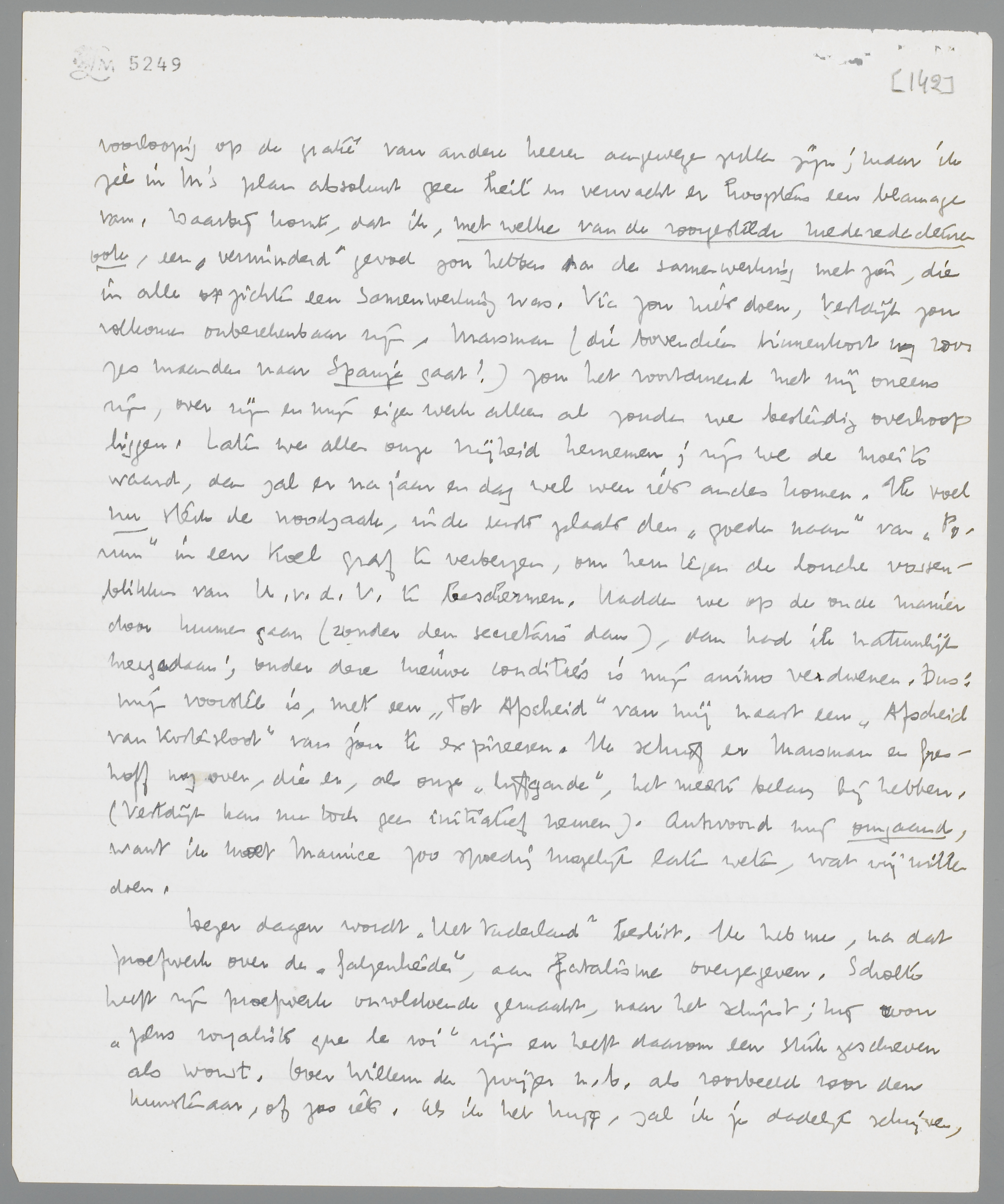 Ik heb nu nog eens over het debat geslapen en er vanmorgen met Maurice, die hier gelogeerd heeft, over gepraat. Na alle kanten bekeken te hebben, kom ik met een concreet voorstel: opdoeken. We kunnen nu nog met eere crepeeren, na een jaar met den vlaamschen Dirk Coster zijn we door een compromis gecompromitteerd. (ook al zouden dan de redacties streng gescheiden zijn.). Werkelijk, het lijkt me beter, nu de omstandigheden er toe leiden, de opheffing niet kunstmatig te verdoezelen door den (iets vertegenwoordigenden) naam Forum te geven aan een ‘papierzaakje’, dat er essentieel niets meer mee te maken heeft. Het is jammer, dat we voorlopig op de gratie van andere heeren aangewezen zullen zijn; maar ik zie in M's plan absoluut geen heil en verwacht er hoogstens een blamage van. Daarbij komt, dat ik, met welke van de voorgestelde mederedacteuren ook, een ‘verminderd’ gevoel zou hebben na de samenwerking met jou, die in alle opzichten een samenwerking was. Vic zou niets doen, Vestdijk zou volkomen onberekenbaar zijn, Marsman (die bovendien binnenkort nog voor zes maanden naar Spanje gaat!) zou het voortdurend met mij oneens zijn, over zijn en mijn eigen werk alleen al zouden we bestendig overhoop liggen. Laten we allen onze vrijheid hernemen; zijn we de moeite waard, dan zal er na jaar en dag wel weer iets anders komen. Ik voel nu sterk de noodzaak, in de eerste plaats den ‘goeden naam’ van Forum in een koel graf te verbergen, om hem tegen de louche vossenblikken van U.v.d.V. te beschermen. Hadden we op de oude manier door kunnen gaan (zonder den secretaris dan), dan had ik natuurlijk meegedaan; onder deze nieuwe condities is mijn animo verdwenen. Dus: mijn voorstel is, met een Tot Afscheid van mij naast een Afscheid van Kostersloot van jou te expireeren. Ik schrijf er Marsman en Greshoff nog over, die er, als onze ‘lijfgarde’, het meeste belang bij hebben. (Vestdijk kan nu toch geen initiatief nemen). Antwoord mij omgaand, want ik moet Maurice zoo spoedig mogelijk laten weten, wat wij willen doen.