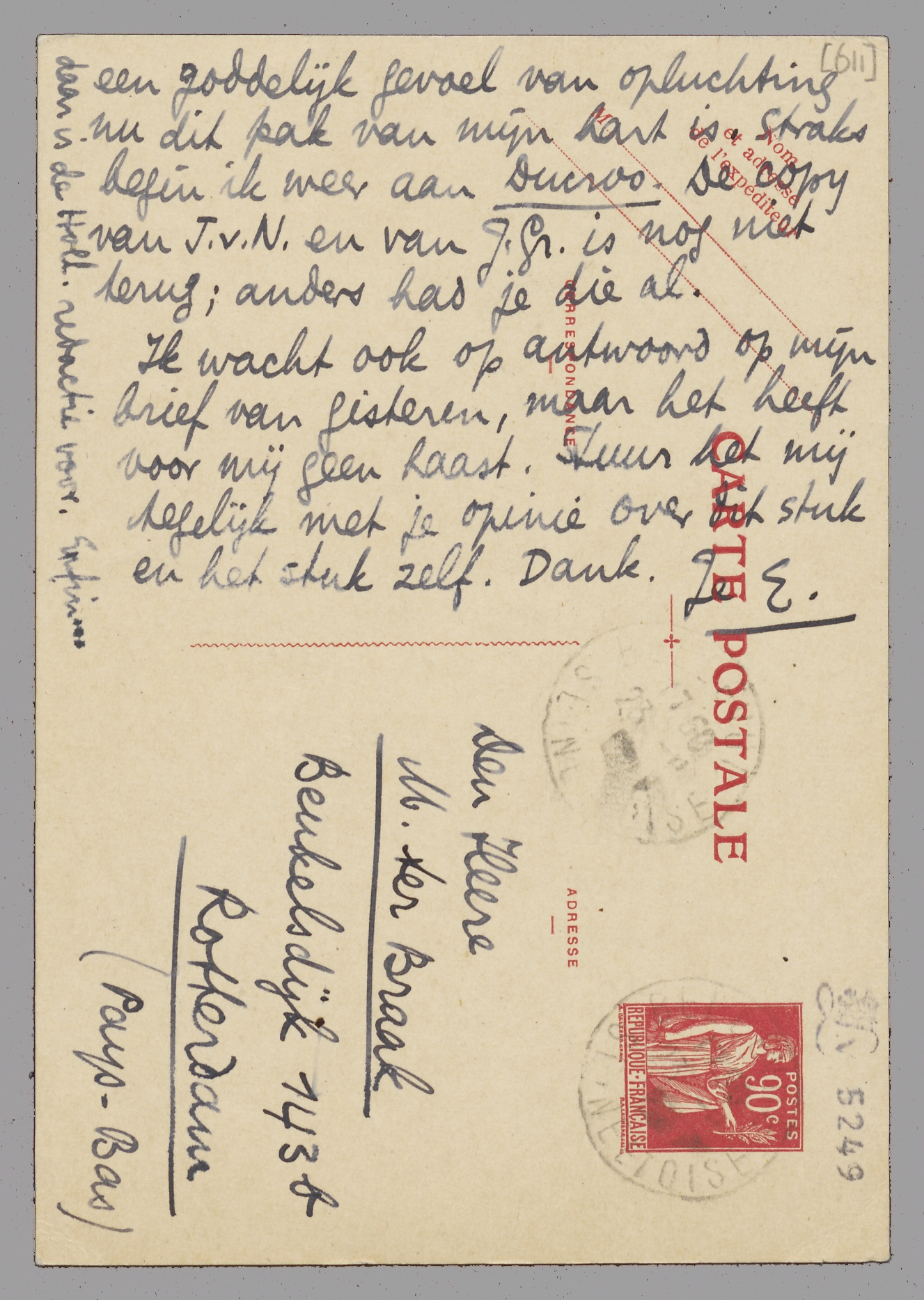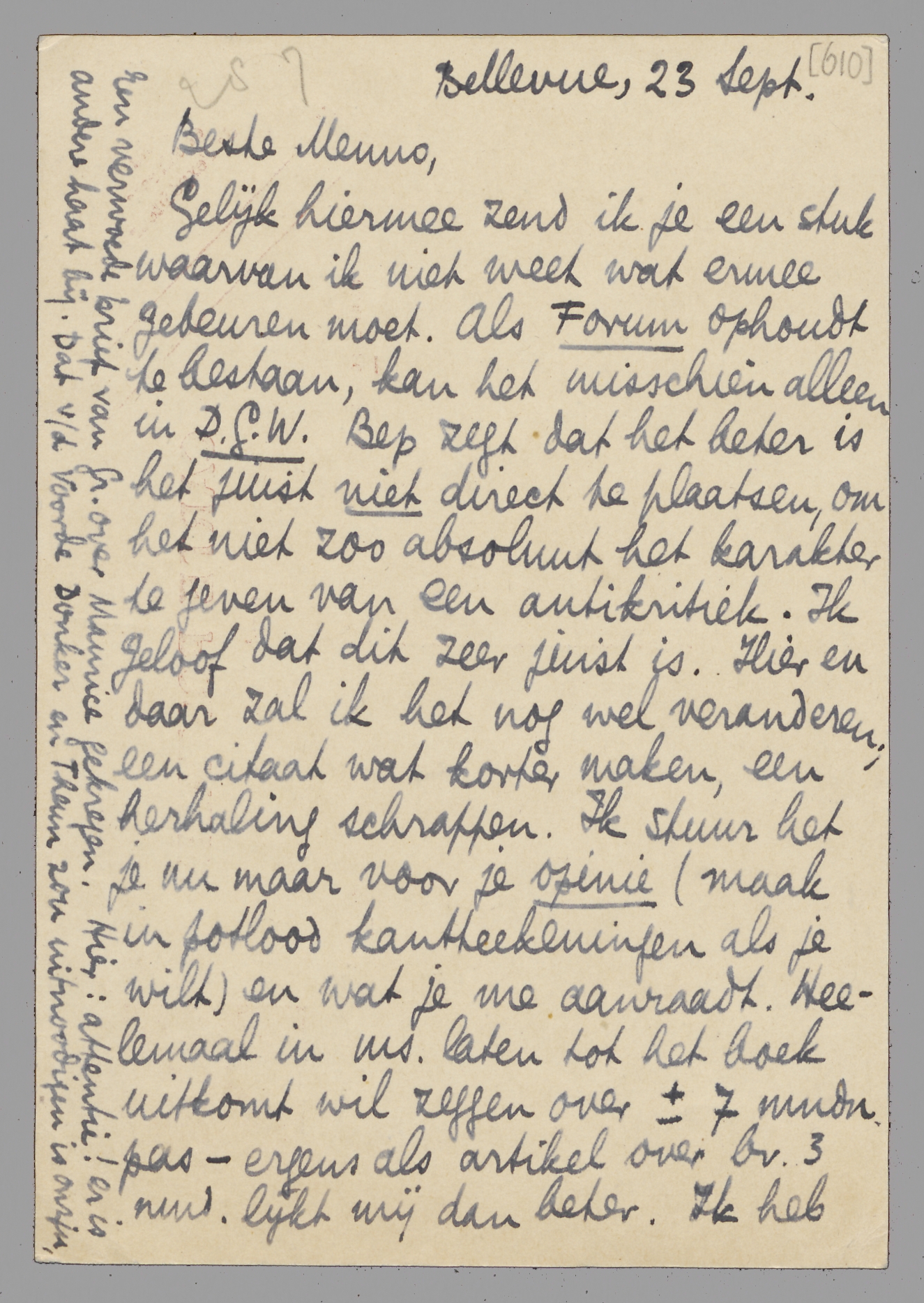 Gelijk hiermee zend ik je een stuk waarvan ik niet weet wat ermee gebeuren moet. Als Forum ophoudt te bestaan, kan het misschien alleen in D.G.W. Bep zegt dat het beter is het juist niet direct te plaatsen, om het niet zoo absoluut het karakter te geven van een antikritiek. Ik geloof dat dit zeer juist is. Hier en daar zal ik het nog wel veranderen; een citaat wat korter maken, een herhaling schrappen. Ik stuur het je nu maar voor je opinie (maak in potlood kanttekeningen als je wilt) en wat je me aanraadt. Heelemaal in ms. laten tot het boek uitkomt wil zeggen over ± 7 mndn. pas - ergens als artikel over bv. 3 mnd. lijkt mij dan beter. Ik heb een goddelijk gevoel van opluchting nu dit pak van mijn hart is. Straks begin ik weer aan Ducroo. De copy van J.v.N. en van J. Gr. is nog niet terug; anders had je die al.