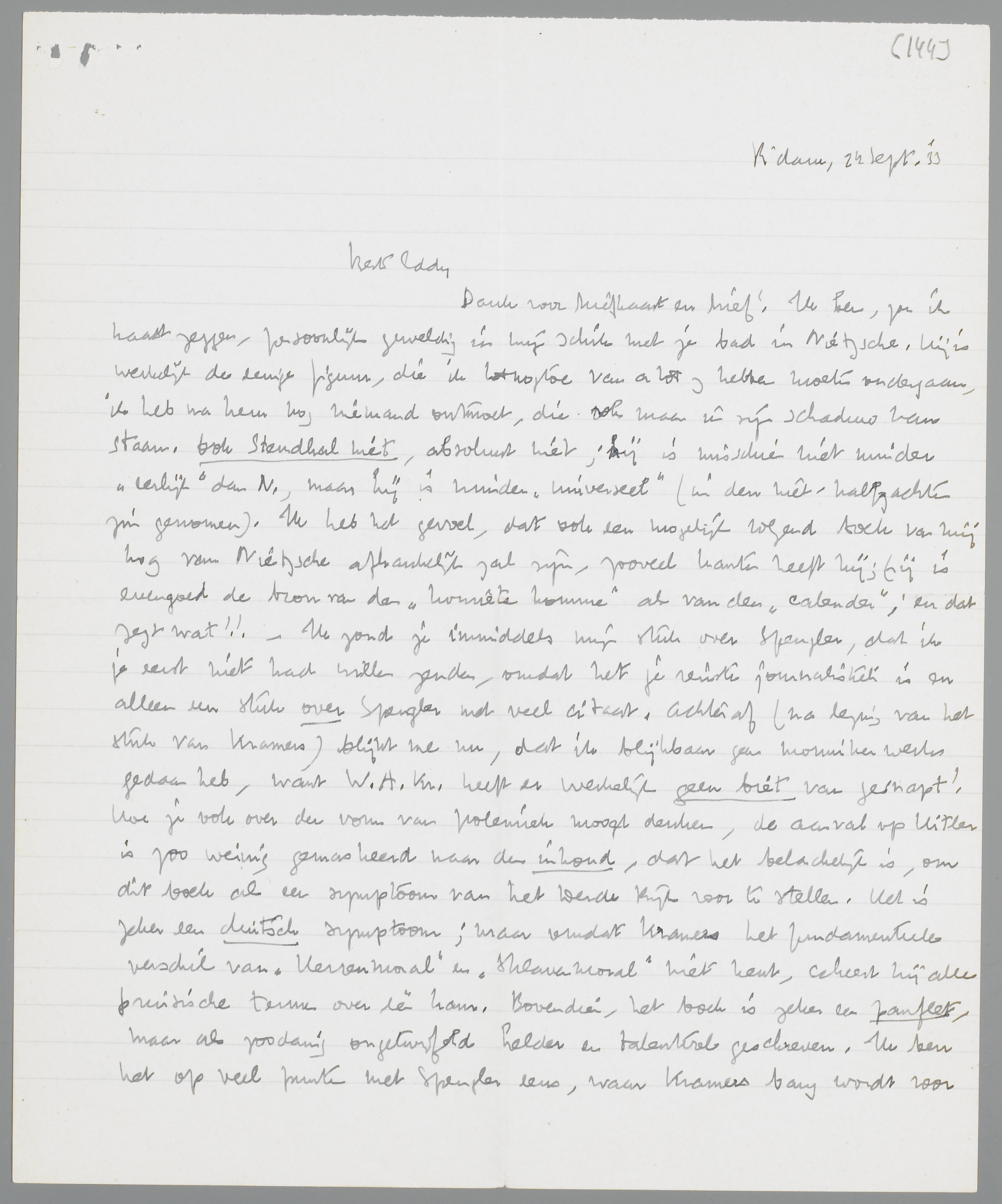 Dank voor briefkaart en brief! Ik ben, zou ik haast zeggen, persoonlijk geweldig in mijn schik met je bad in Nietzsche. Hij is werkelijk de eenige figuur, die ik totnogtoe van a tot z hebben moeten ondergaan, ik heb na hem nog niemand ontmoet, die ook maar in zijn schaduw kan staan. Ook Stendhal niet, absoluut niet; hij is misschien niet minder ‘eerlijk’ dan N., maar hij is minder ‘universeel’ (in den niet-halfzachten zin genomen). Ik heb het gevoel, dat ook een mogelijk volgend boek van mij nog van Nietzsche afhankelijk zal zijn, zooveel kanten heeft hij; hij is evengoed de bron van den ‘honnête homme’ als van den ‘calender’; en dat zegt wat!! - Ik zond je inmiddels mijn stuk over Spengler, dat ik je eerst niet had willen zenden, omdat het je reinste journalistiek is en alleen een stuk over Spengler met veel citaat. Achteraf (na lezing van het stuk van Kramers) blijkt me nu, dat ik blijkbaar geen monnikenwerk gedaan heb, want W.A. Kr. heeft er werkelijk geen biet van gesnapt! Hoe je ook over den vorm van polemiek moogt denken, de aanval op Hitler is zoo weinig gemaskeerd naar den inhoud, dat het belachelijk is, om dit boek als een symptoom van het Derde Rijk voor te stellen. Het is zeker een duitsch symptoom; maar omdat Kramers het fundamenteele verschil van ‘Herrenmoral’ en ‘Sklavenmoral’ niet kent, scheert hij alle pruisische termen over één kam. Bovendien, het boek is zeker een pamflet, maar als zoodanig ongetwijfeld helder en talentvol geschreven. Ik ben het op veel punten met Spengler eens, waar Kramers bang wordt voor de gevolgen en zijn slavencritiek inschakelt. Als ik dit vastgesteld heb, wil ik jou dadelijk toegeven, dat Spengler niet meer is dan de pruisische schoenpoetser van Nietzsche, die veel (veel meer dan ik vroeger dacht) van ‘meneer’ aan manieren heeft overgenomen.