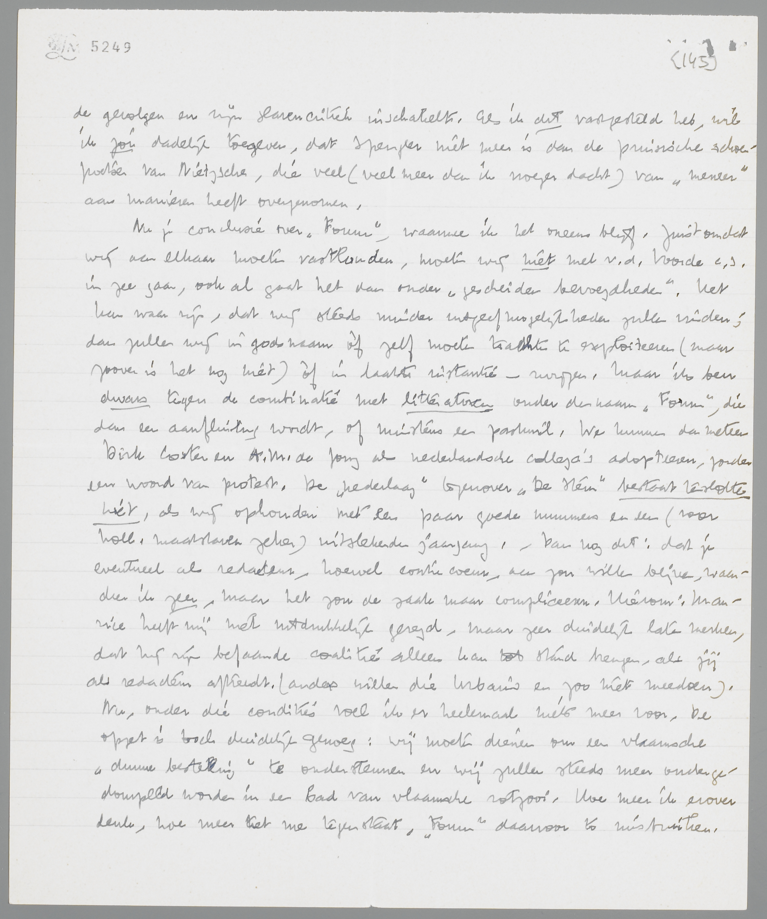 Nu je conclusie over Forum, waarmee ik het oneens blijf. Juist omdat wij aan elkaar moeten vasthouden, moeten wij niet met v.d. Voorde c.s. in zee gaan, ook al gaat het dan onder ‘gescheiden bevoegdheden’. Het kan waar zijn, dat wij steeds minder uitgeefmogelijkheden zullen vinden; dan zullen wij in godsnaam òf zelf moeten trachten te exploiteeren (maar zoover is het nog niet) òf in laatste instantie - zwijgen. Maar ik ben dwars tegen de combinatie met litteratoren onder den naam Forum, die dan een aanfluiting wordt, of minstens een paskwil. We kunnen dan meteen Dirk Coster en A.M. de Jong als nederlandsche collega's adopteeren, zonder een woord van protest. De ‘nederlaag’ tegenover De Stem bestaat tenslotte niet, als wij ophouden met een paar goede nummers en een (voor holl. maatstaven zeker) uitstekenden jaargang. - Dan nog dit: dat je eventueel als redacteur, hoewel contre coeur, aan zou willen blijven, waardeer ik zeer, maar het zou de zaak maar compliceeren. Hierom: Maurice heeft mij niet uitdrukkelijk gezegd, maar zeer duidelijk laten merken, dat hij zijn befaamde coalitie alleen kan tot stand brengen, als jij als redacteur aftreedt. (anders willen die Urbains en zoo niet meedoen). Nu, onder die condities voel ik er heelemaal niets meer voor. De opzet is toch duidelijk genoeg: wij moeten dienen om een vlaamsche ‘dunne bestelling’ te ondersteunen en wij zullen steeds meer ondergedompeld worden in een bad van vlaamsche rotzooi. Hoe meer ik erover denk, hoe meer het me tegenstaat, Forum daarvoor te misbruiken. Laten die lieden zelf wat opzetten, waarin wij dan eventueel als eerzame medewerkers kunnen schrijven! - En je ‘voorwoord’ in no. 1 van jaargang III zou al dadelijk de belachelijkheid van de combinatie aanwijzen! - Greshoff en Marsman antwoordden mij beide, dat wij onder de conditie van Maurice moeten opdoeken. En ik geloof, dat dat het beste is. Het zal mij aan het hart gaan, maar aan deze twee jaar zal ik tenminste een onvertroebelde, zuivere herinnering behouden. - Ik wacht je omgaand antwoord. Deel je nu mijn conclusies, dan schrijf ik Maurice, dat ik het verdom en ga deze week nog naar Zijlstra. (pro forma zal ik hem nog een voortzetting op de oude basis met b.v. redactie Vestdijk, Marsman, mij voorstellen met zeer verlaagde honoraria en geen secretariaat, maar hij zal dat wel niet mogelijk achten). Ik zal dan tevens de mogelijkheid van een dikker laatste no. bespreken, zoodat b.v. jouw Liaisons daarin komen, met andere goede stukken, zoodat we daverend kunnen verscheiden. (In ieder geval hoop ik die Liaisons in het laatste no. te drukken!) -