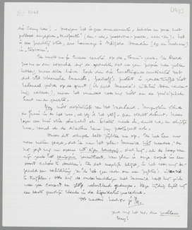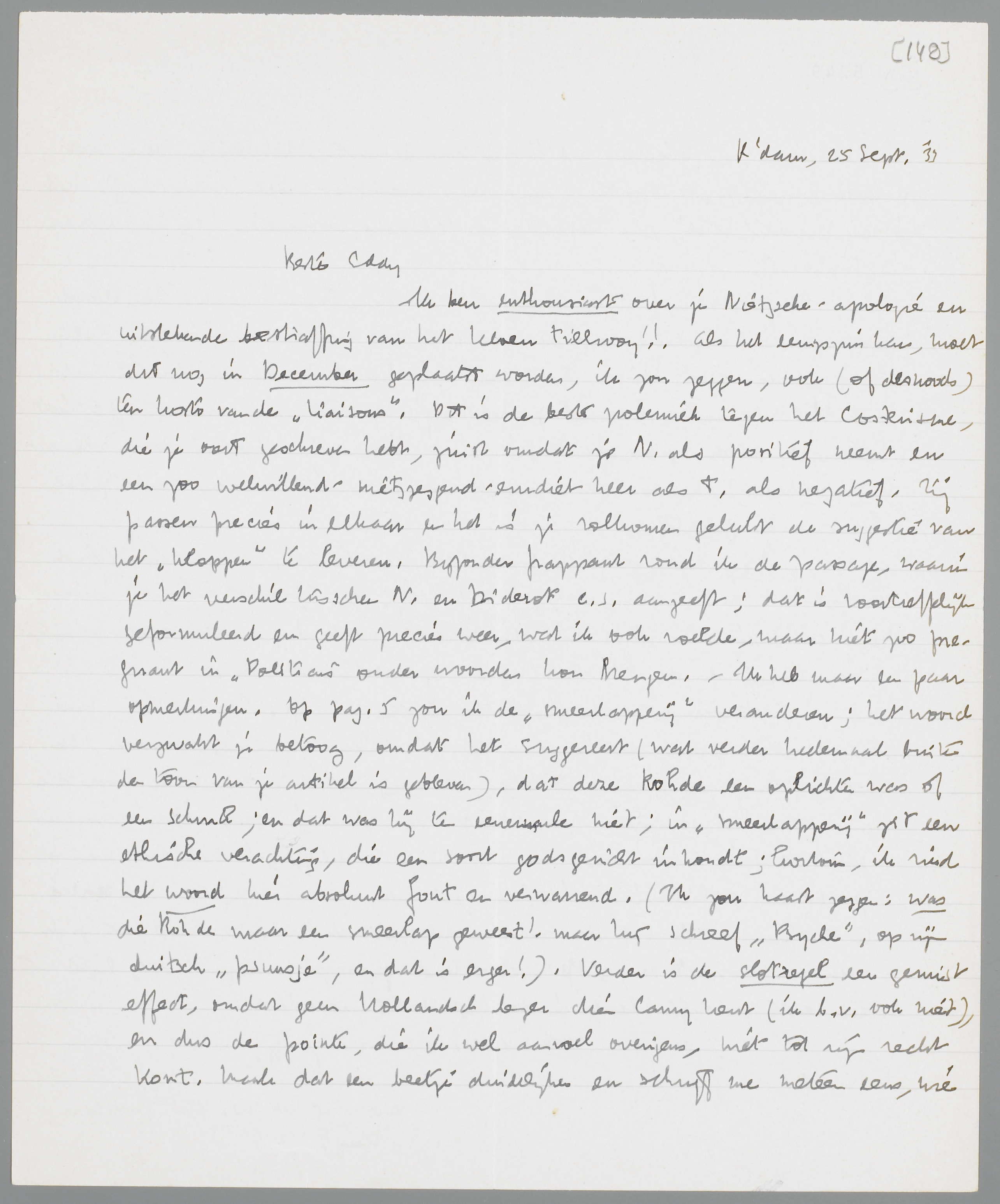 Ik ben enthousiast over je Nietzsche-apologie en uitstekende bestraffing van het kloen Tielrooy!! Als het eenigszins kan, moet dit nog in December geplaatst worden, ik zou zeggen, ook (of desnoods) ten koste van de Liaisons. Dit is de beste polemiek tegen het Costerisme, die je ooit geschreven hebt, juist omdat je N. als positief neemt en een zoo welwillend-nietszeggend-erudiet heer als T. als negatief. Zij passen precies in elkaar en het is je volkomen gelukt de suggestie van het ‘kloppen’ te leveren. Bijzonder frappant vond ik de passage, waarin je het verschil tusschen N. en Diderot c.s. aangeeft; dat is voortreffelijk geformuleerd en geeft precies weer, wat ik ook voelde, maar niet zoo pregnant in Politicus onder woorden kon brengen. - Ik heb maar een paar opmerkingen. Op pag. 5 zou ik de ‘smeerlapperij’ veranderen; het woord verzwakt je betoog, omdat het suggereert (wat verder heelemaal buiten de toon van je artikel is gebleven), dat deze Rohde een oplichter was of een schurk; en dat was hij ten eenenmale niet; in ‘smeerlapperij’ zit een ethische verachting, die een soort godsgericht inhoudt; kortom, ik vind het woord hier absoluut fout en verwarrend. (Ik zou haast zeggen: was die Rohde maar een smeerlap geweest! maar hij schreef Psyche, op zijn duitsch ‘psuusje’, en dat is erger!). Verder is de slotregel een gemist effect, omdat geen Hollandsch lezer dien Camy kent (ik b.v. ook niet), en dus de pointe, die ik wel aanvoel overigens, niet tot zijn recht komt. Maak dat een beetje duidelijker en schrijf me meteen eens, wie die Camy was! - Overigens heb ik geen amendementen, behalve een paar met potlood aangegeven ‘taalfouten’ (dan - als, processus-proces, naar - en). Het is een prachtig stuk, een hommage à Nietzsche bovendien (en aan Malraux) in ‘topvorm’.