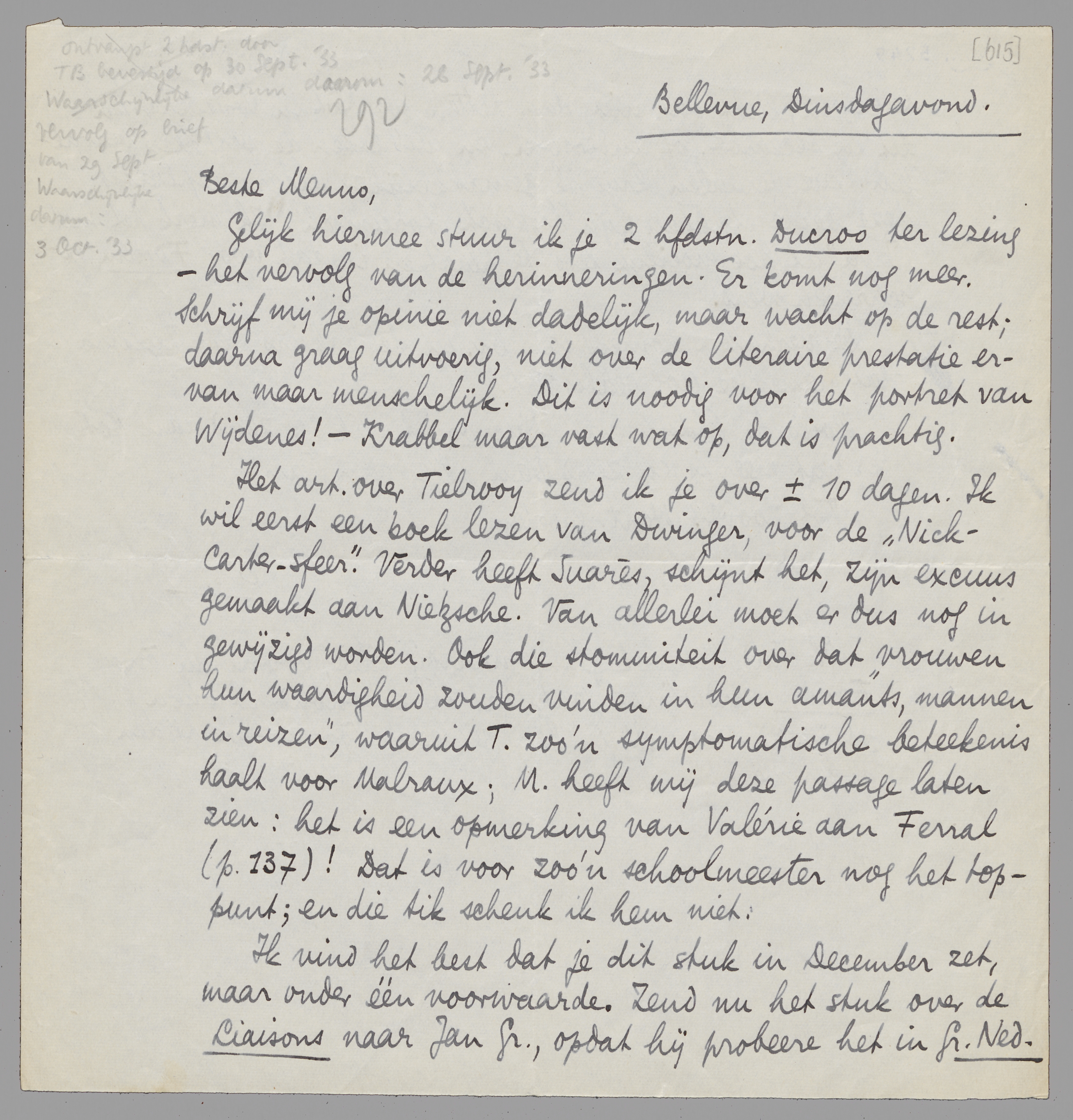 Het art. over Tielrooy zend ik je over ± 10 dagen. Ik wil eerst een boek lezen van Dwinger, voor de ‘Nick-Carter-sfeer’. Verder heeft Suarès, schijnt het, zijn excuus gemaakt aan Nietzsche. Van allerlei moet er dus nog in gewijzigd worden. Ook die stommiteit over dat ‘vrouwen hun waardigheid zouden vinden in hun amants, mannen in reizen’, waaruit T. zoo'n symptomatische beteekenis haalt voor Malraux; M. heeft mij deze passage laten zien: het is een opmerking van Valérie aan Ferral (p. 137)! Dat is voor zoo'n schoolmeester nog het toppunt; en die tik schenk ik hem niet.