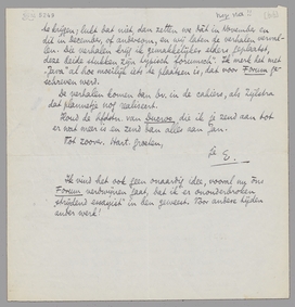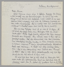Gelijk hiermee stuur ik je 2 hfdstn. Ducroo ter lezing - het vervolg van de herinneringen. Er komt nog meer. Schrijf mij je opinie niet dadelijk, maar wacht op de rest; daarna graag uitvoerig, niet over de literaire prestatie ervan maar menschelijk. Dit is noodig voor het portret van Wijdenes! - Krabbel maar vast wat op, dat is prachtig.