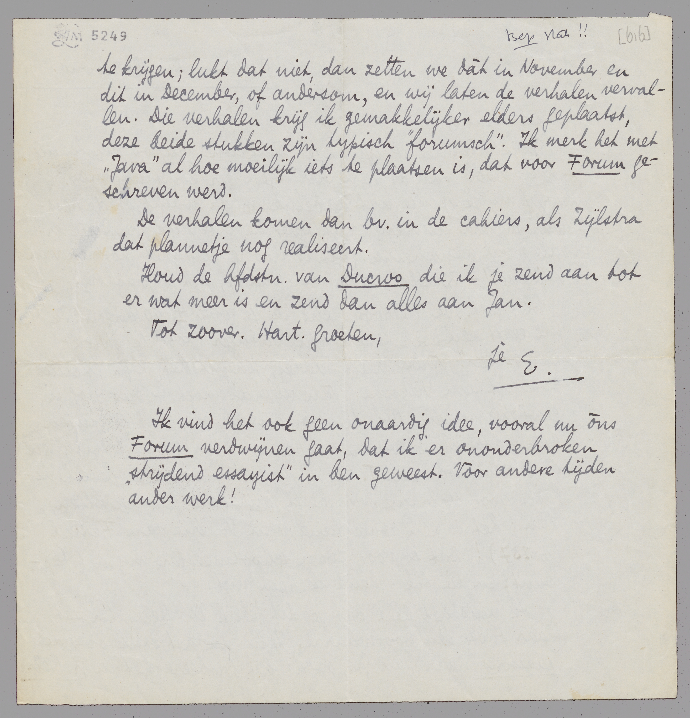 Ik vind het best dat je dit stuk in December zet, maar onder één voorwaarde. Zend nu het stuk over de Liaisons naar Jan Gr., opdat hij probeere het in Gr. Ned. te krijgen; lukt dat niet, dan zetten we dàt in November en dit in December, of andersom, en wij laten de verhalen vervallen. Die verhalen krijg ik gemakkelijker elders geplaatst, deze beide stukken zijn typisch ‘forumsch’. Ik merk het met ‘Java’ al hoe moeilijk iets te plaatsen is, dat voor Forum geschreven werd.