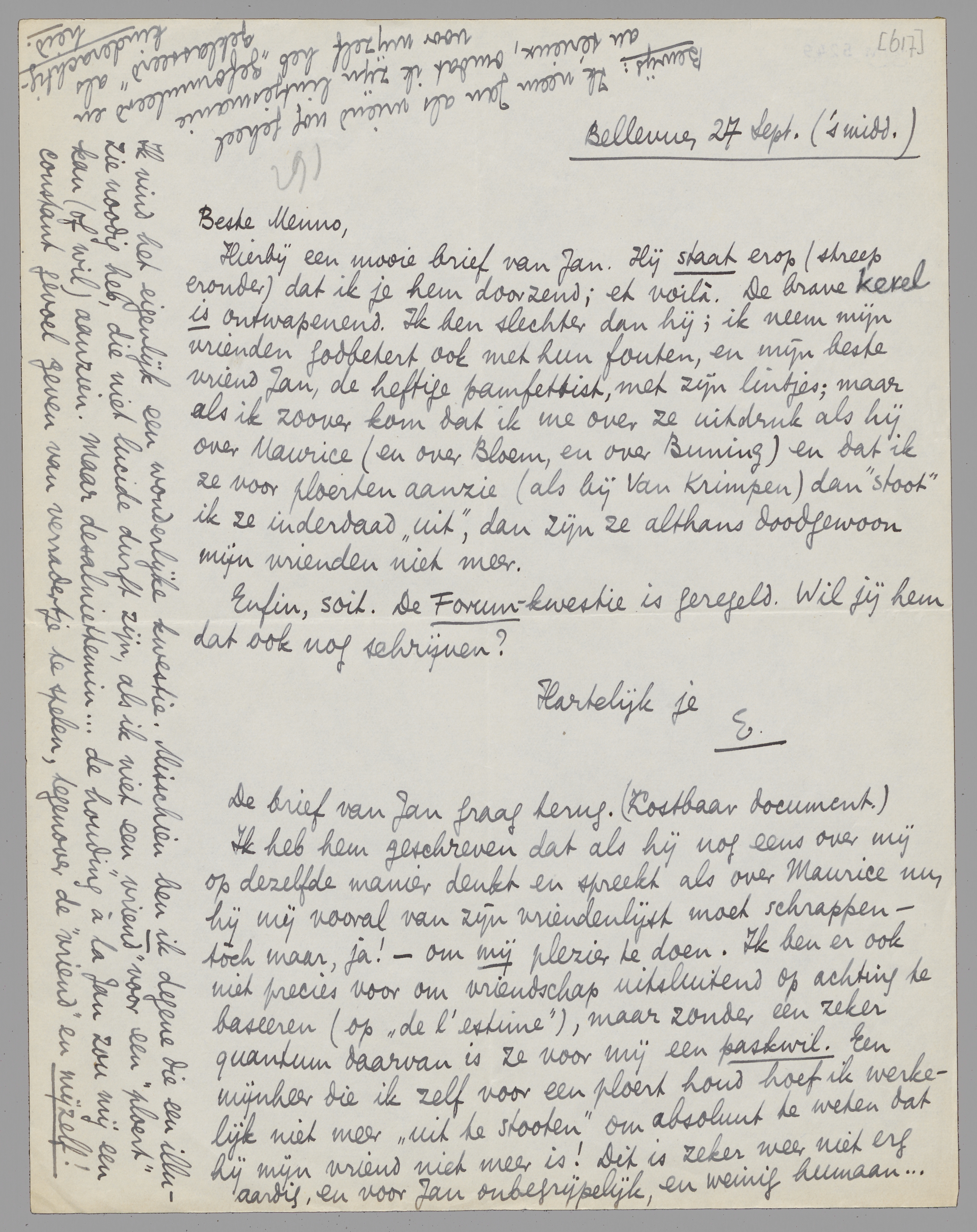 Hierbij een mooie brief van Jan. Hij staat erop (streep eronder) dat ik je hem doorzend; et voilà. De brave kerel is ontwapenend. Ik ben slechter dan hij; ik neem mijn vrienden godbetert ook met hun fouten, en mijn beste vriend Jan, de heftige pamflettist, met zijn lintjes; maar als ik zoover kom dat ik me over ze uitdruk als hij over Maurice (en over Bloem, en over Buning) en dat ik ze voor ploerten aanzie (als bij Van Krimpen) dan ‘stoot’ ik ze inderdaad ‘uit’, dan zijn ze althans doodgewoon mijn vrienden niet meer.