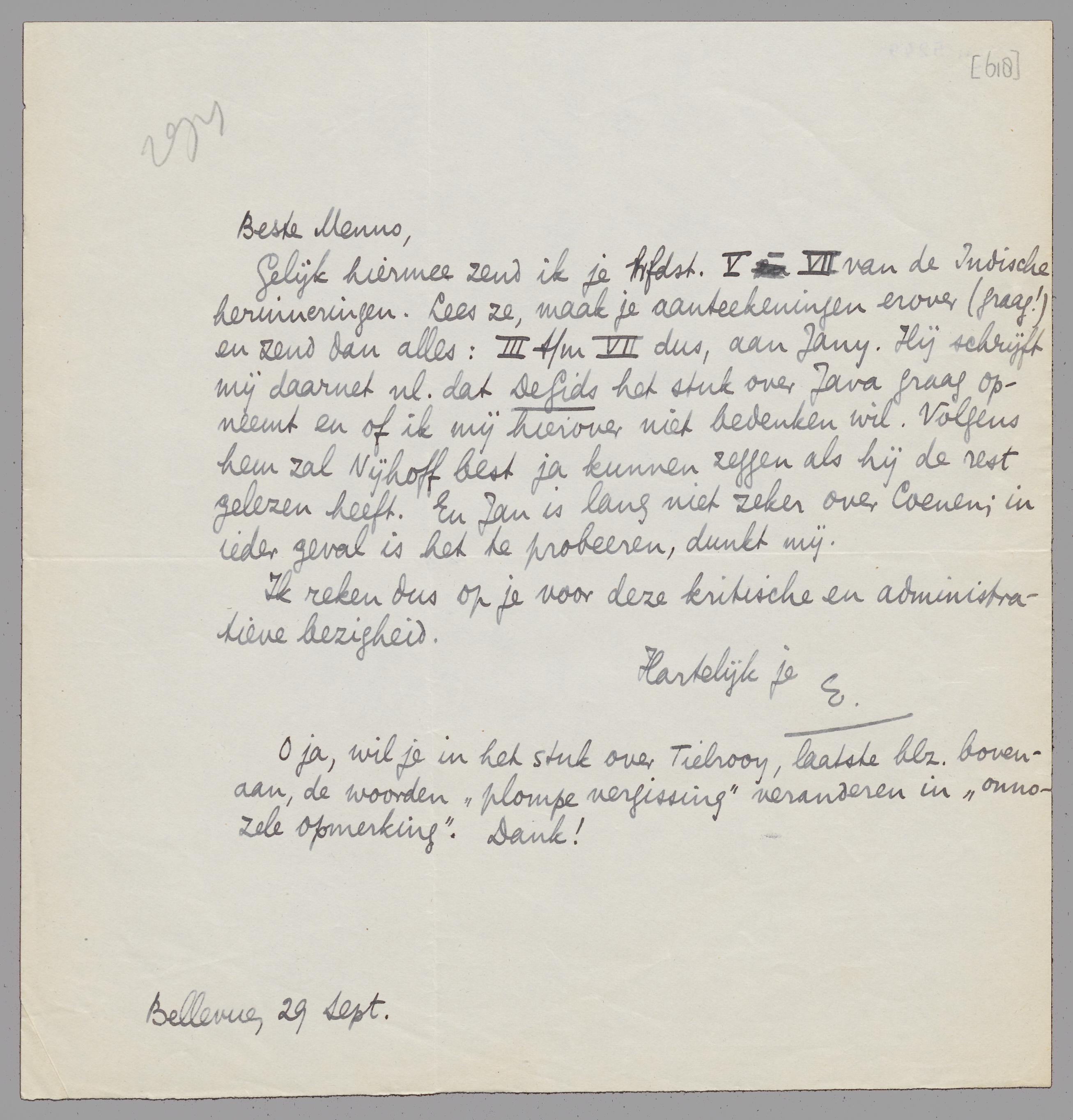 Gelijk hiermee zend ik je hfdst. V-VII van de Indische herinneringen. Lees ze, maak je aanteekeningen erover (graag!) en zend dan alles: III t/m VII dus, aan Jany. Hij schrijft mij daarnet nl. dat De Gids het stuk over Java graag opneemt en of ik mij hierover niet bedenken wil. Volgens hem zal Nijhoff best ja kunnen zeggen als hij de rest gelezen heeft. En Jan is lang niet zeker over Coenen; in ieder geval is het te probeeren, dunkt mij.