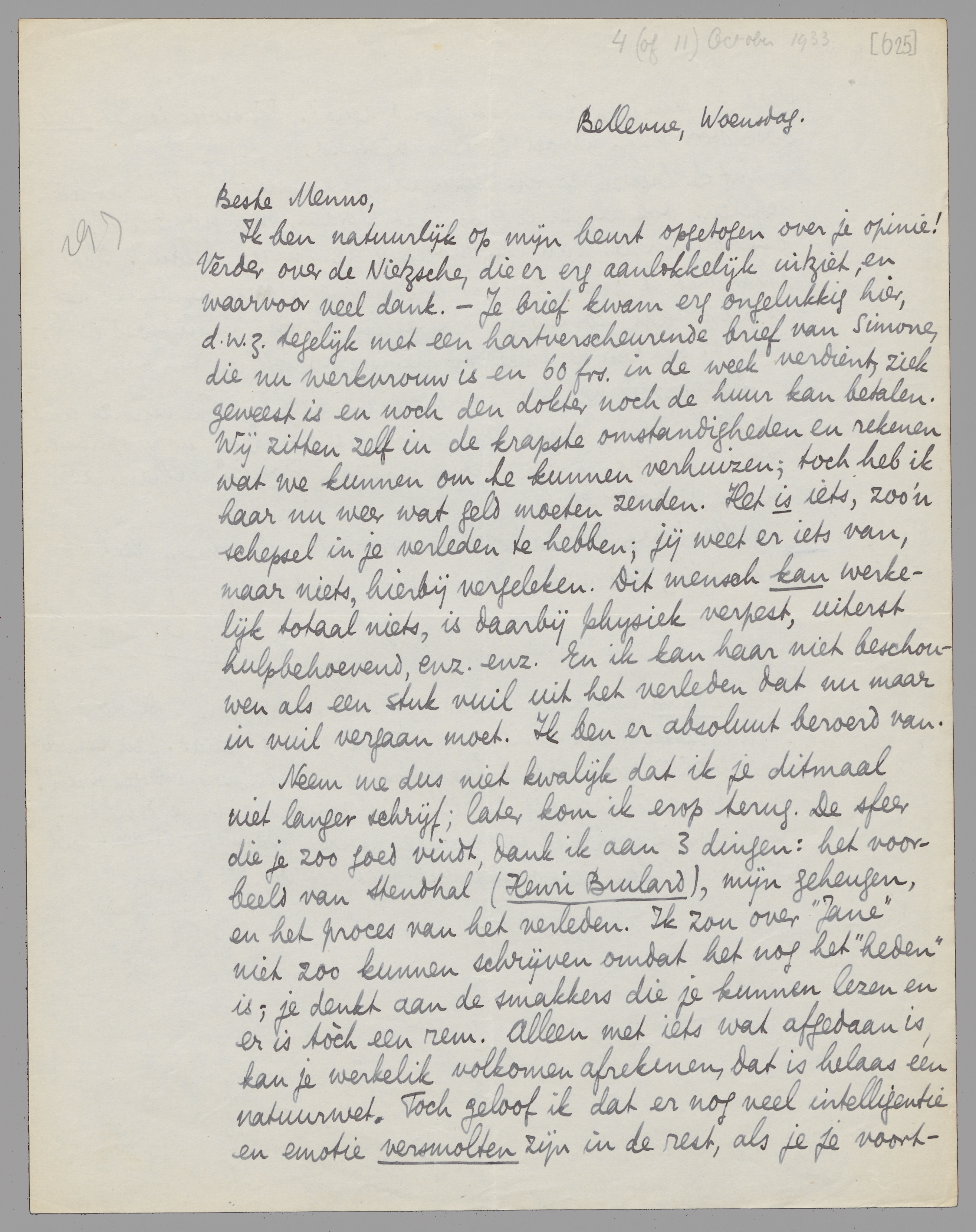 Ik ben natuurlijk op mijn beurt opgetogen over je opinie! Verder over de Nietzsche, die er erg aanlokkelijk uitziet, en waarvoor veel dank. - Je brief kwam erg ongelukkig hier. d.w.z. tegelijk met een hartverscheurende brief van Simone, die nu werkvrouw is en 60 frs. in de week verdient, ziek geweest is en noch den dokter noch de huur kan betalen. Wij zitten zelf in de krapste omstandigheden en rekenen wat we kunnen om te kunnen verhuizen; toch heb ik haar nu weer wat geld moeten zenden. Het is iets, zoo’n schepsel in je verleden te hebben, jij weet er iets van, maar niets, vergeleken hierbij. Dit mensch kan werkelijk totaal niets, is daarbij physiek verpest, uiterst hulpbehoevend, enz. enz. En ik kan haar niet beschouwen als een stuk vuil uit het verleden dat nu maar in vuil vergaan moet. Ik ben er absoluut beroerd van.