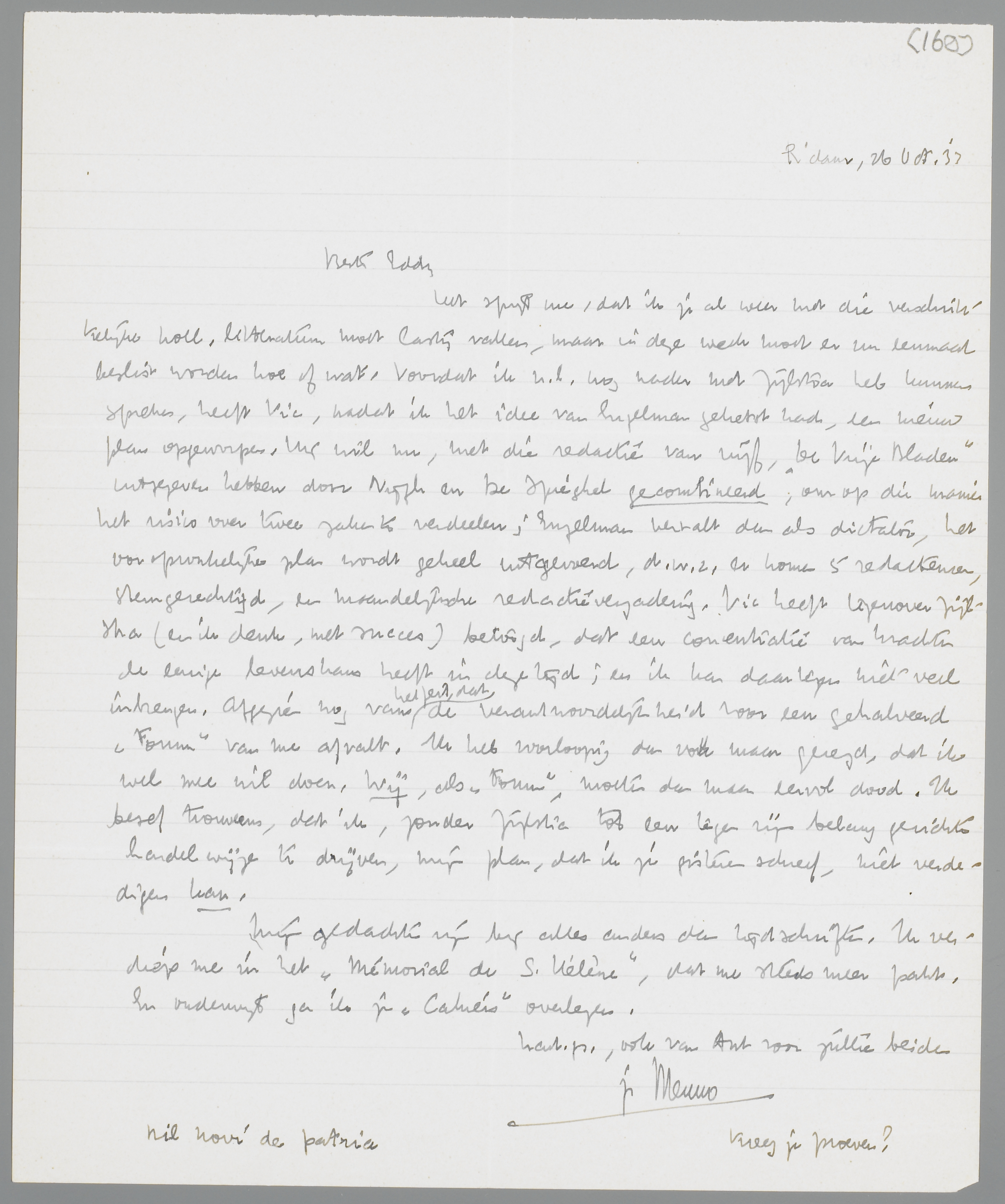 Het spijt me, dat ik je al weer met die verschrikkelijke holl. litteratuur moet lastig vallen, maar in deze week moet er nu eenmaal beslist worden hoe of wat. Voordat ik n.l. nog nader met Zijlstra heb kunnen spreken, heeft Vic, nadat ik het idee van Engelman geketst had, een nieuw plan opgeworpen. Hij wil nu, met die redactie, van vijf, De Vrije Bladen uitgegeven hebben door Nijgh en De Spieghel gecombineerd, om op die manier het risico over twee zaken te verdeelen; Engelman vervalt dan als dictator, het oorspronkelijke plan wordt geheel uitgevoerd, d.w.z. er komen 5 redacteuren, stemgerechtigd, en maandelijksche redactievergadering. Vic heeft tegenover Zijlstra (en ik denk, met succes) betoogd, dat een concentratie van krachten de eenige levenskans heeft in deze tijd; en ik kan daartegen niet veel inbrengen. Afgezien nog van het feit, dat de verantwoordelijkheid voor een gehalveerd Forum van me afvalt. Ik heb voorloopig dan ook maar gezegd, dat ik wel mee wil doen. Wij, als Forum, moeten dan maar eervol dood. Ik besef trouwens, dat ik, zonder Zijlstra tot een tegen zijn belang gerichte handelwijze te drijven, mijn plan, dat ik je gisteren schreef, niet verdedigen kan.