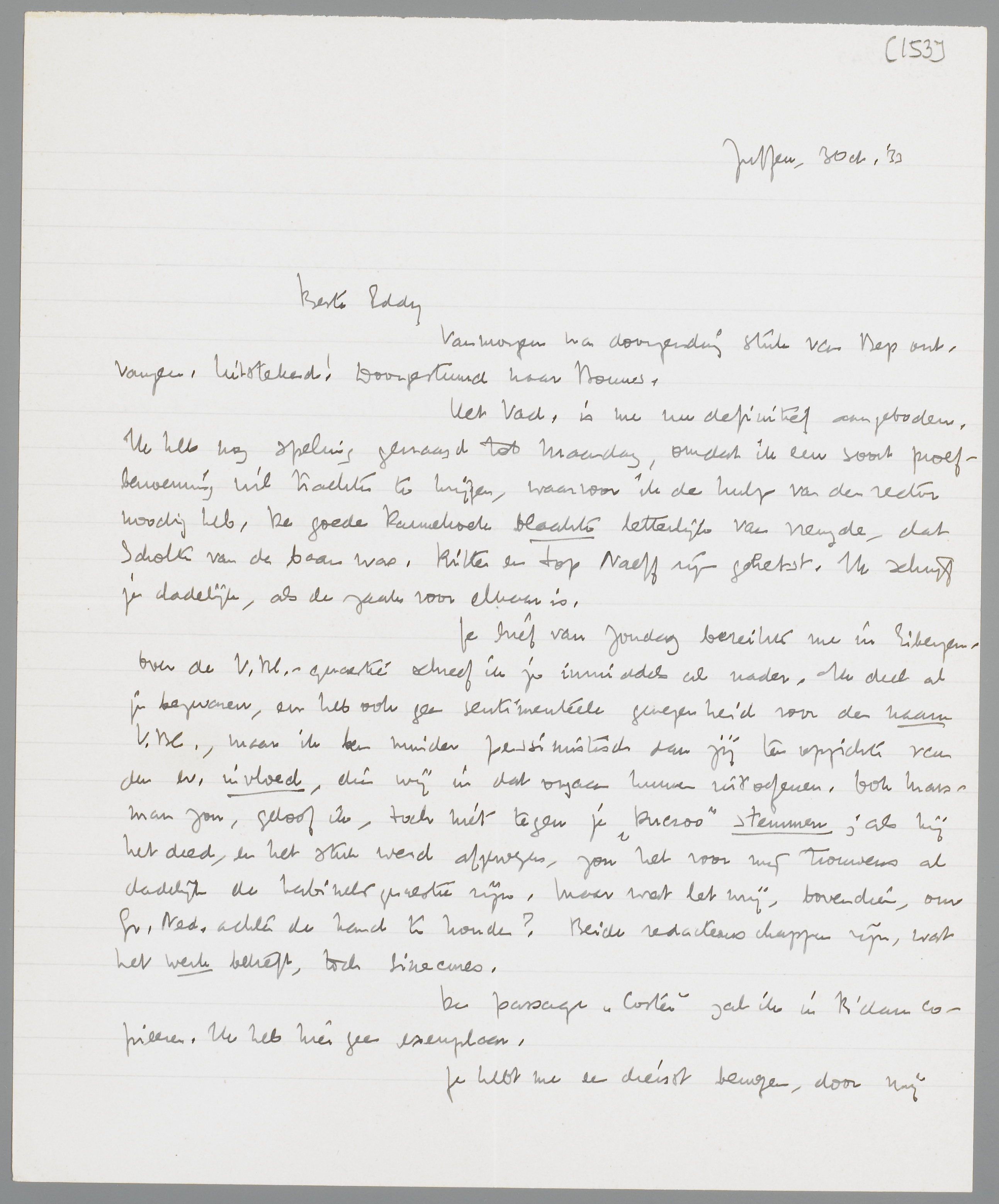 Je brief van Zondag bereikte me in Eibergen. Over de V. Bl.-quaestie schreef ik je inmiddels al nader. Ik deel al je bezwaren, en heb ook geen sentimenteele genegenheid voor de naam V. Bl., maar ik ben minder pessimistisch dan jij ten opzichte van den ev. invloed, dien wij in dat orgaan kunnen uitoefenen. Ook Marsman zou, geloof ik, toch niet tegen je Ducroo stemmen; als hij het deed, en het stuk werd afgewezen, zou het voor mij trouwens al dadelijk de kabinetsquaestie zijn. Maar wat let mij, bovendien, om Gr. Ned. achter de hand te houden? Beide redacteurschappen zijn, wat het werk betreft, toch sinecures.