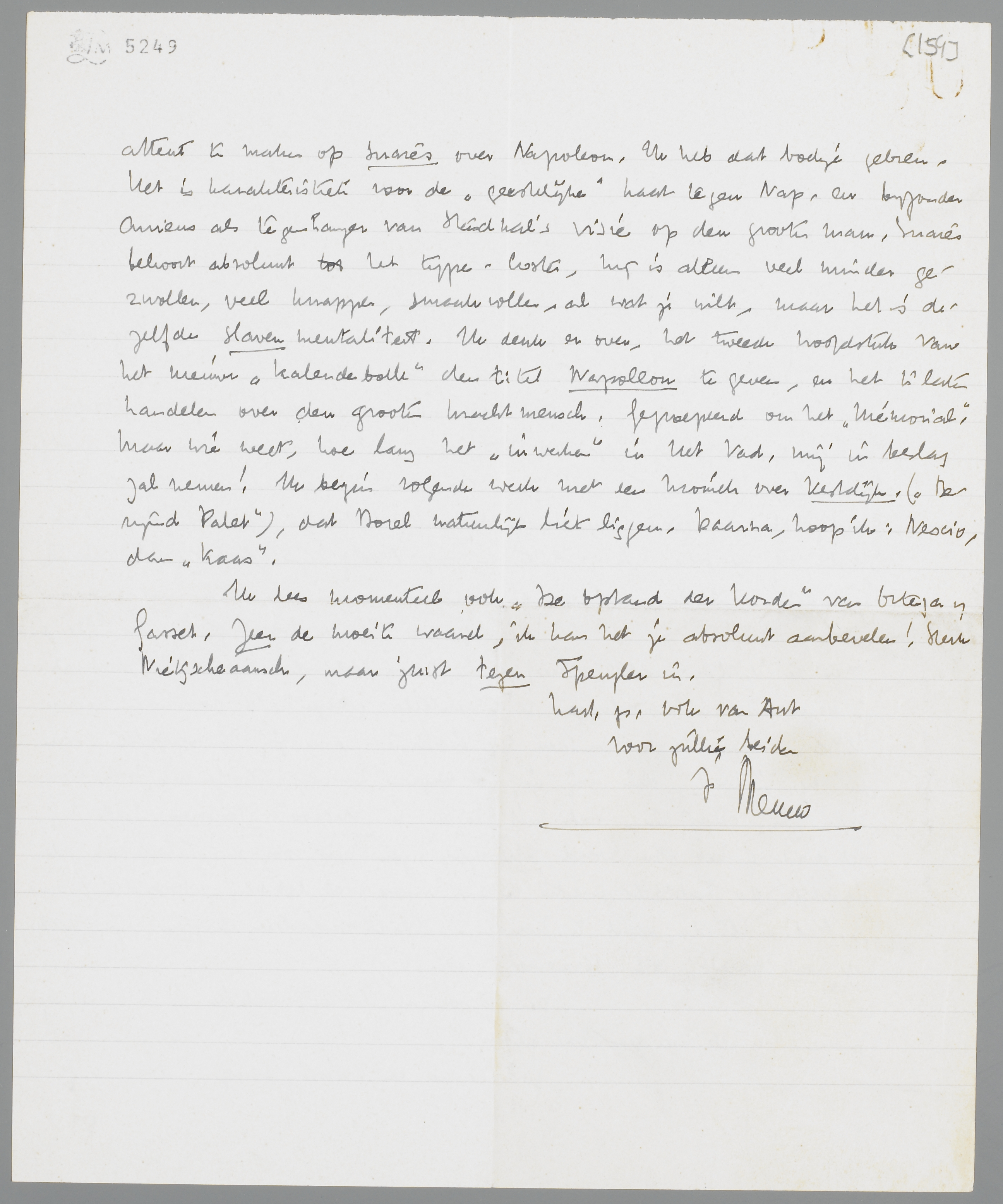 Je hebt me een dienst bewezen, door mij attent te maken op Suarès over Napoleon. Ik heb dat boekje gelezen. Het is karakteristiek voor de ‘geestelijke’ haat tegen Nap. en bijzonder curieus als tegenhanger van Stendhal's visie op den grooten man. Suarès behoort absoluut tot het type-Coster, hij is alleen veel minder gezwollen, veel knapper, smaakvoller, al wat je wilt, maar het is dezelfde slaven mentaliteit. Ik denk erover, het tweede hoofdstuk van het nieuwe ‘kalenderboek’ den titel Napoleon te geven, en het te laten handelen over den grooten krachtmensch. Gegroepeerd om het Mémorial. Maar wie weet, hoe lang het ‘inwerken’ in Het Vad. mij in beslag zal nemen! Ik begin volgende week met een kroniek over Vestdijk. (Berijmd Palet), dat Borel natuurlijk liet liggen. Daarna, hoop ik: Nescio, dan Kaas.